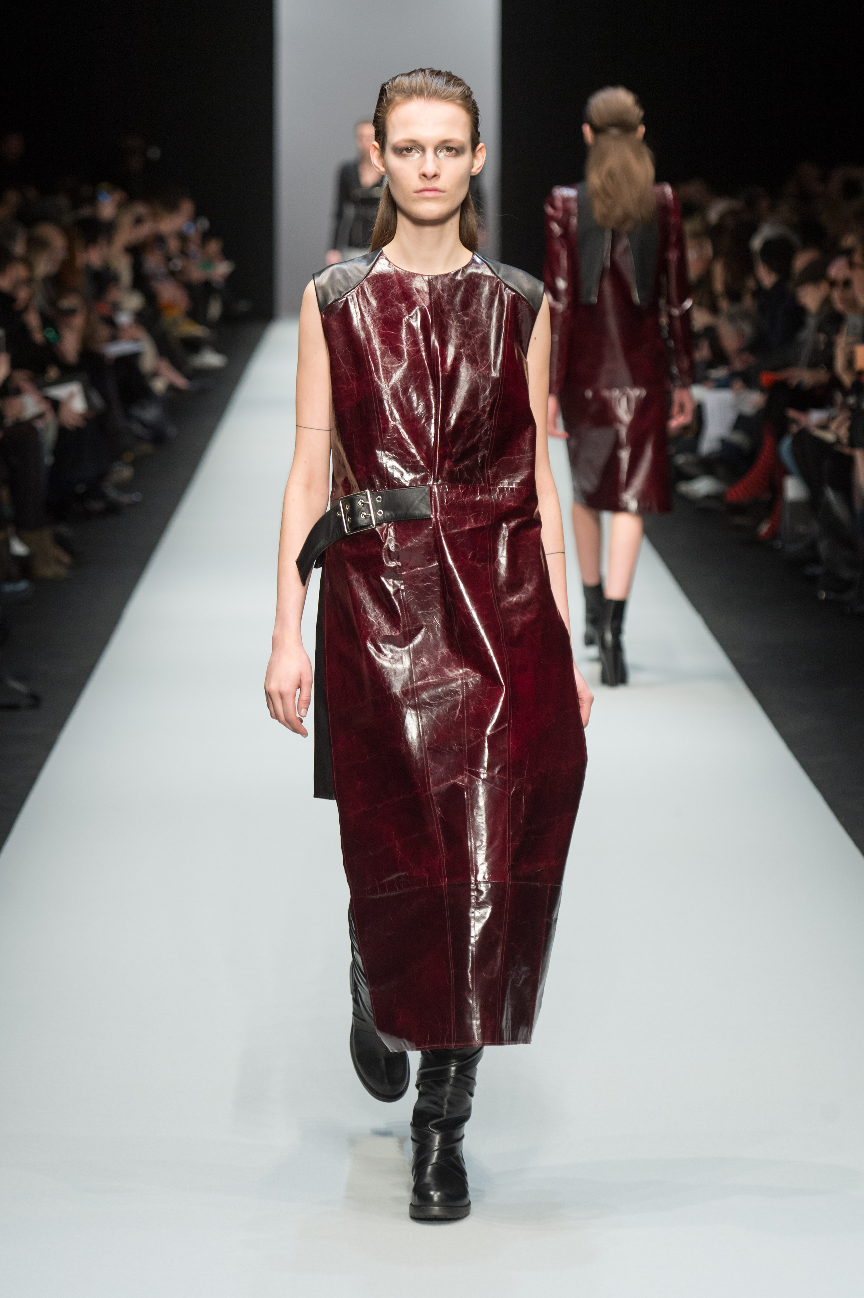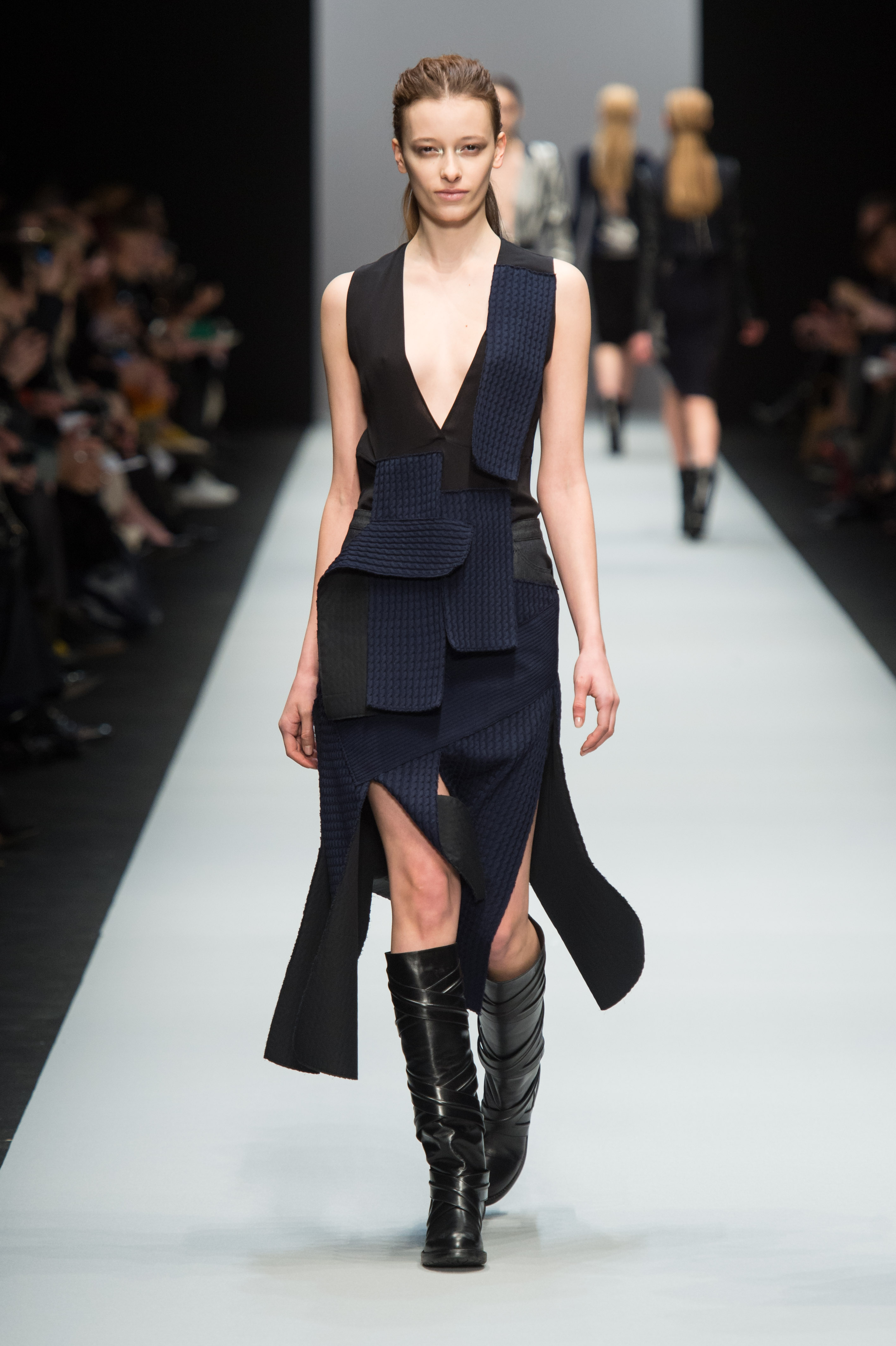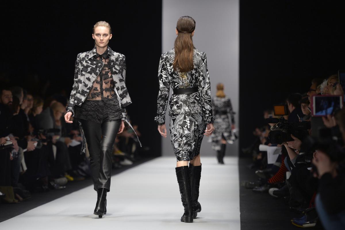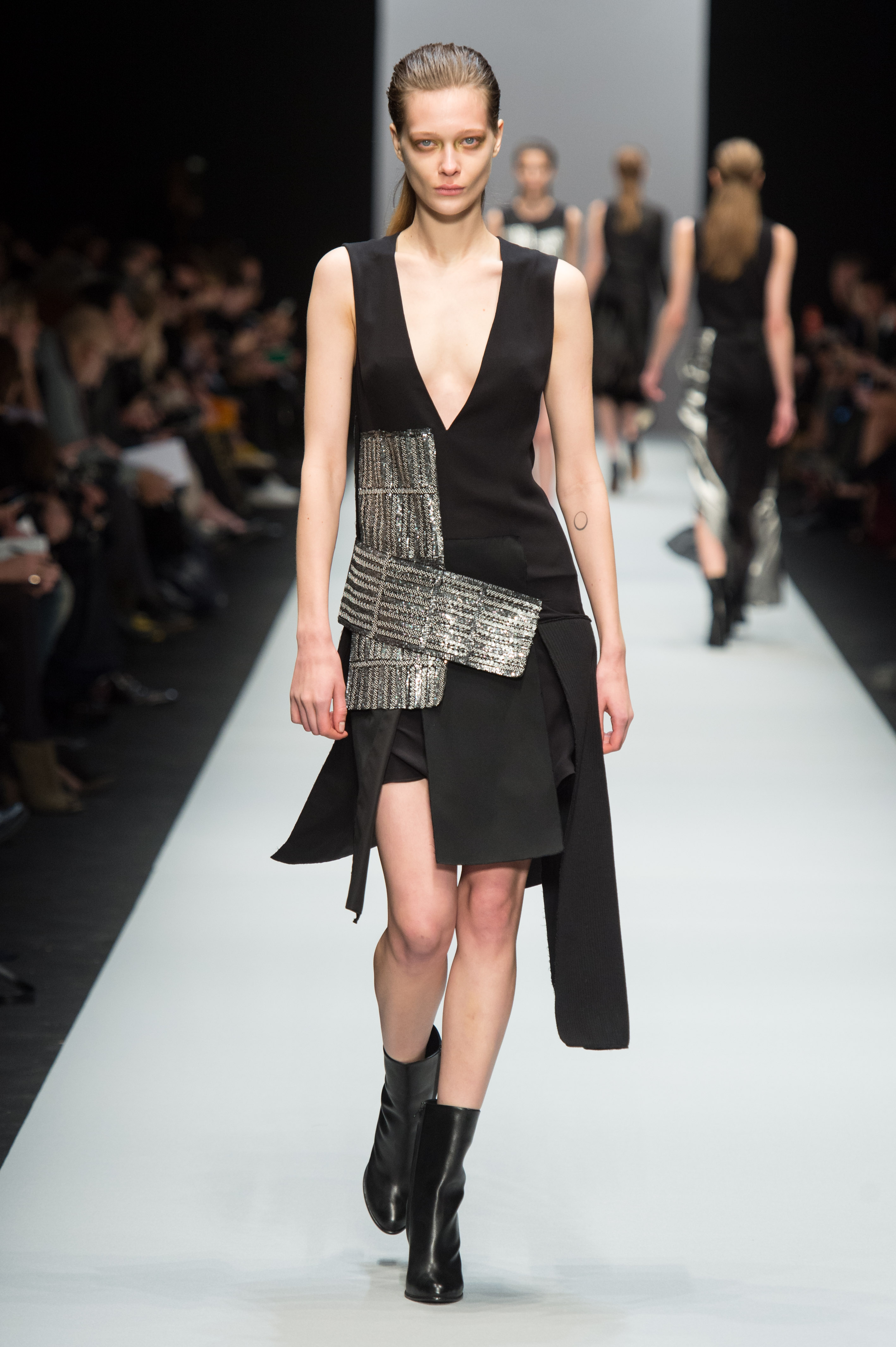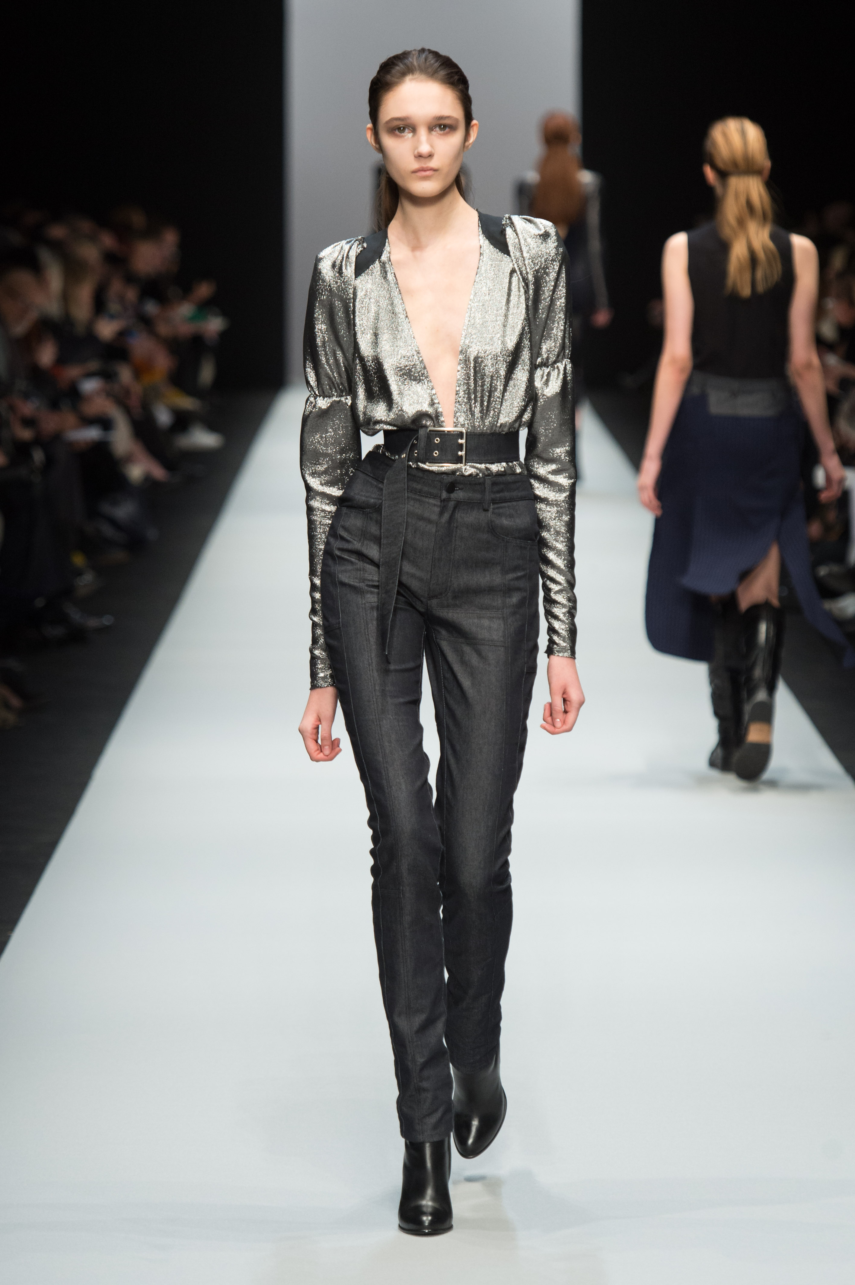 La collection tente également d’allier les classiques androgynes et silhouettes voluptueuses : des vestes imprimées dites Biker, et des trenchcoats déconstruits sont contrastés de pièces de mailles cintrées portées à même peau, ou de jupes en brocart dévorées. Une partie de la collection est même inspirée du film de Peter Greenaway : « The Pillow Book », un drame prenant place au Japon, qui dépeint la vie tumultueuse de la fille d’un calligraphe.
