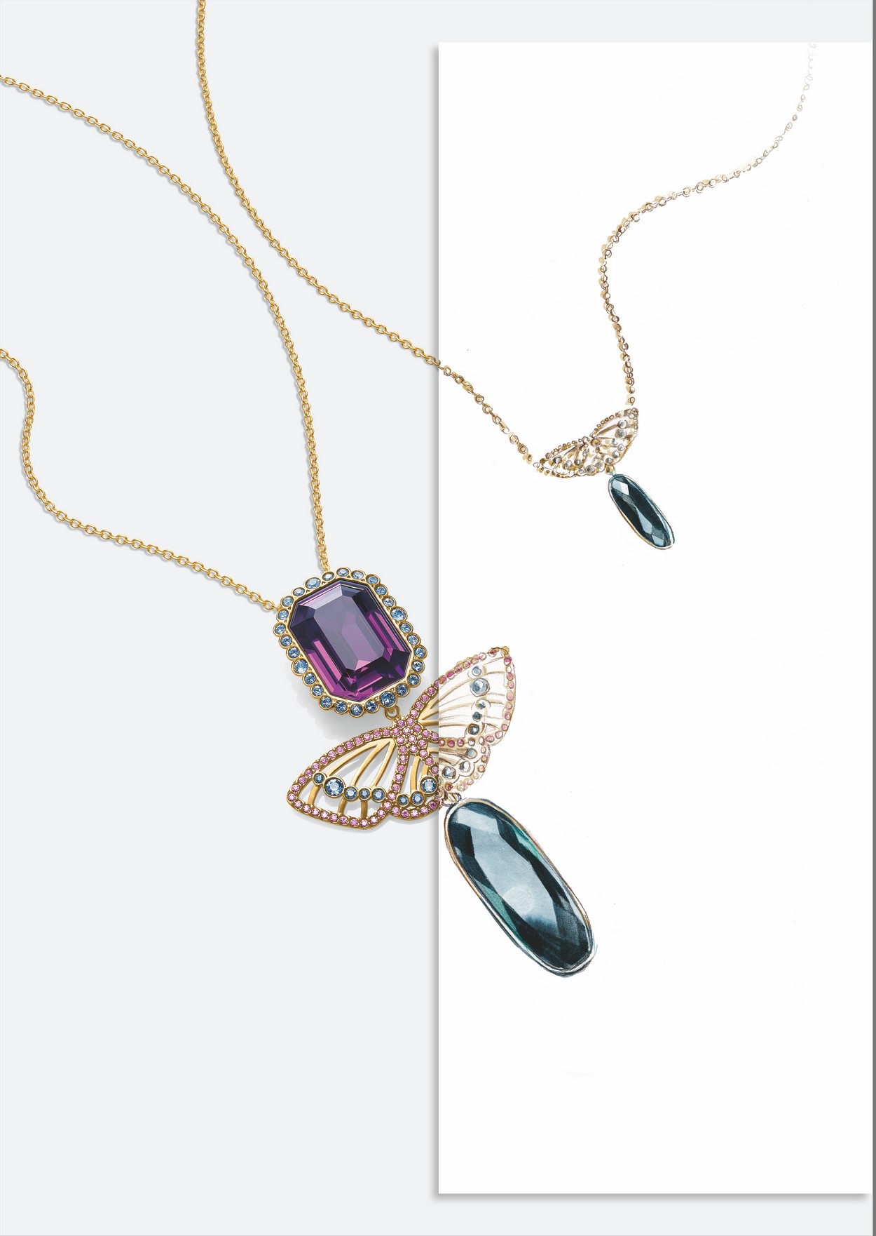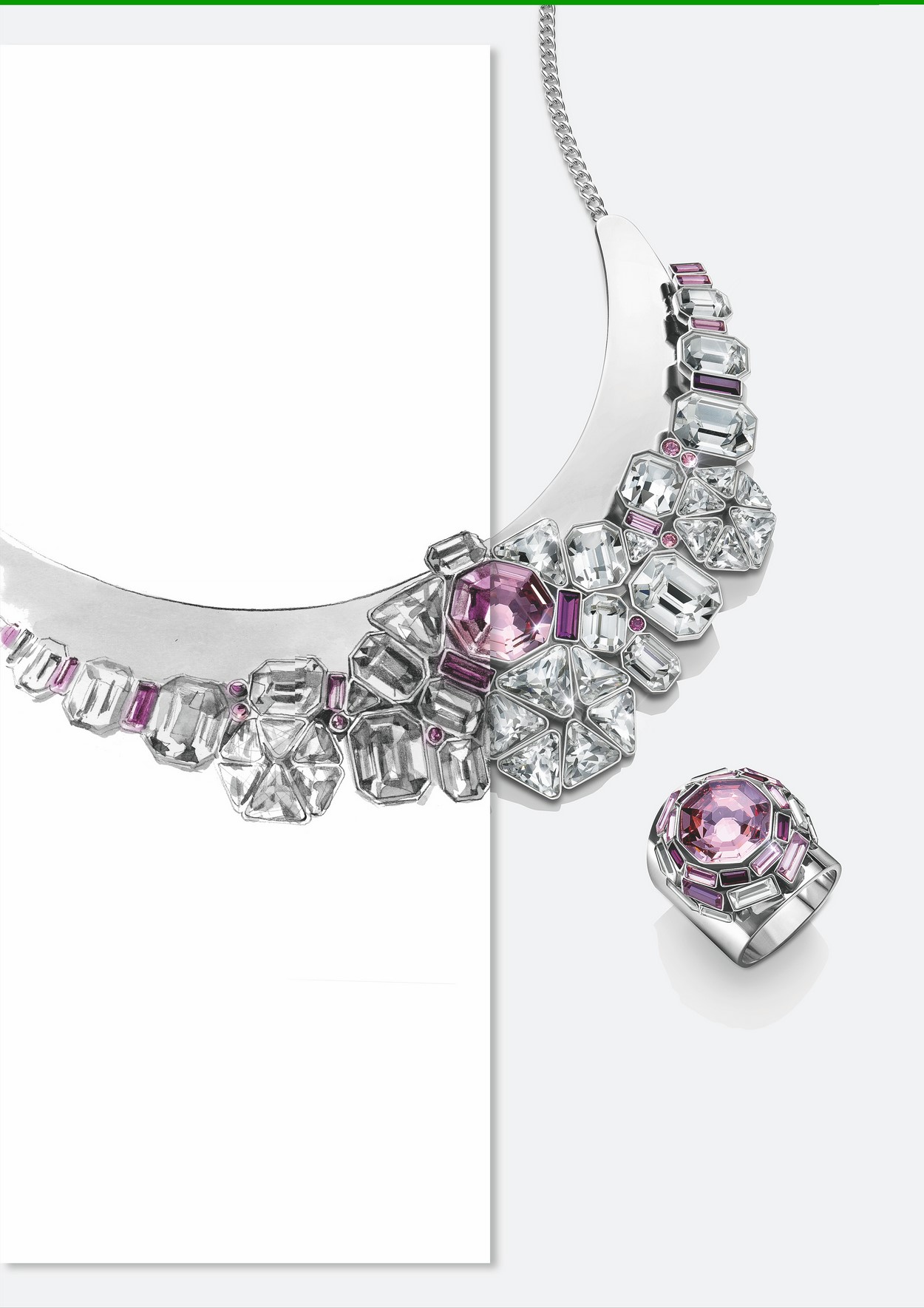 Dans un tout autre registre, les jardins des manoirs anglais s’affirment comme la seconde source d’inspiration de la collection. Velours dévoré, motifs de tapisseries anciennes, et découpes dentelées sont interprétés dans une palette déclinant subtilement les tons violine, mauve et prune. Illustration avec l’imposant collier « Dramatic ». Ornemental et sophistiqué, « Dramatic » présente un jeu de texture et de broderie qui lui confère richesse et raffinement, le tout avec une légèreté surprenante grâce à sa base en microfibre. Dans une palette sombre de noirs, gris et violets empruntés aux fleurs fanées de la saison, les maxi médaillons en cristal facetté sont entourés de cristaux sertis à la main selon la technique exclusive du Pointiage®. Le collier et la bague « Diana » jouent le mélange de matière avec une base en métal qui laisse la part belle à une accumulation de cristaux aux tons roses, dans un esprit graphique et contemporain. Après l’influence des fleurs, les insectes trouvent quant à eux leur représentation avec les pendentifs « Daphné ». Ces derniers mêlent le classicisme des coloris, avec des cristaux dont les teintes font écho à celles des pierres précieuses, et des lignes qui privilégient l’abstraction, avec des ailes de papillon filigranées. Portés séparément, ces pendentifs sont délicats et féminins. Accumulés à des hauteurs différentes, ils créent une silhouette tendance et stylée.