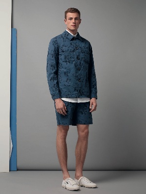 Eden Park propose une silhouette saharienne et bermuda, imprimé hibiscus chez l’homme. Un motif ultra facile à porter en total look ou dépareillé, que ce soit à la ville comme à la mer. La finesse des détails, mêlée au bleu profond de l’ensemble donne une impression de relief : boutonnière, manches resserrées et bords francs.
