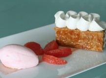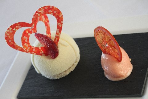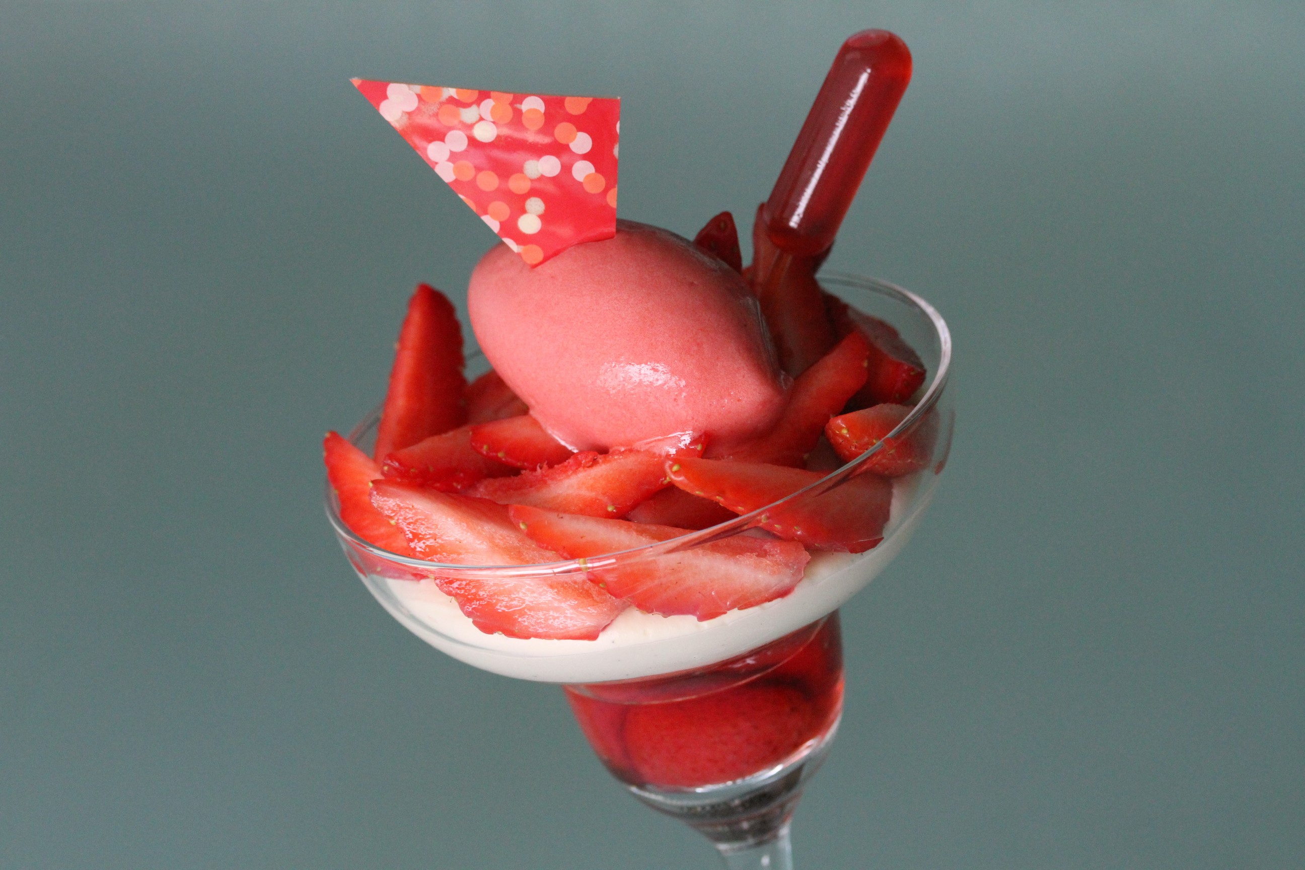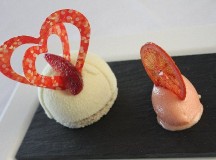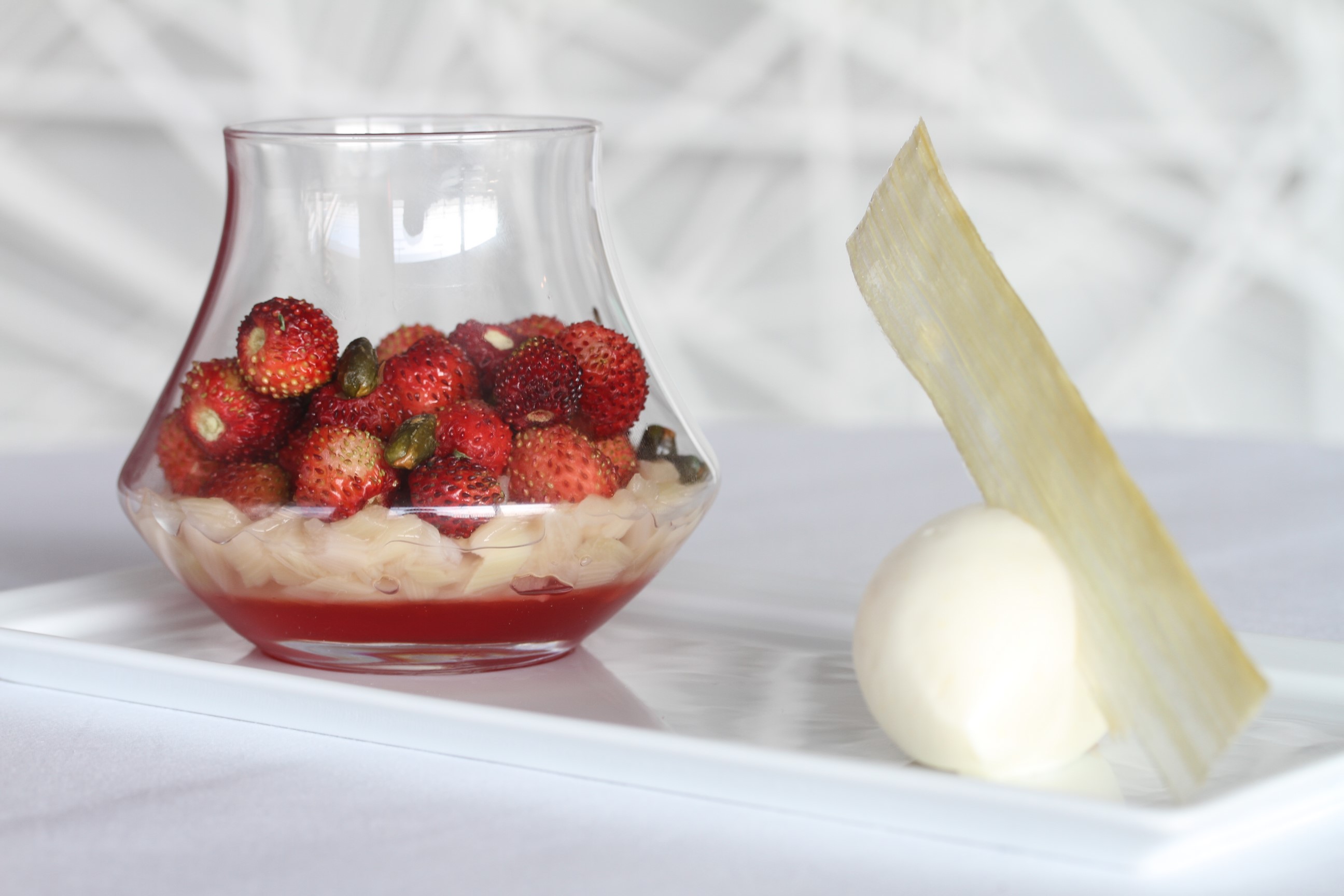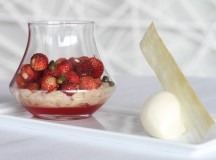 La rhubarbe confite sur un lit de gelée de Tagada®, les fraises des bois de Malaga et sorbet au lait de chèvre de M. Fabre