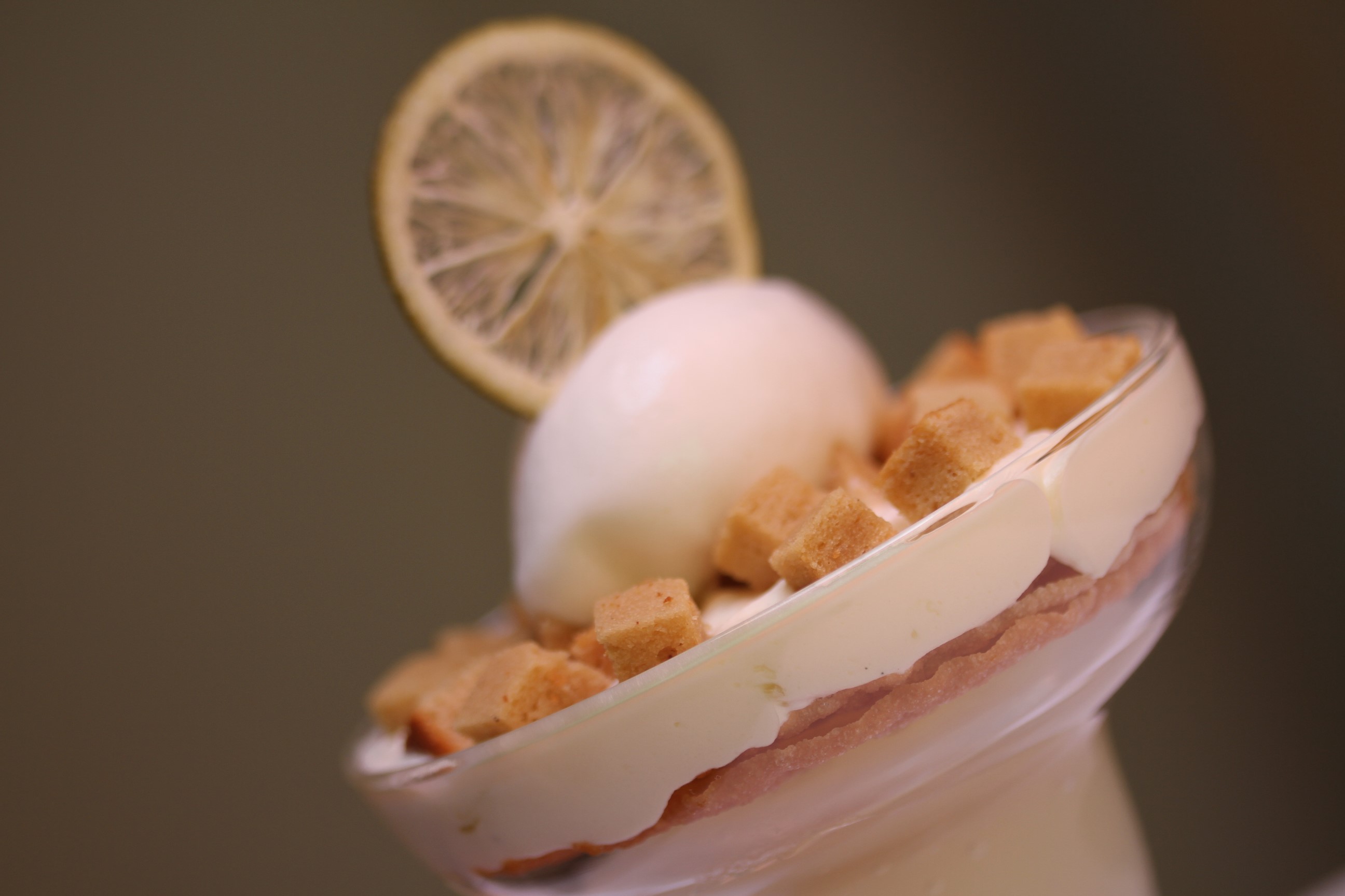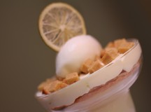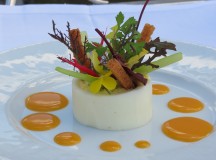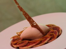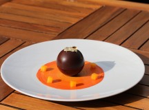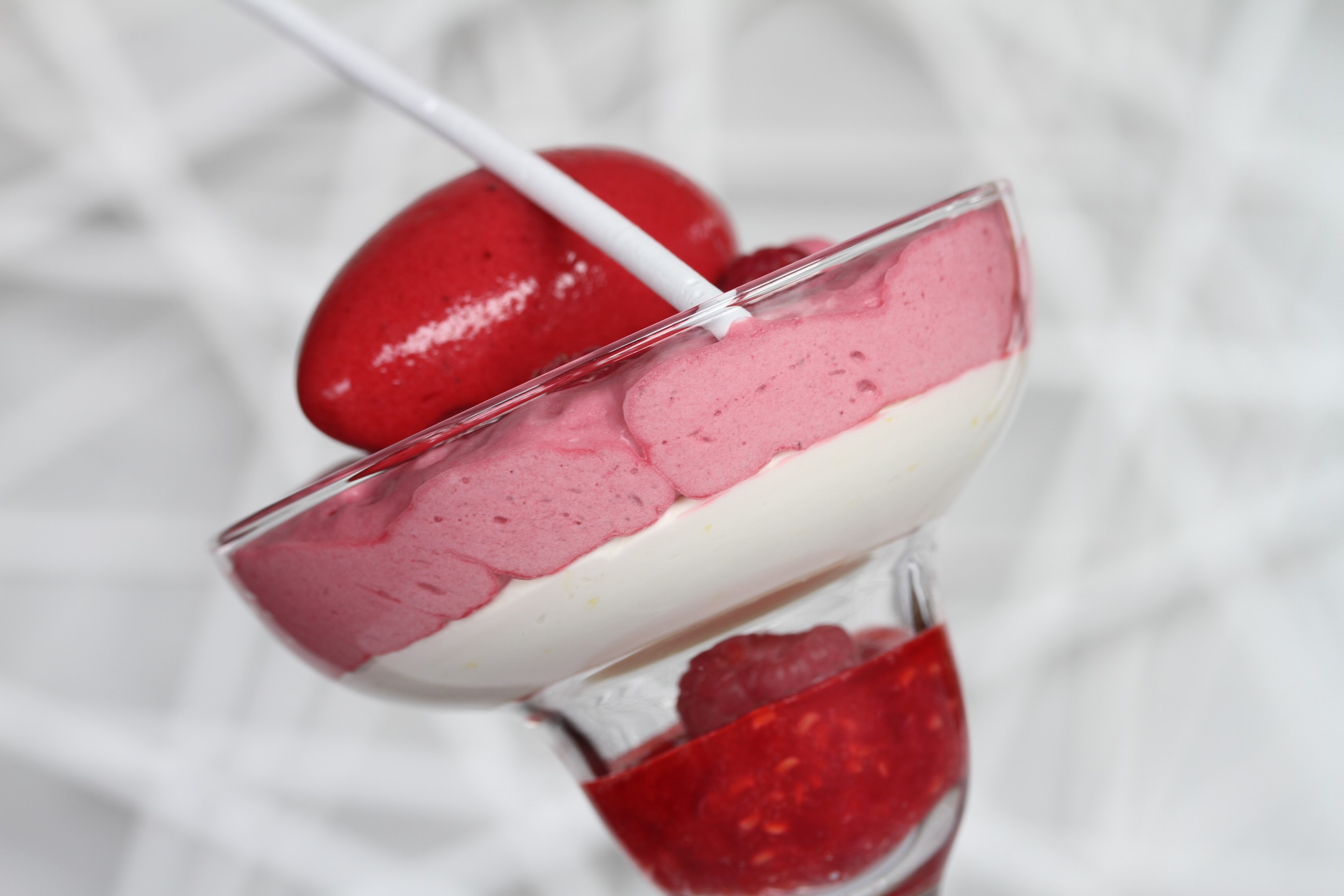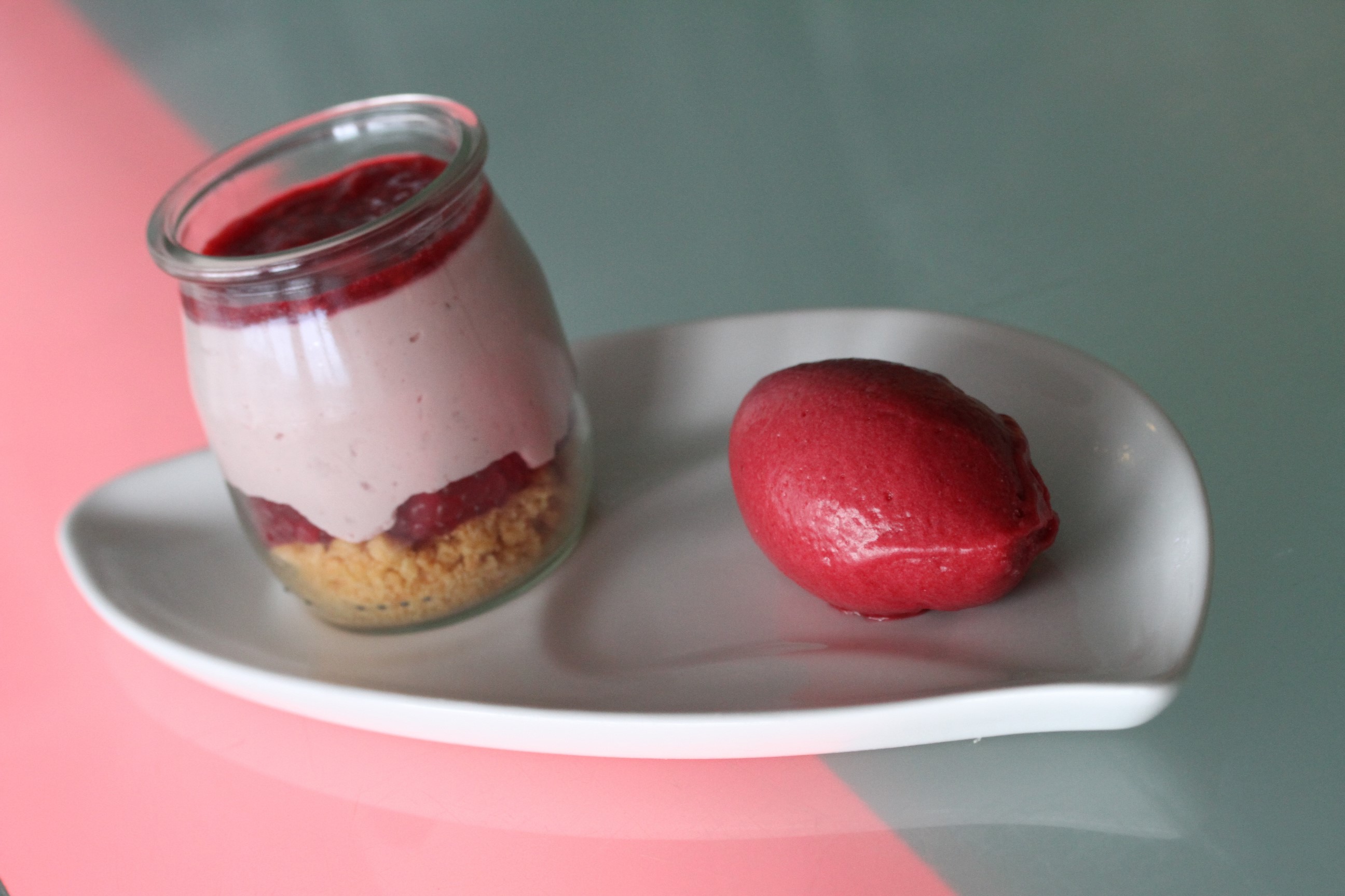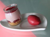 ……………… La framboise Tulameen et ganache de chocolat blanc, citron au poivre du Népal, nuage de fromage blanc