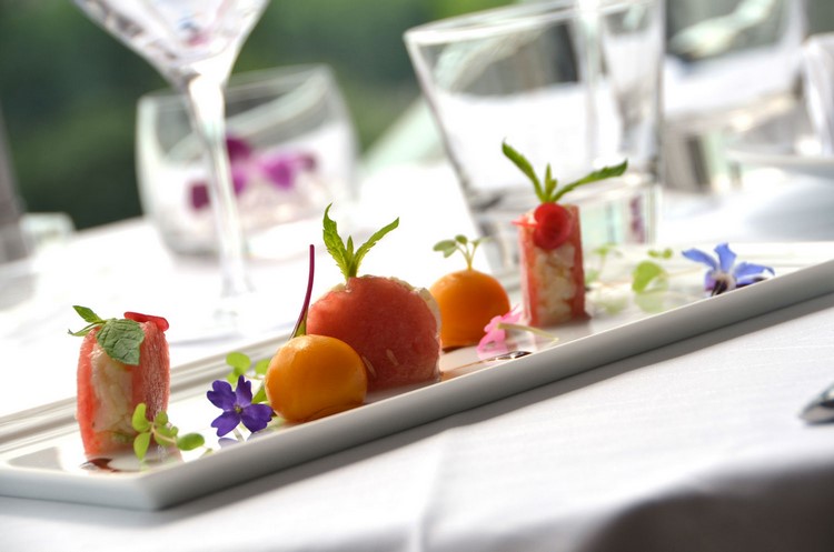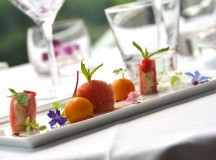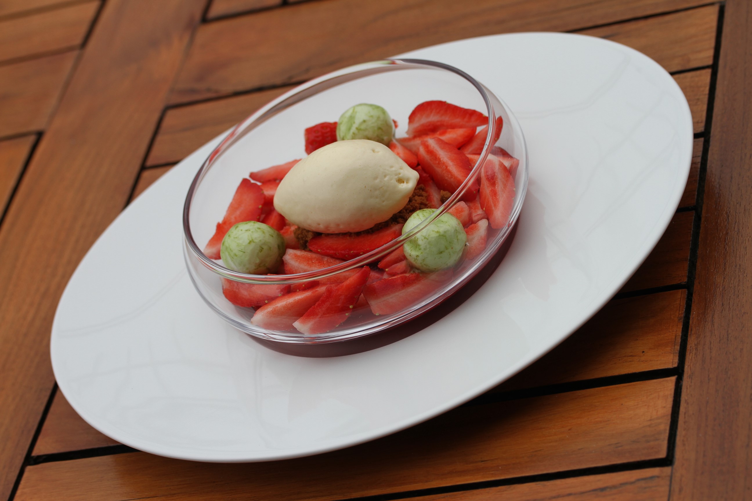 La Gariguette rafraichie aux billes de citron vert et son gaspacho de fruits rouges, glace à l’huile d’olive de Provence