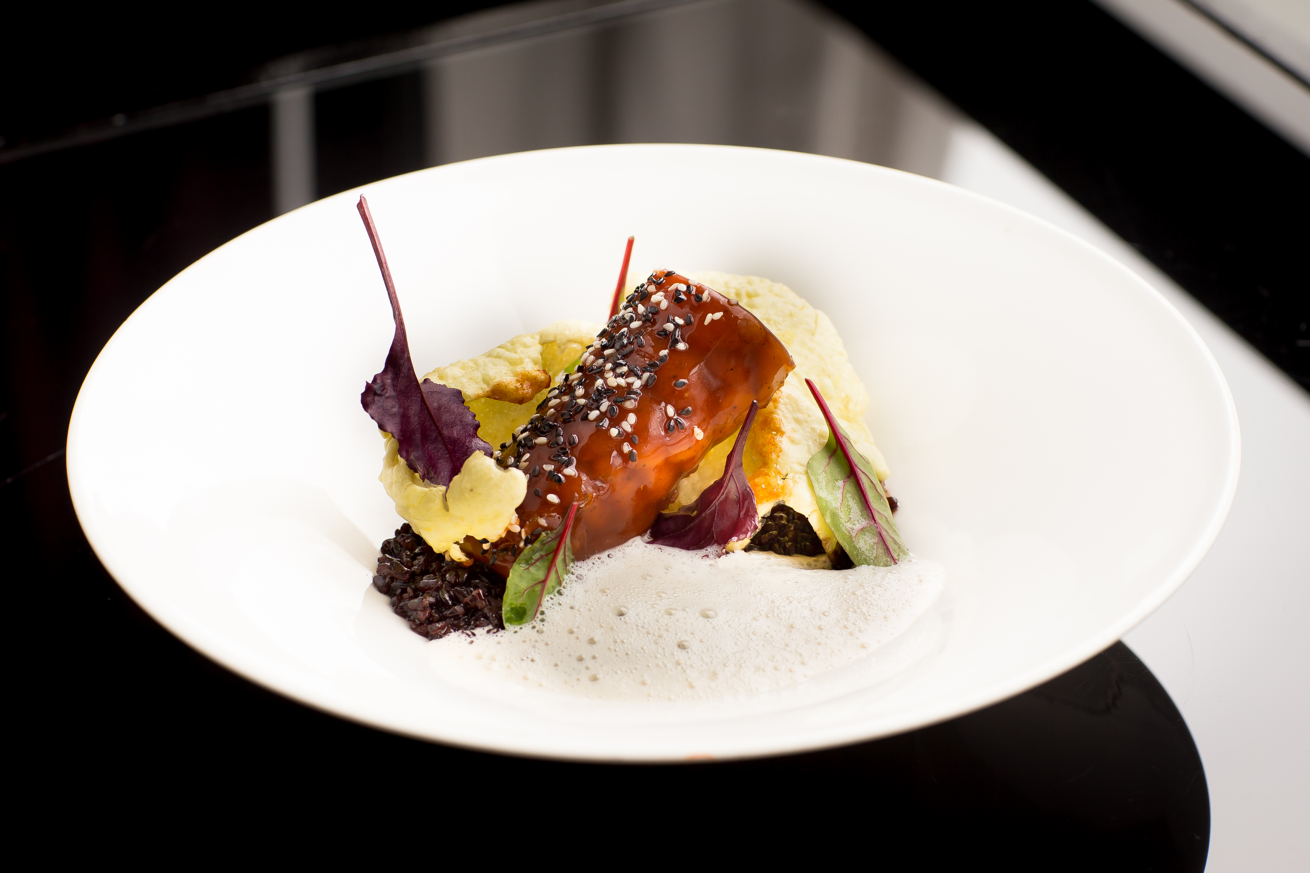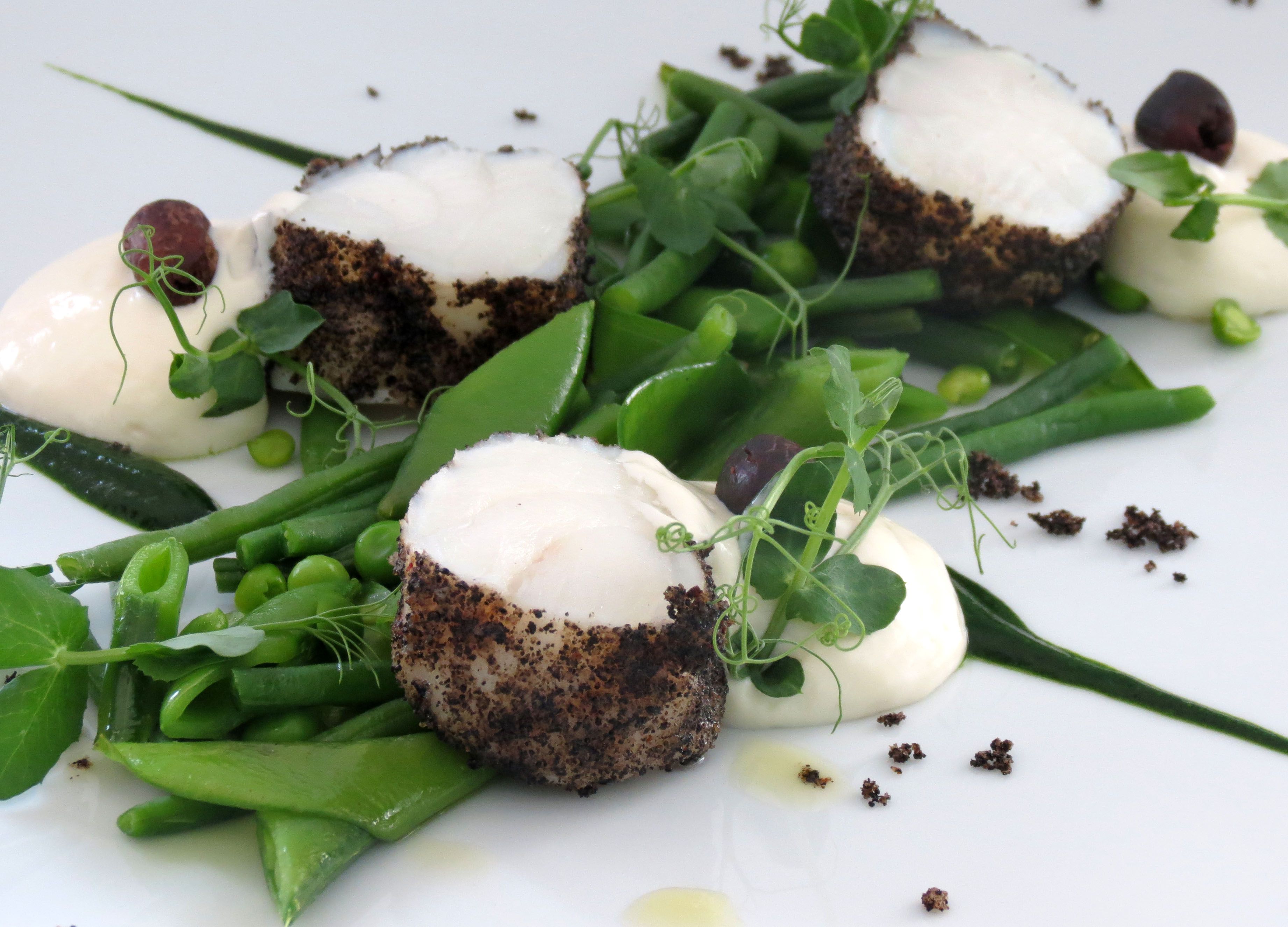 Saint Pierre en croûte d’encre truffée aux asperges déclinées, sauce velouté