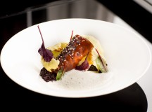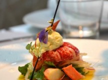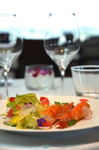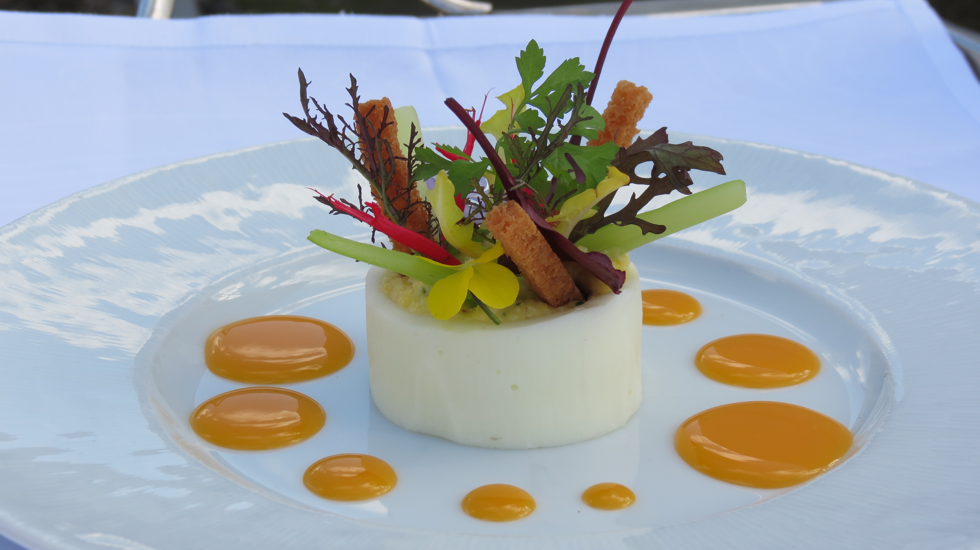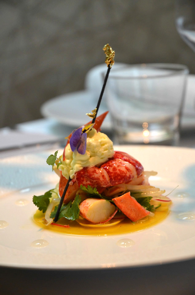 Petits pois en velouté froid, lamelles de canard fumé et caillé de chèvre frais de M. Fabre Homard bleu confit, bavaroise de choux fleur, toast melba et crème de crustacés