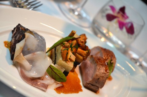 Black Angus en filet et Cecina de Galice 24 mois, sauce raisinée aux olives Taggiasche, légumes printaniers