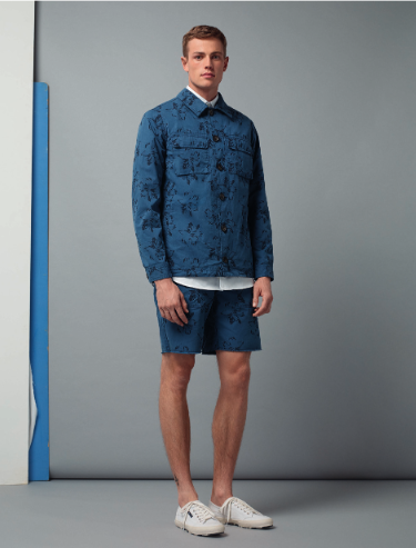 Eden Park propose une silhouette saharienne et bermuda, imprimé hibiscus chez l’homme. Un motif ultra facile à porter en total look ou dépareillé, que ce soit à la ville comme à la mer. La finesse des détails, mêlée au bleu profond de l’ensemble donne une impression de relief : boutonnière, manches resserrées et bords francs.
