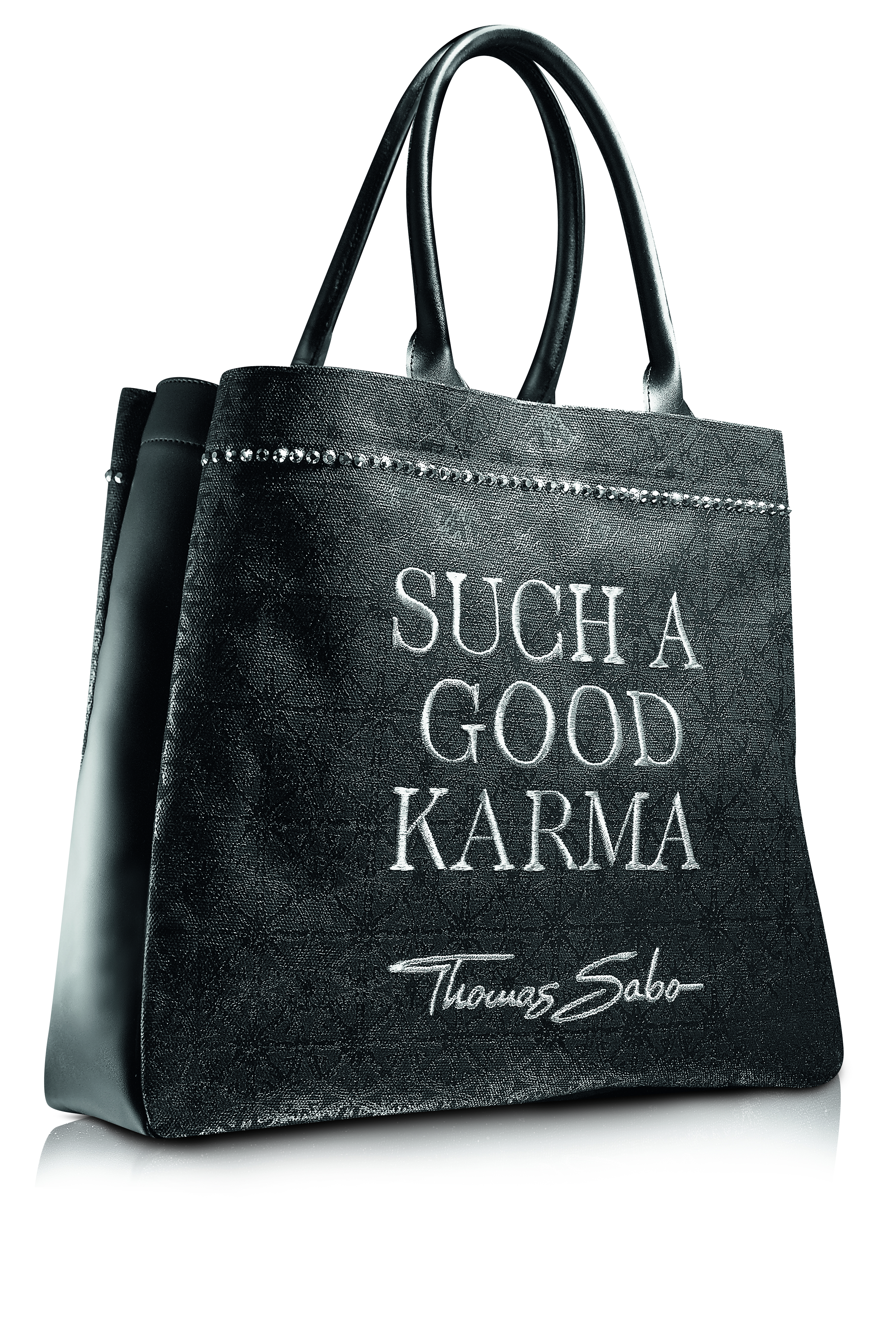 Idéal pour une virée shopping, Le nouveau Shopper Karma Beads est un sac élégant et pratique qui convainc par son design mais aussi par son confort. Le style typique de THOMAS SABO est mis en lumière par un imprimé brillant Wheel of Karma et le décor clouté ajoute un coté rock. Les broderies argentées en fil métallique subliment le shopper. Les côtés et le fond ainsi que les anses permettant une bonne prise en main sont en cuir de vachette souple, noir, ce qui rend le sac très résistant.