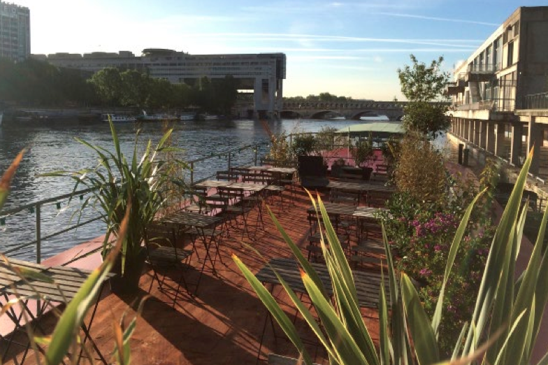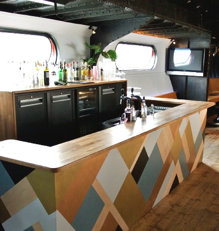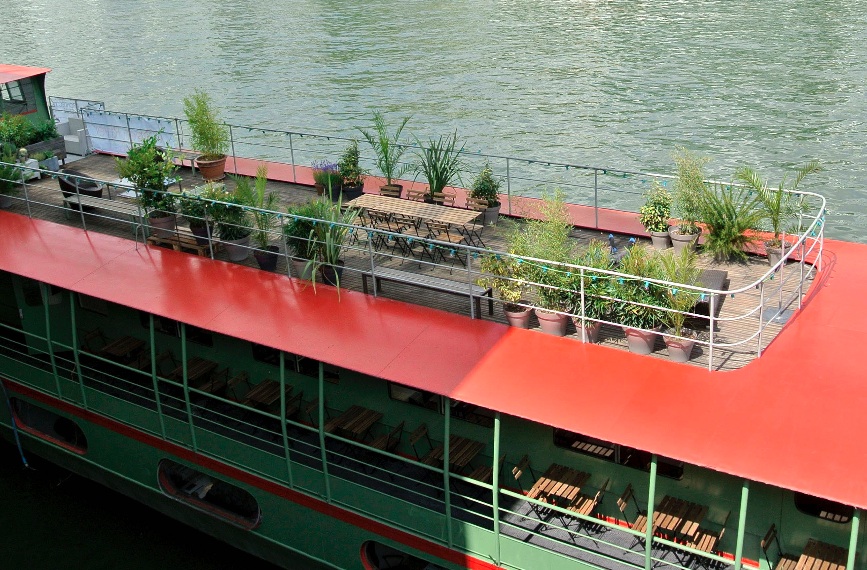 Le restaurant intérieur est arboré de couleurs naturelles, reposantes et lumineuses tandis que le bar à cocktails au sous-sol laisse place à des formes plus graphiques et des couleurs vives. Le duo de décoratrices a transformé cette ancienne péniche du Quai d’Ivry dans un esprit de guinguette.
