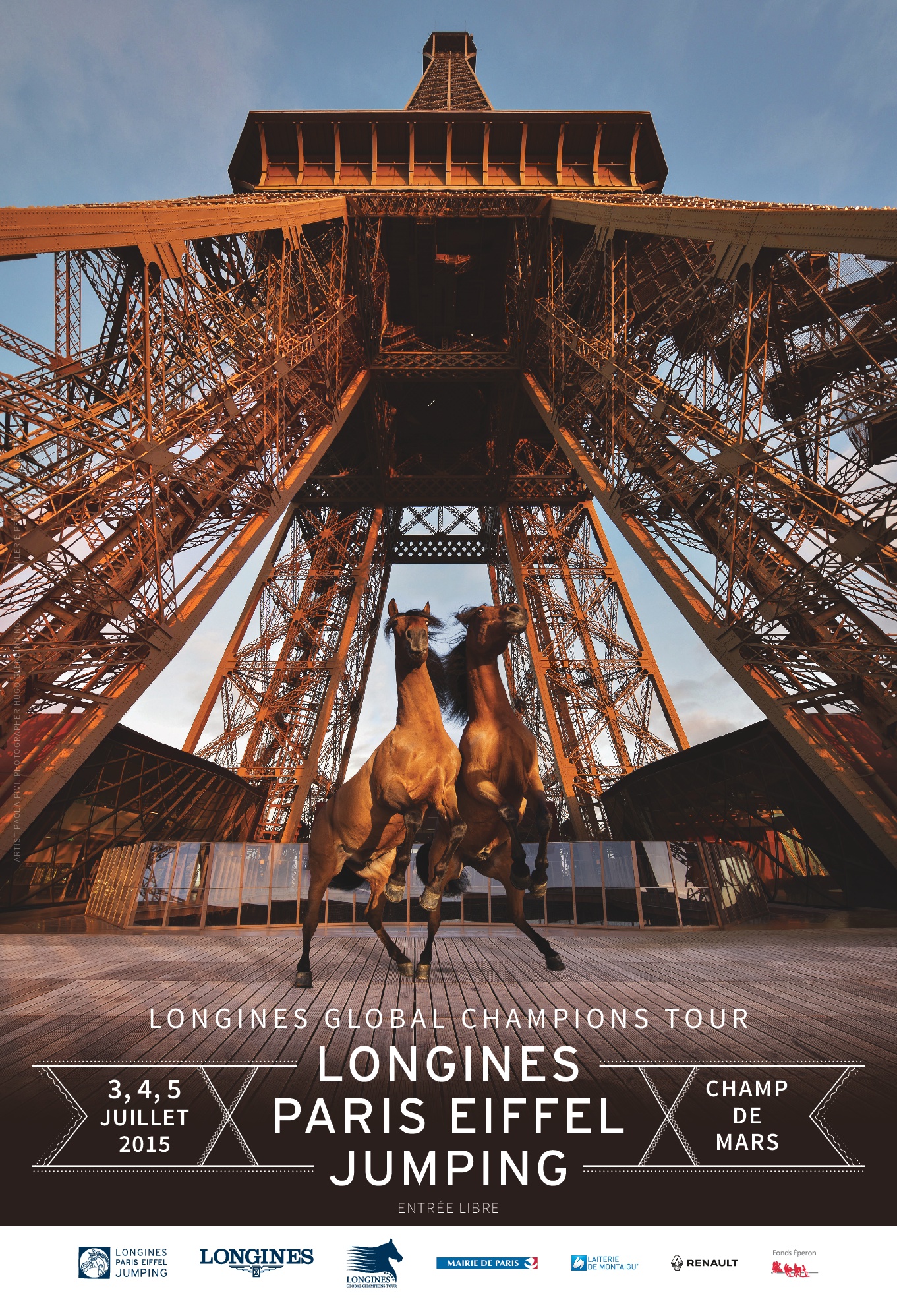 Paola Pivi, célèbre artiste italienne contemporaine, exposée par la Galerie Perrotin, a réalisé l’affiche de l’événement dans le cadre d’une séance photo exceptionnelle, véritable performance artistique : pour la première fois de l’Histoire, des chevaux ont foulé le sol du 1er étage de la Tour Eiffel.