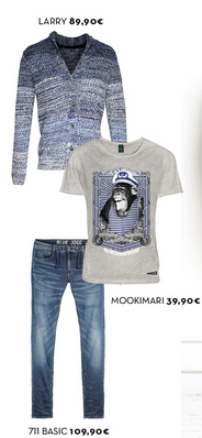 Japan Rags joue avec les couleurs en reproduisant des camaïeux de bleus sur des pièces phares. Le tee-shirt marinière est restylisé en imprimé singe et se porte avec un gilet en grosse maille chinée en dégradé d’indigo. On assortie l’ensemble avec un jean coupe slim effet destroy dont les touches bleutées sont volontairement accentuées sur les revers.