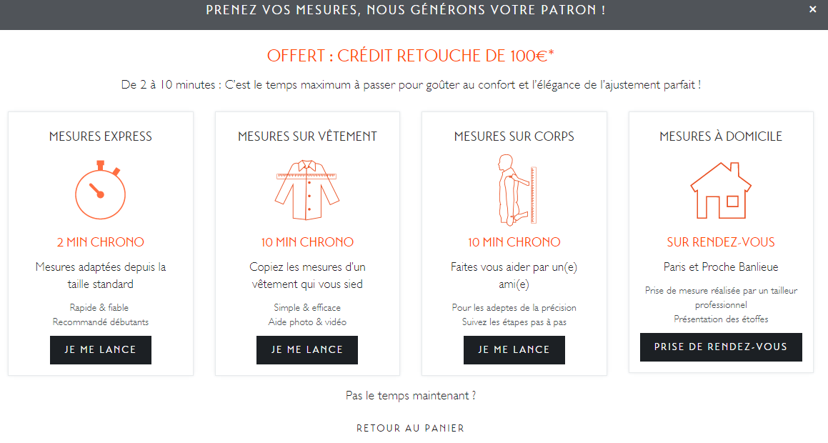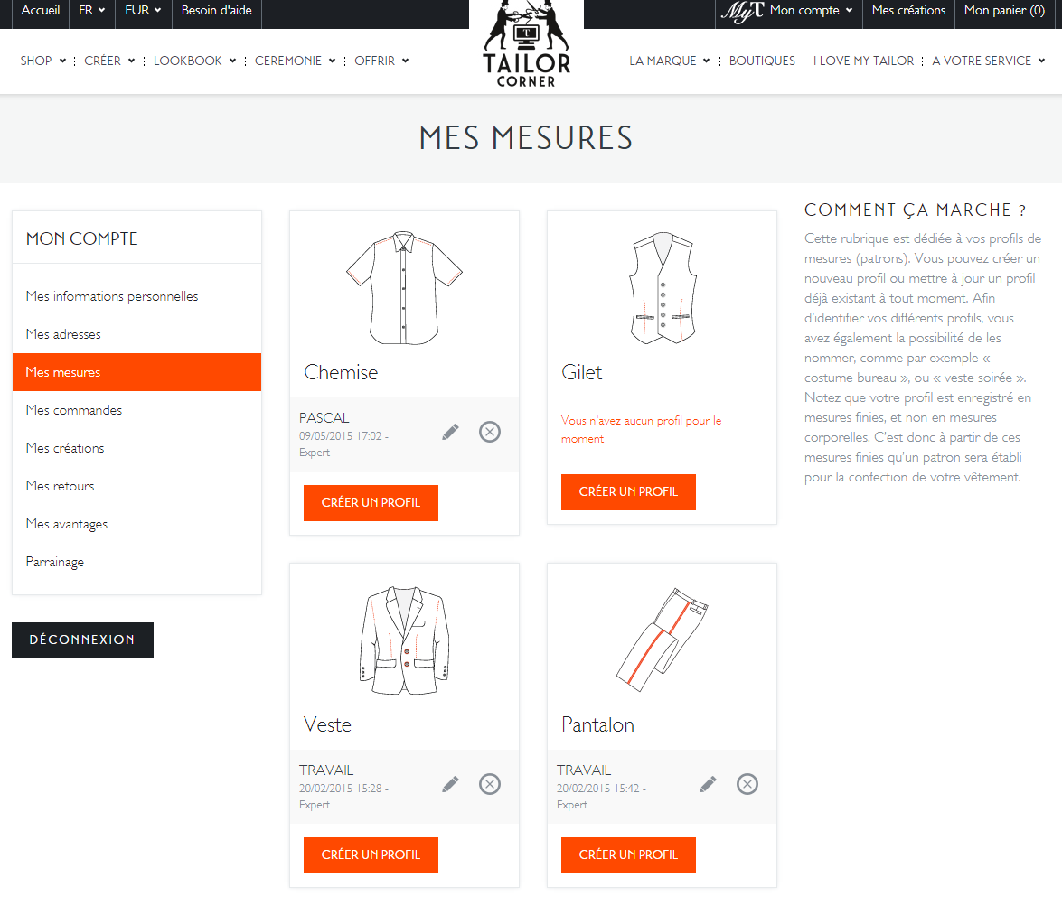 Tout commence par la prise de mesure en boutique où sur internet. Si vous optez pour la prise de mesure sur par internet, des tutoriaux très bien fait sont mis à disposition.