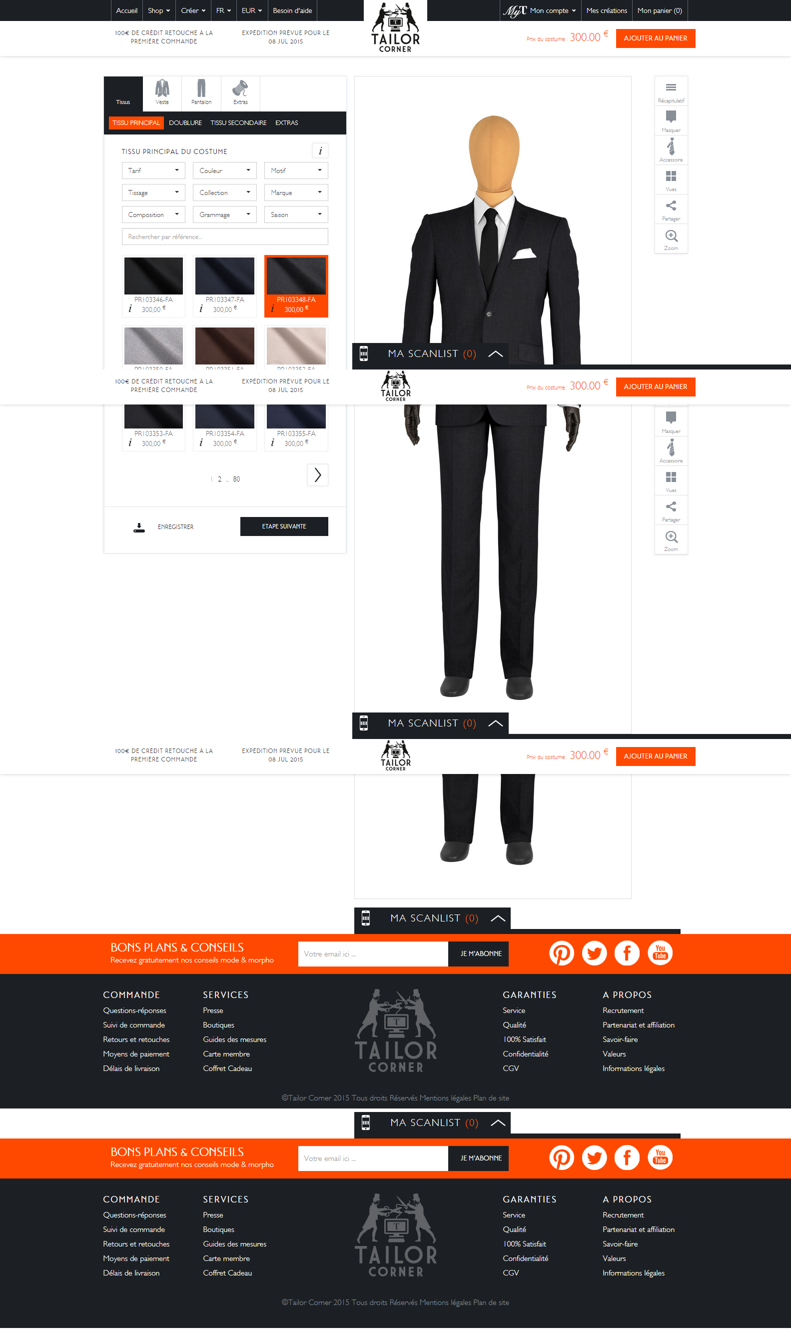 Une fois les mesures prises, il faut confectionner le costume. Un très grand nombre de customisation et de choix est alors une nouvelle fois possible. On choisi le tissu parmi les très nombreuses couleurs proposées mais surtout parmi les tissus. Tailor corner a négocié des partenariats avec les plus grands manufactures, vous trouverez ainsi des tissus Dormeuil, Lanificio Cerruti, Loro Piana, Scabal. Evidemment celà impacte le prix du costume ( de 300 à 1500 euros) mais donne des opportunités multiples de posséder le costume de ses rêves avec les meilleurs tissus pour un prix défiant toute concurrence pour du sur mesure.
