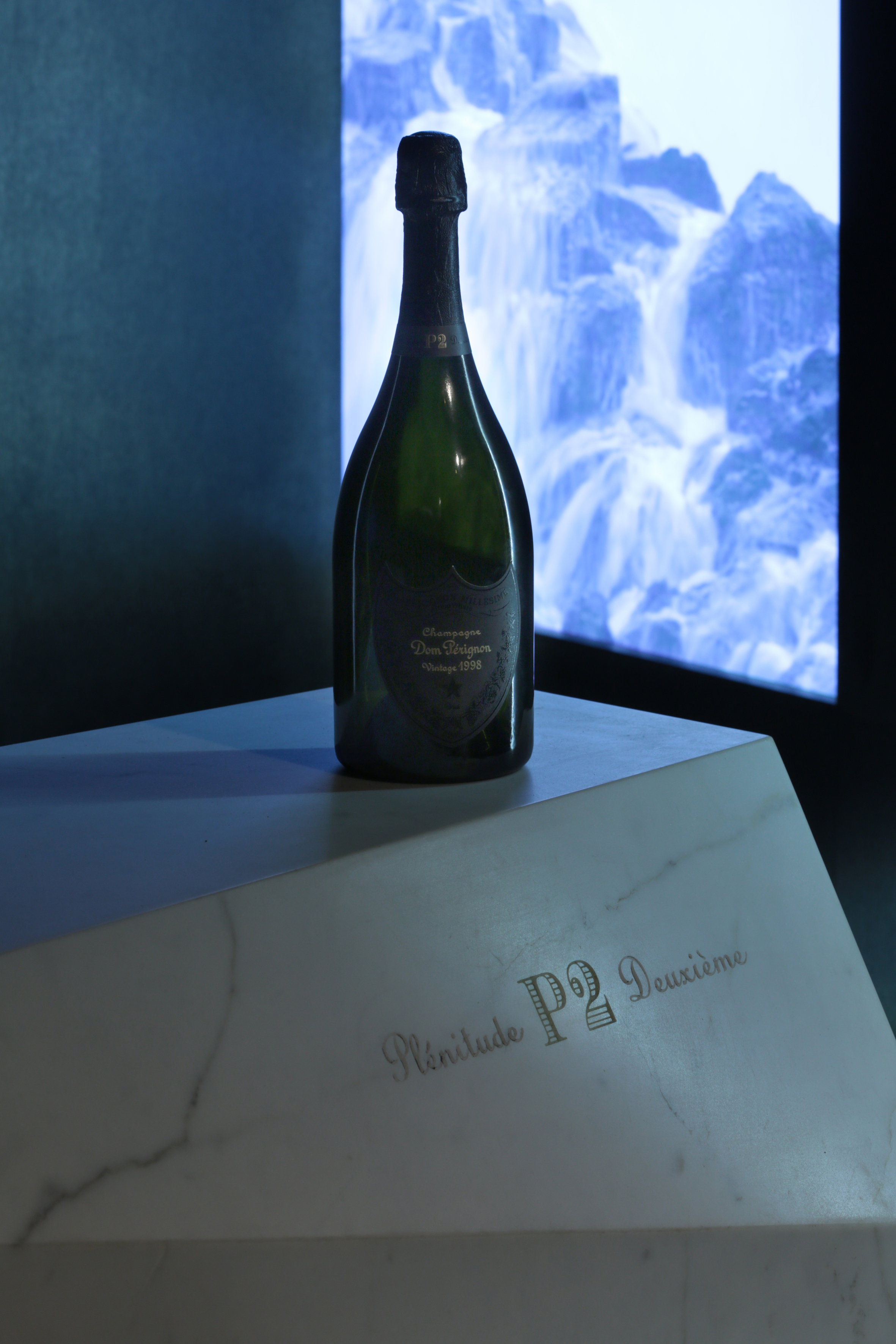 Salle de dégustation : bouteilles Dom Pérignon Vintage Blanc 2004, P2 1998, Dom Pérignon Rosé Vintage 2003