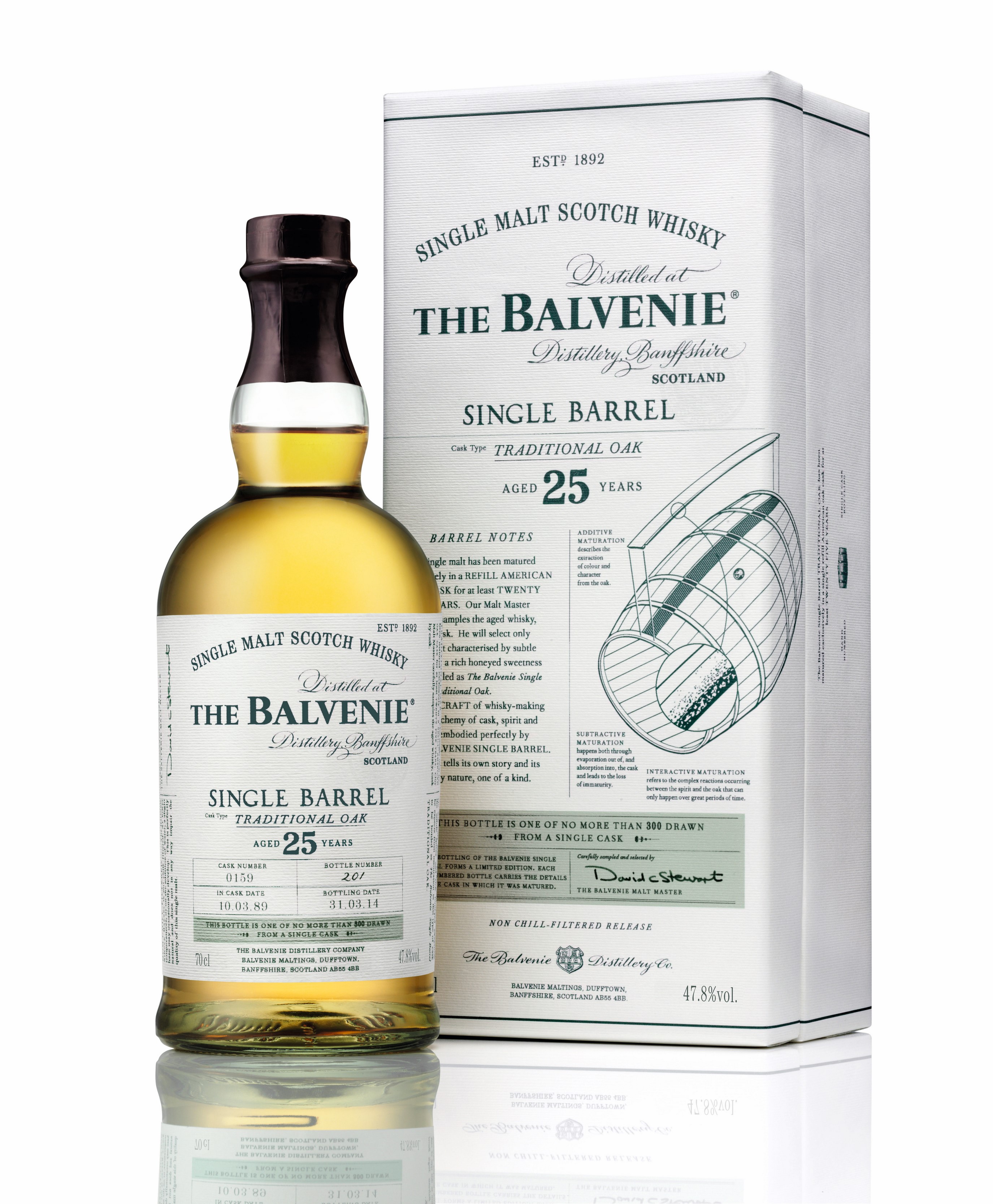 « La dégustation du Single Barrel 25 ans révèle tout le caractère du whisky The Balvenie, puisque cette référence provient exclusivement de fûts de chêne de second remplissage. Des notes telles que la vanille et le miel se mêlent aux parfums délicats et envoutants du chêne et des épices. Au fil de la dégustation, le Single Barrel 25 ans dévoile son caractère doux et sucré. » David Stewart, Maître de Chais The Balvenie