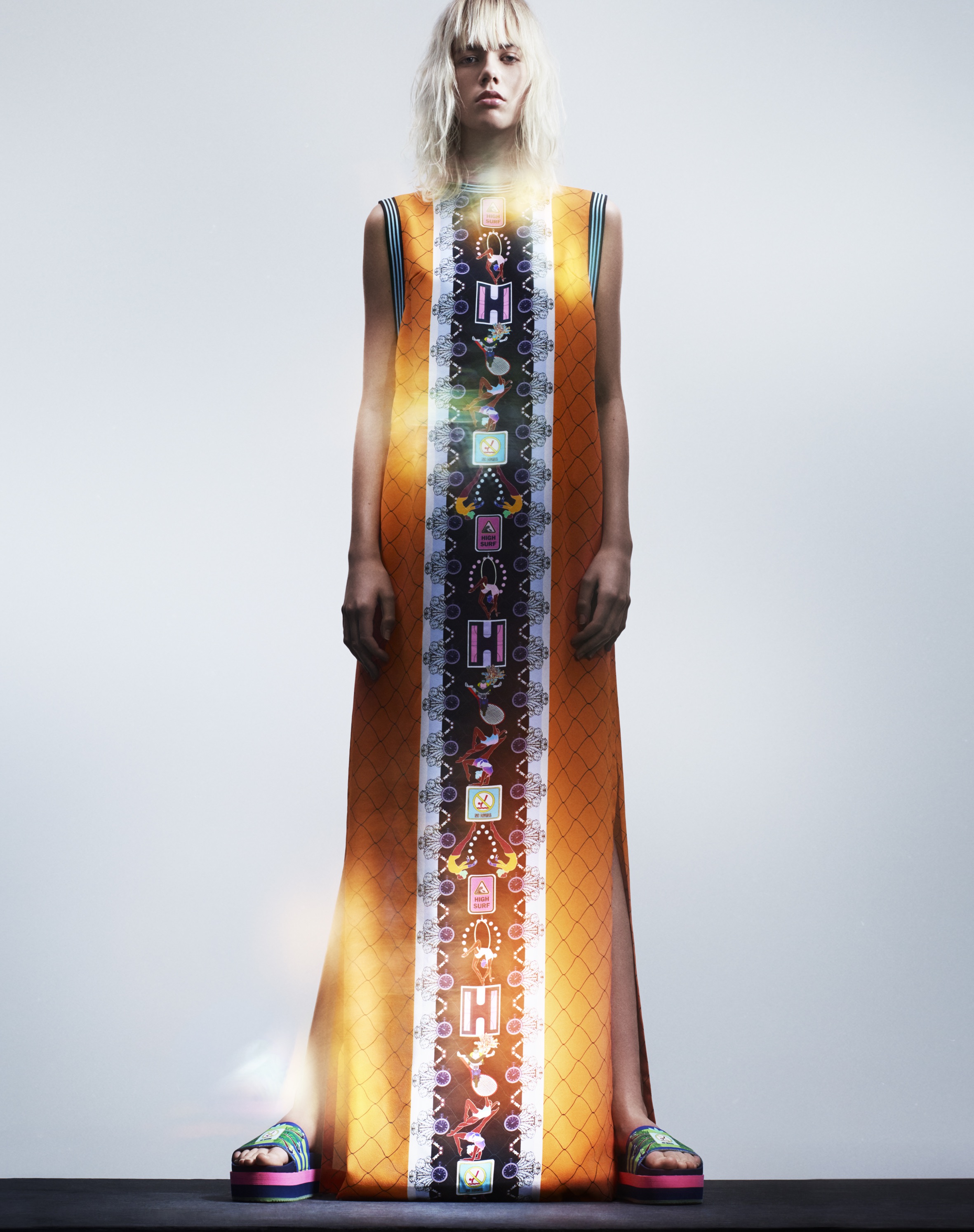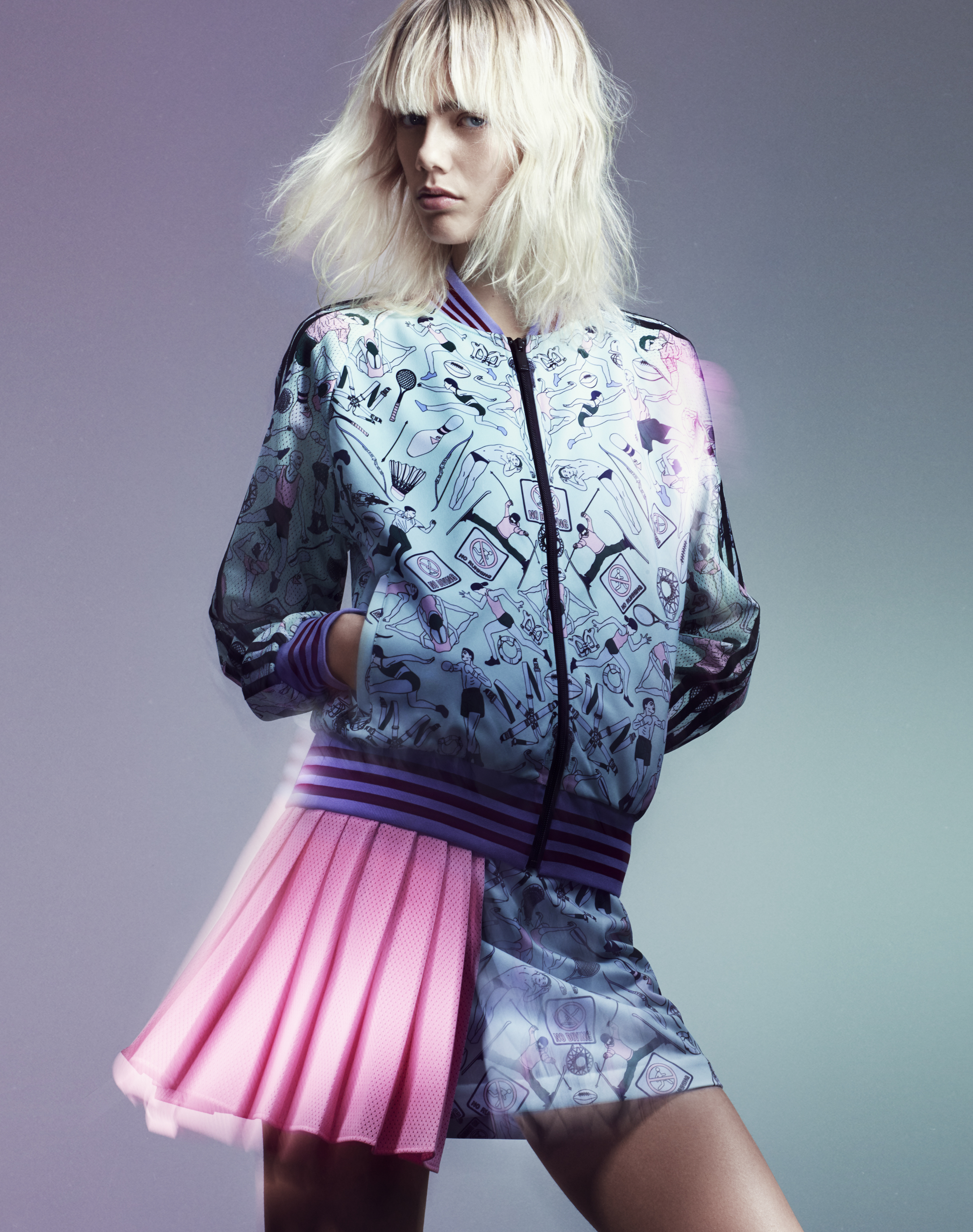 Le sportwear n’a jamais autant édifié la femme. C’est une myriade de pièces futuristes conçues par Mary Karantzou. Tapissées par des couleurs électriques et pastels, cette collection est ornées de personnages plongés dans l’univers Adidas Originals. A l’instar de Yohji Yamamoto, Topshop, Stella MacCartney ou Pharell williams, Mary Karantzou s’inspire des années 80, période aux couleurs outrancières. Elle se réapproprie cette profusion de nuances pétillantes et conjugue tableaux surréalistes avec mode sportive. Cette gymnastique créative illustre des athlètes toutes catégories confondues en plein exercice. Baseball, natation artistique, badminton, ski, motocross, tennis, c’est un meeting auquel nous sommes tous conviés.