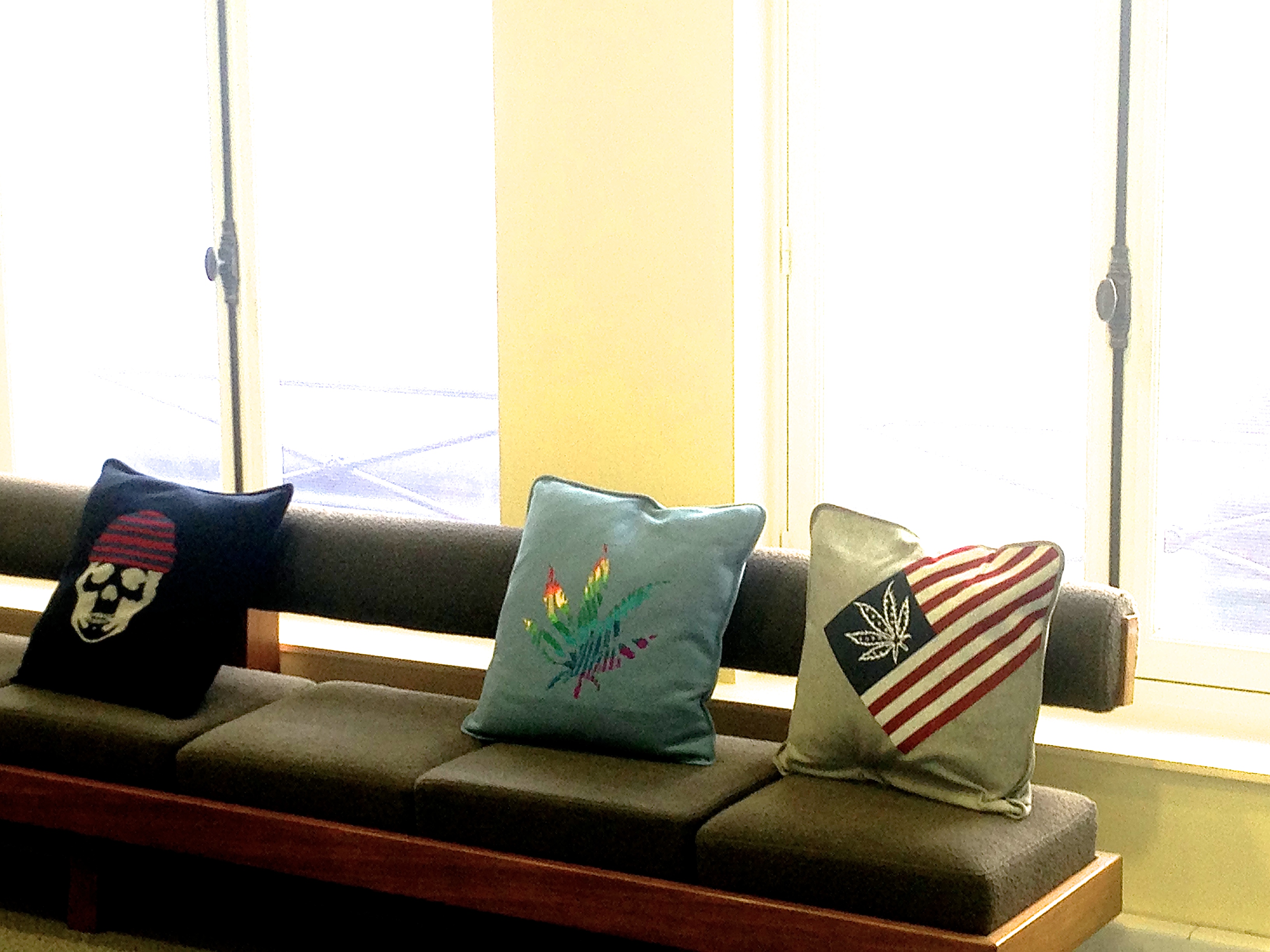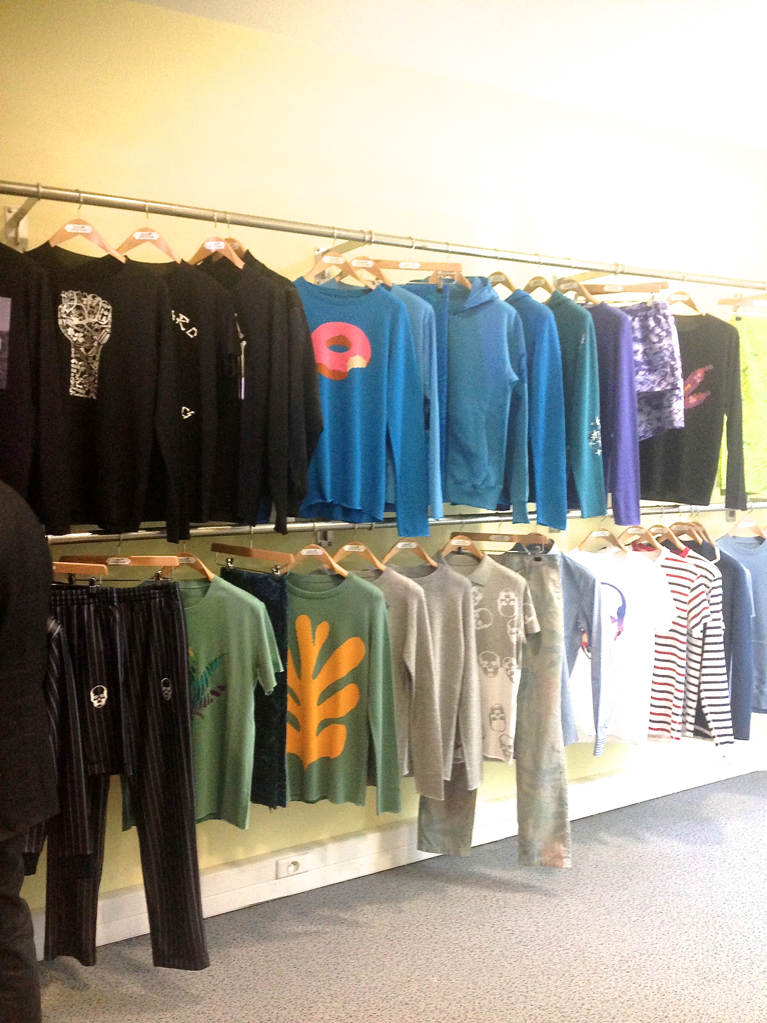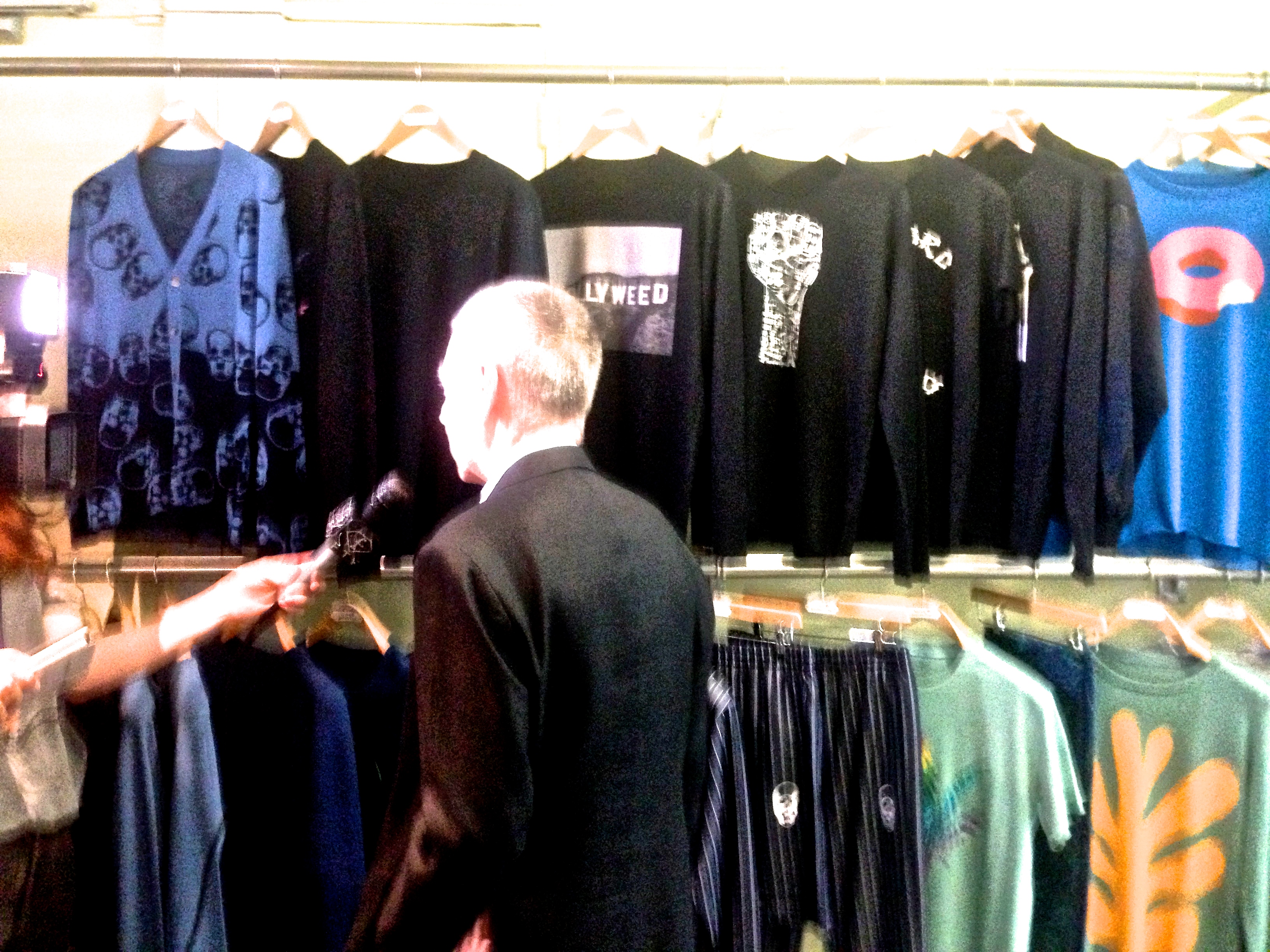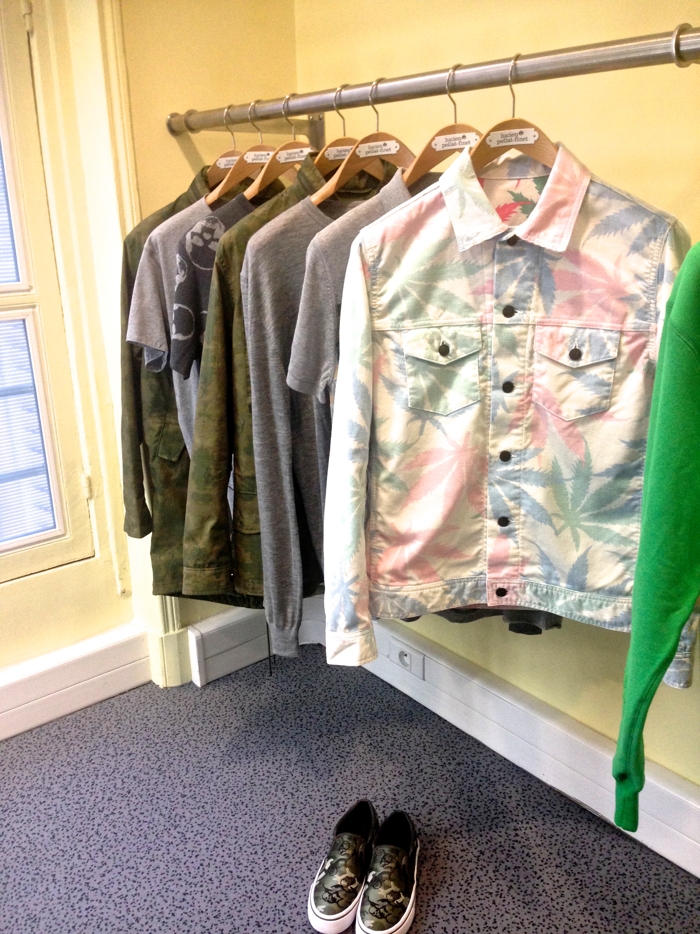Les pulls et shirts classique noirs, gris, les déclinaisons de bleu, les marinières à l’emblématique tête de mort se mêlent à des paréo rose à feuilles de cannabis, des cachemires clair figurant des squelettes surfant sur une vague dessiné à la Takashi Murakami, ou encore des t-shirts simple figurant le sigle Hollywood qui liras plutôt “Holyweed”. Des strass, de la toile camouflage, des fleurs hawaïennes, des bermudas tie and die… Monsieur Pellat Finet n’a pas froid aux yeux.
