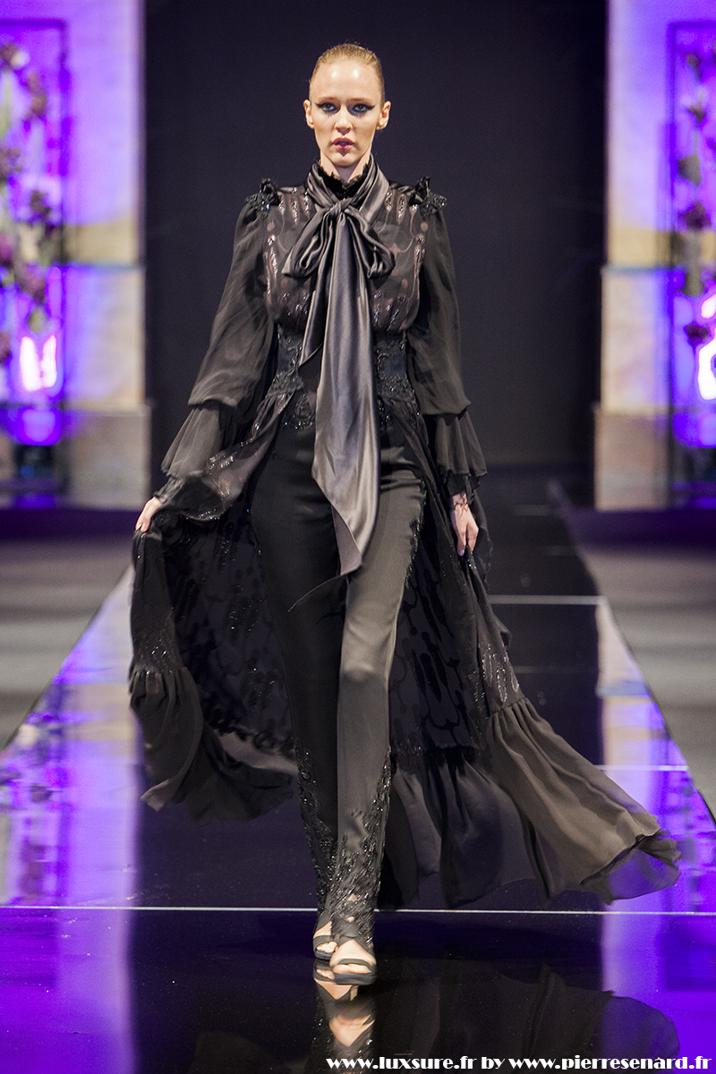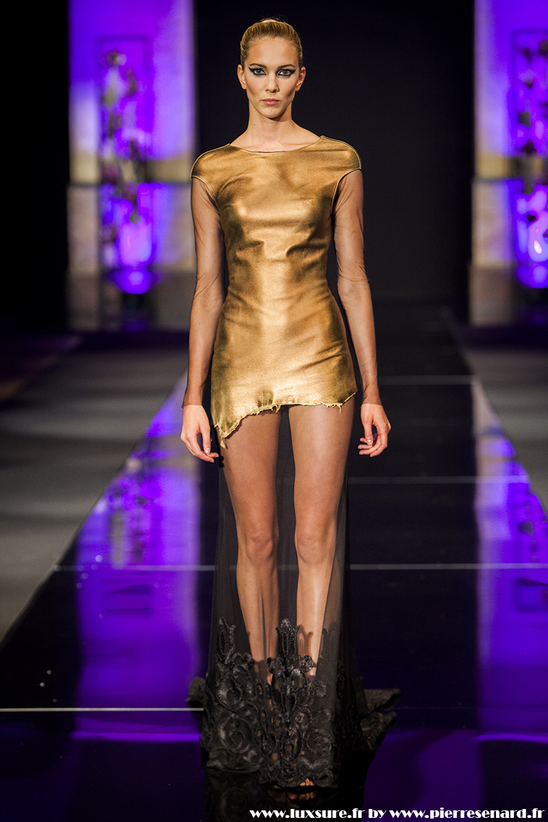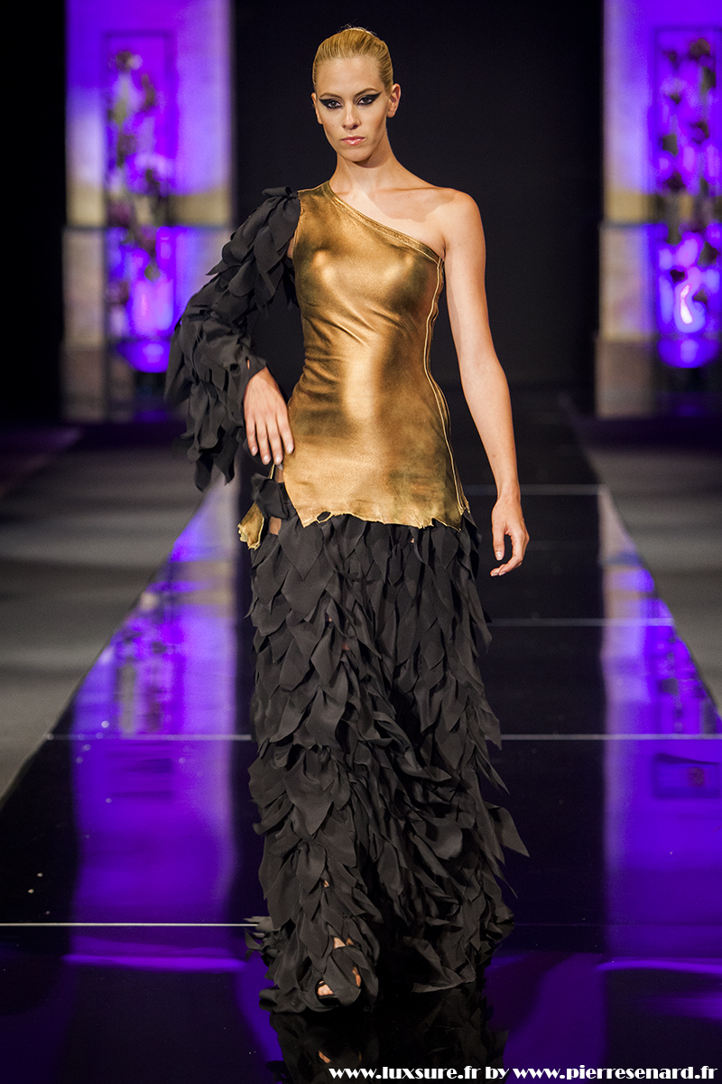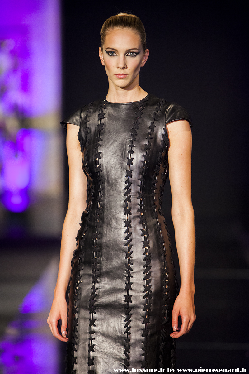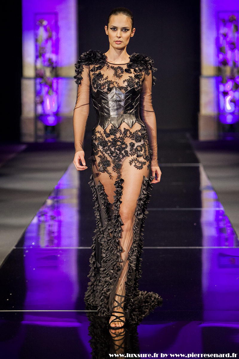 Intitulé « Midnight Butterfly », c’est le passage de matières légères, comme le tulle la soie ou la dentelle au cuir, plus rigides et impénétrable. Les noirs profonds rappellent le pétrole, un pétrole qui laisse peu à peu envisager la brillance des lingots. L’or Noir, cela résume bien cette collection. Bien que suave, le créateur est originaire d’un pays ayant une histoire forte, faite de guerre et de conflits. Cette collection où les matières deviennent à la fois rigides et de plus en plus brillantes et comme une métaphore du combat de ces jeunes créateurs, et de leur déterminations.