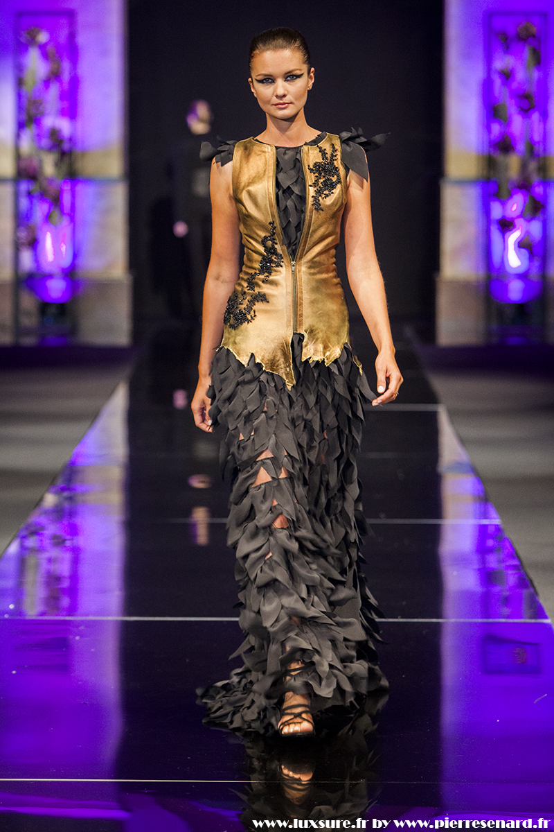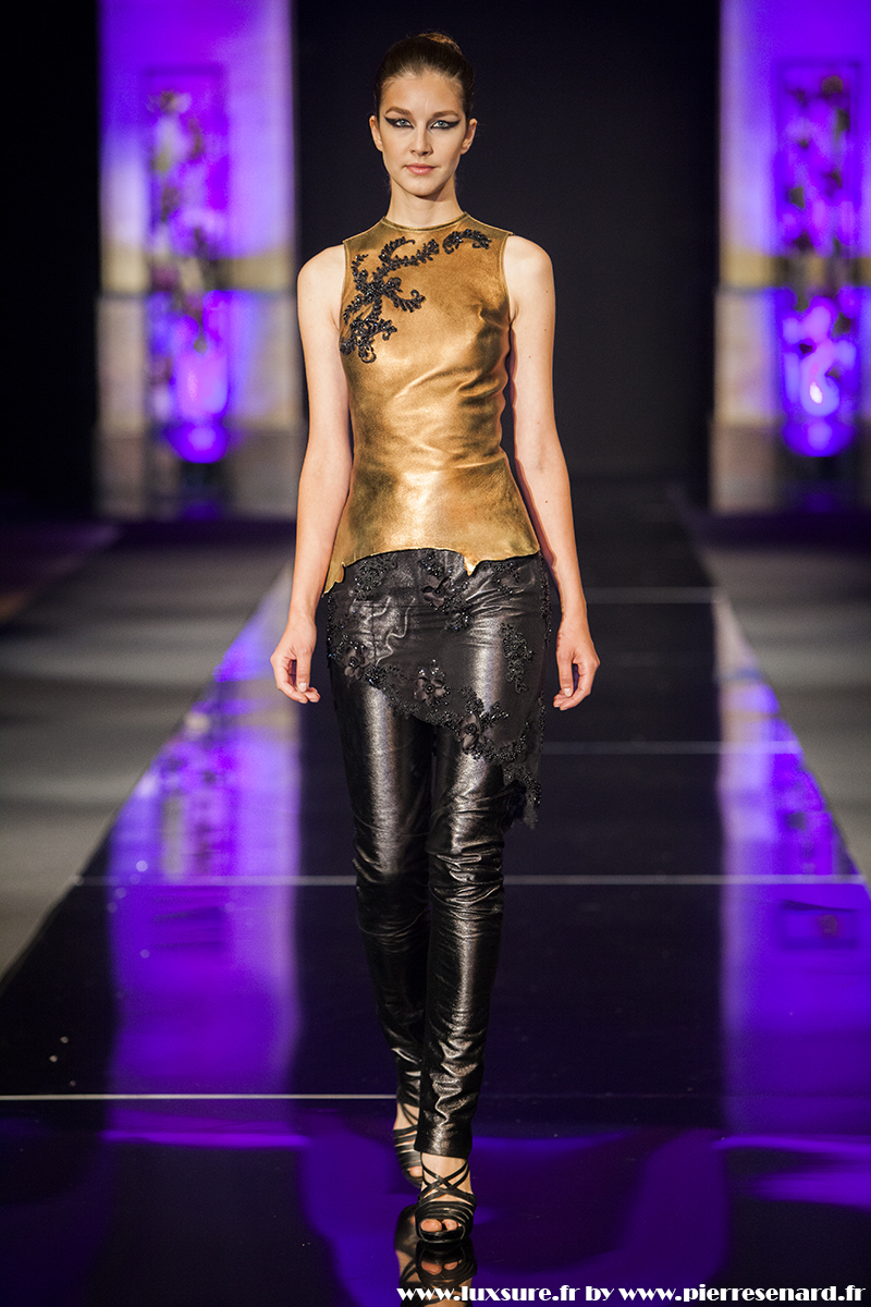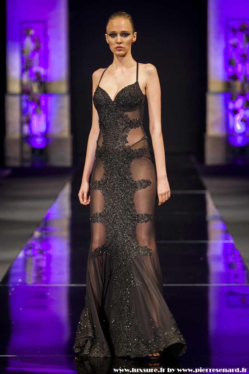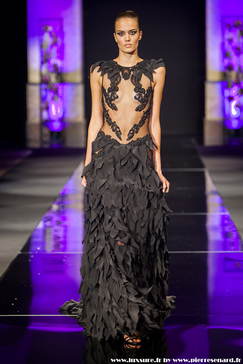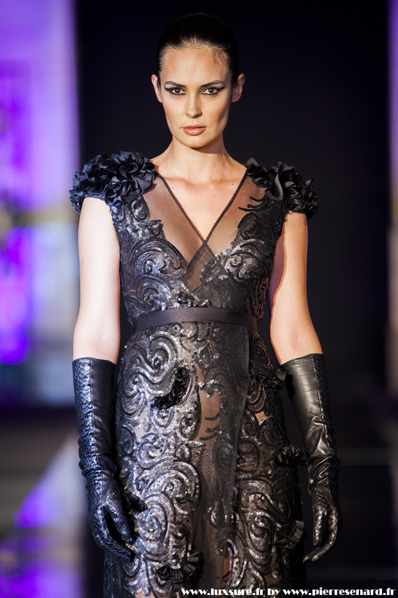 Intitulé « Midnight Butterfly », c’est le passage de matières légères, comme le tulle la soie ou la dentelle au cuir, plus rigides et impénétrable. Les noirs profonds rappellent le pétrole, un pétrole qui laisse peu à peu envisager la brillance des lingots. L’or Noir, cela résume bien cette collection. Bien que suave, le créateur est originaire d’un pays ayant une histoire forte, faite de guerre et de conflits. Cette collection où les matières deviennent à la fois rigides et de plus en plus brillantes et comme une métaphore du combat de ces jeunes créateurs, et de leur déterminations.