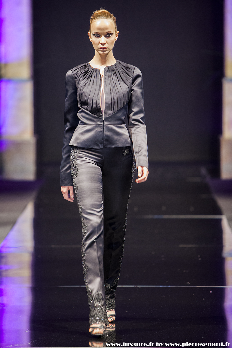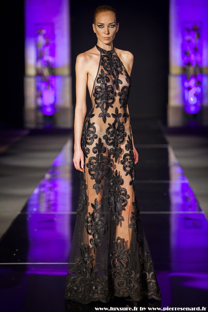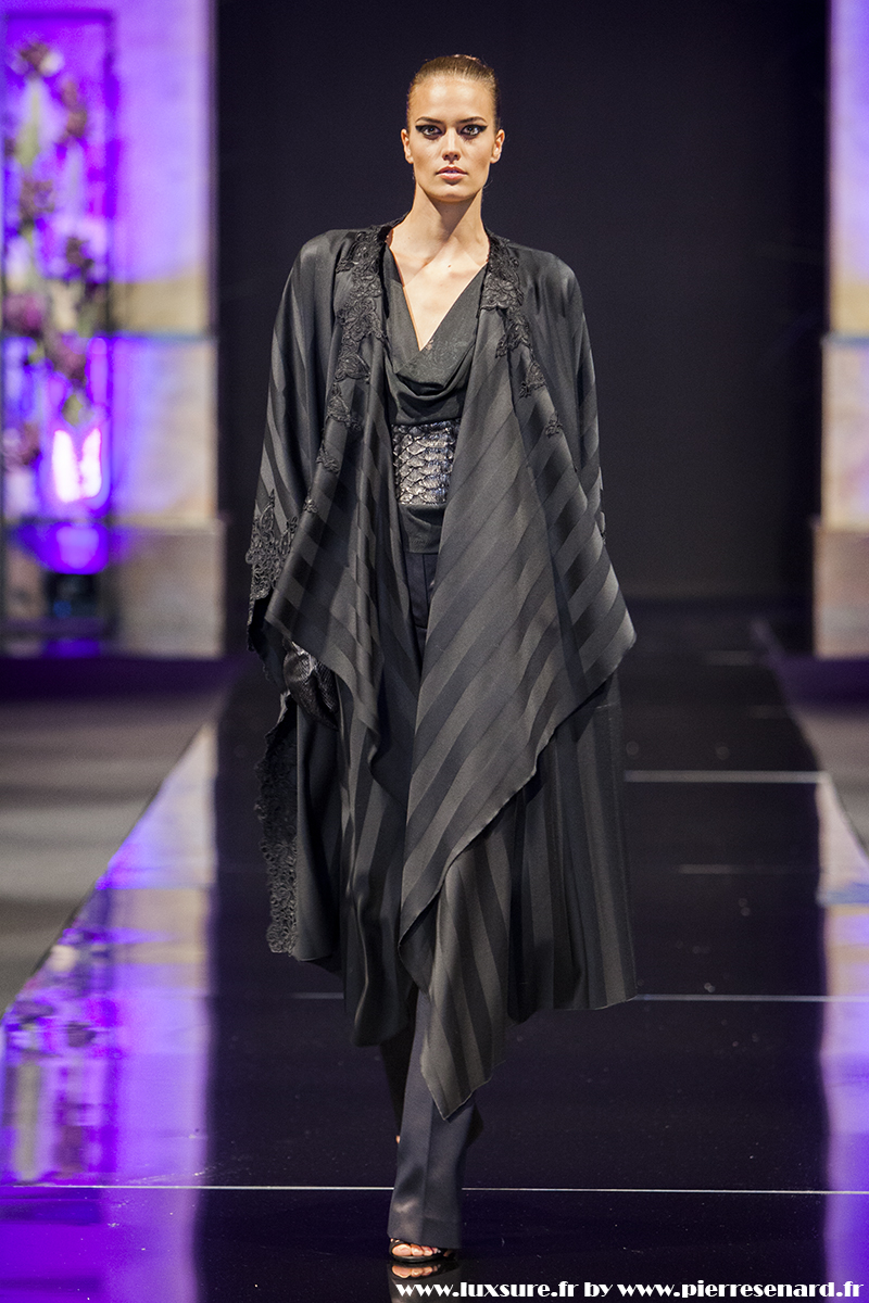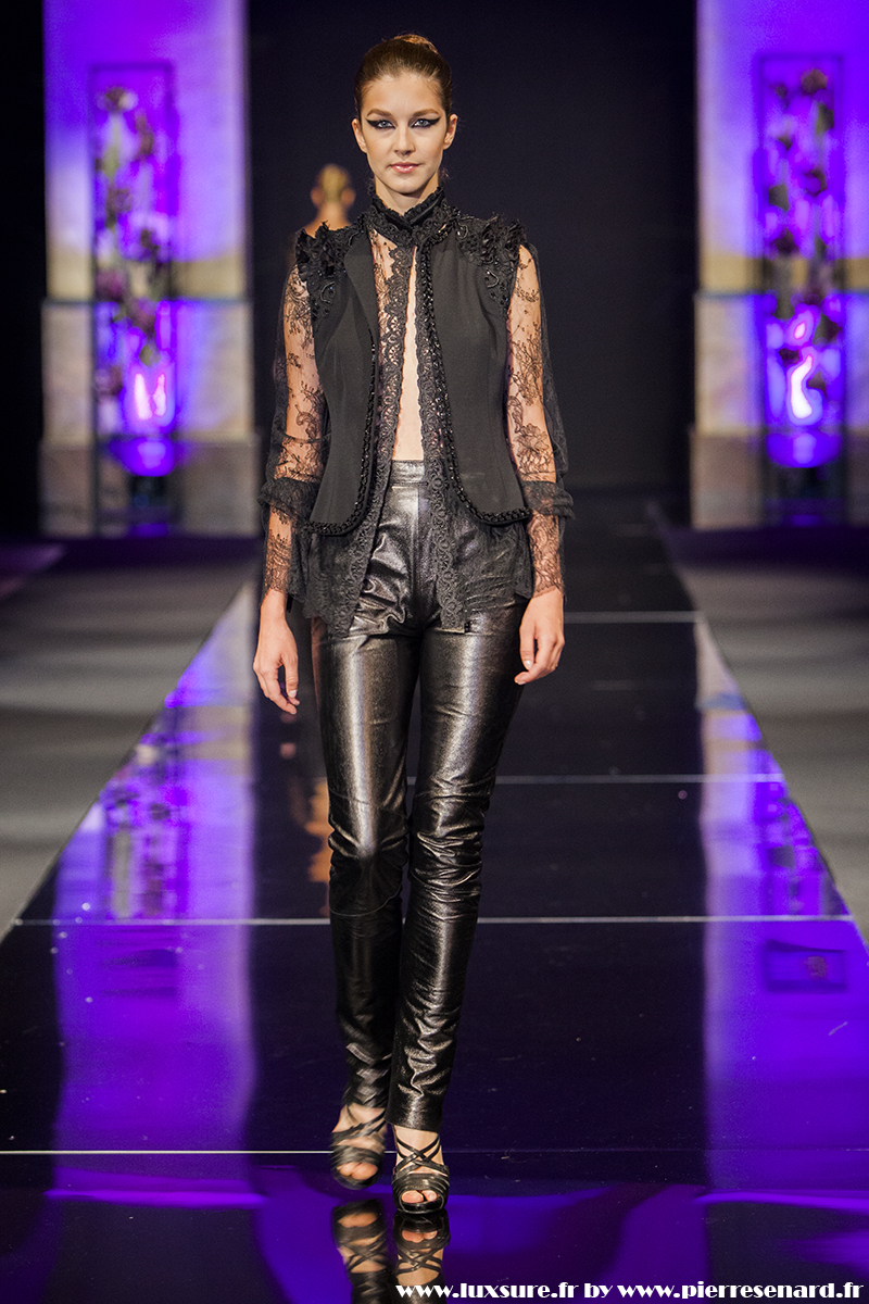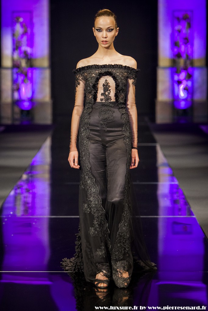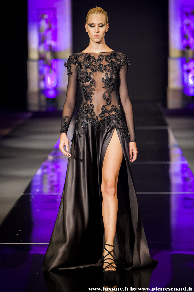 Intitulé « Midnight Butterfly », c’est le passage de matières légères, comme le tulle la soie ou la dentelle au cuir, plus rigides et impénétrable. Les noirs profonds rappellent le pétrole, un pétrole qui laisse peu à peu envisager la brillance des lingots. L’or Noir, cela résume bien cette collection. Bien que suave, le créateur est originaire d’un pays ayant une histoire forte, faite de guerre et de conflits. Cette collection où les matières deviennent à la fois rigides et de plus en plus brillantes et comme une métaphore du combat de ces jeunes créateurs, et de leur déterminations.