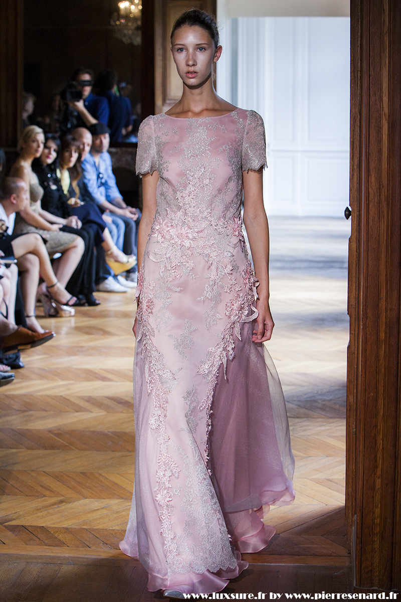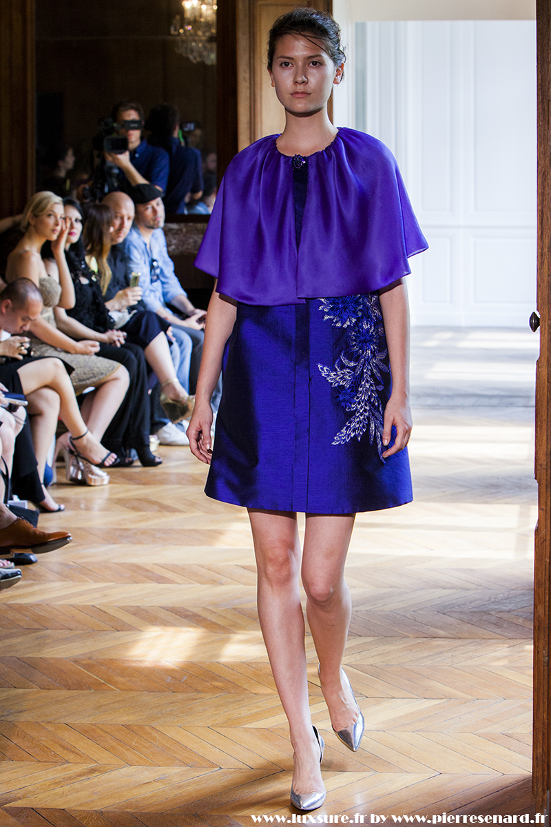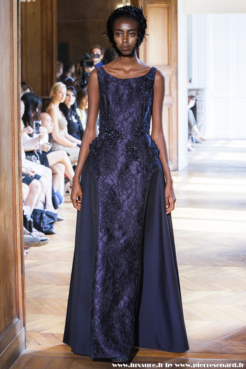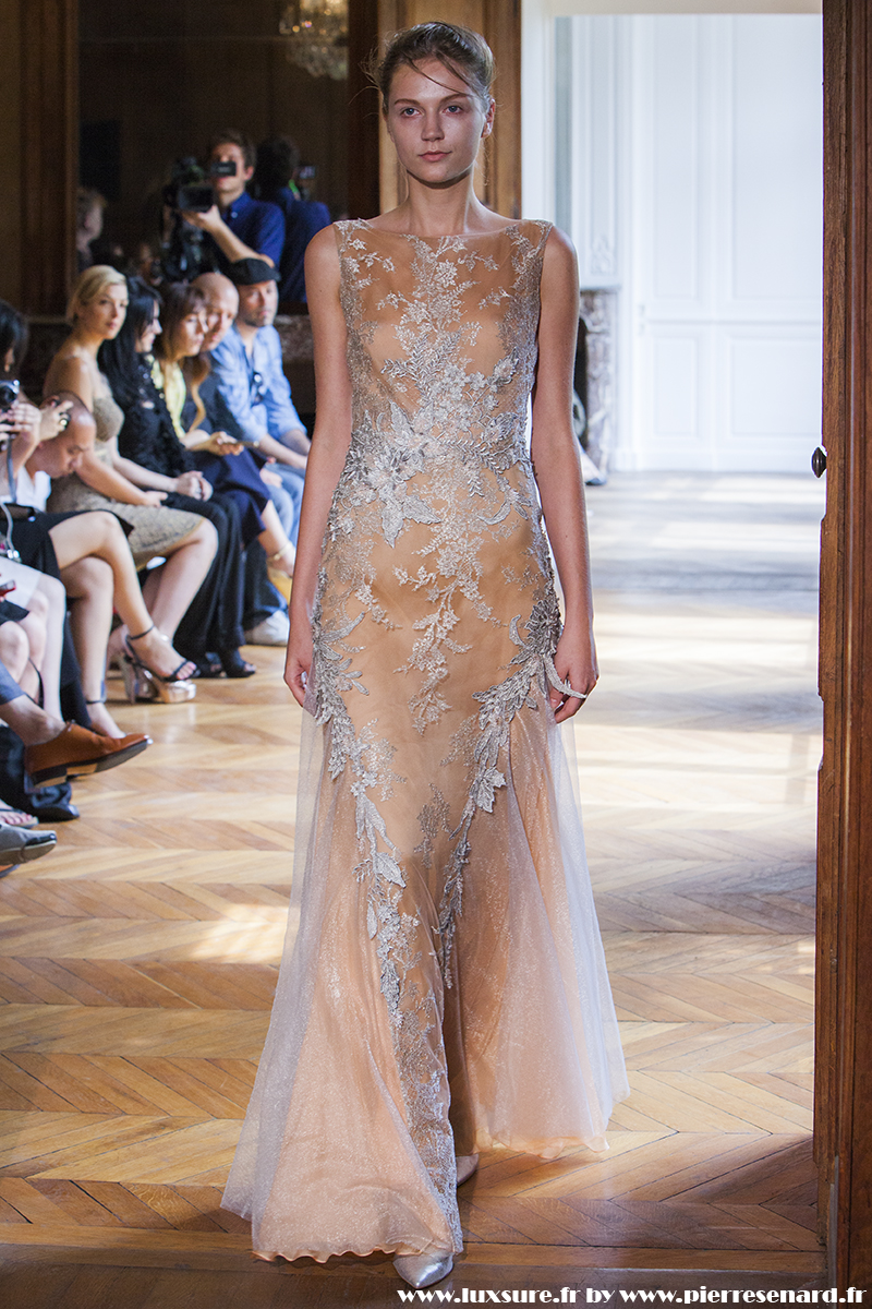 Ne cherchant pas à éblouir par des jeux de lumière, et des paillettes à outrance, c’est par la rigueur de ses découpes, la précision des volumes que les robes longues de soirées et les robes de cocktail prennent toute leur ampleur.