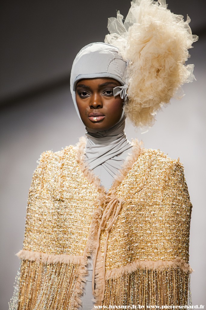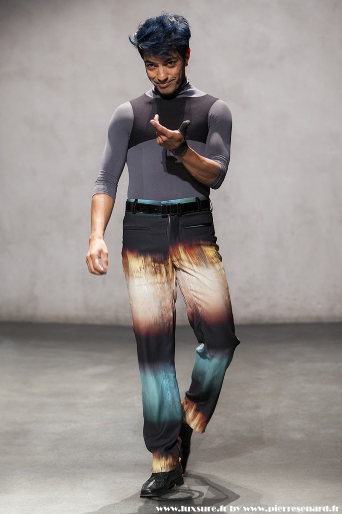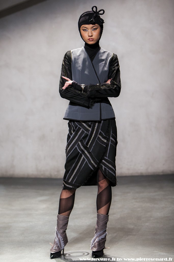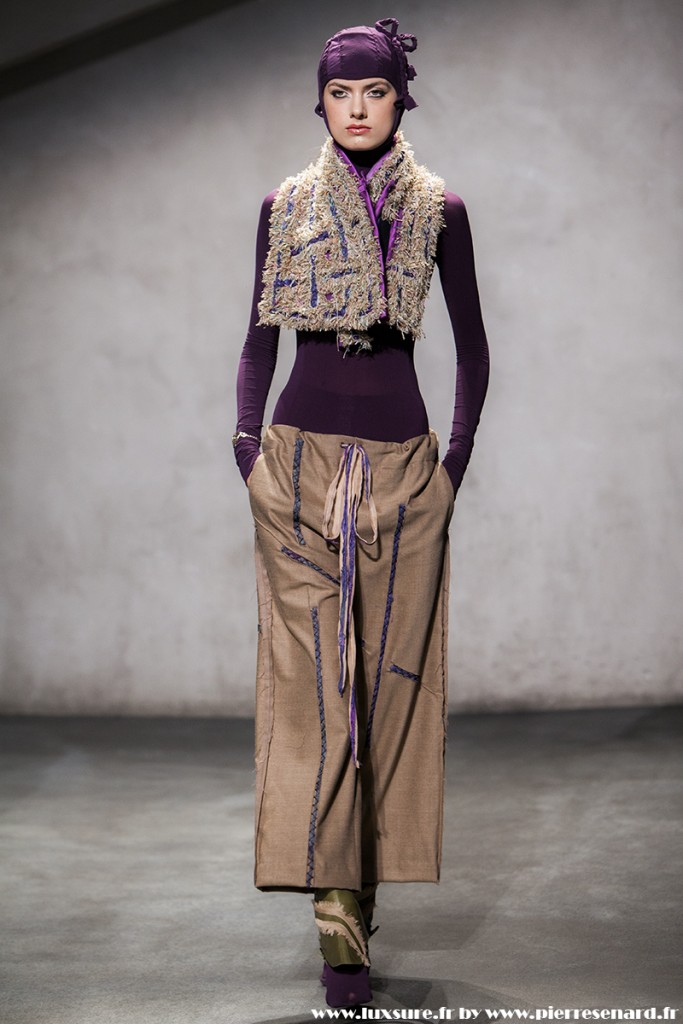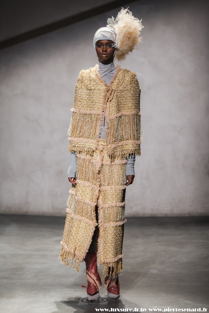 C’est dans la partie « underground » du palais de Tokyo, que s’est déroulé le défilé automne-hiver 2015-2016 d’Antonio Ortega. Dans une ambiance crépusculaire, une scénographie brumeuse non -conventionnelle qu’ apparaissent les modèles de cette collection nommée MUMMIFIC. Le Mystère semble être le mot-clé de cette collection. Un hommage aux mystères féminins, aux mystères de la couture, où des matières et des découpes inattendues se rencontrent et livrent des modèles de légendes.