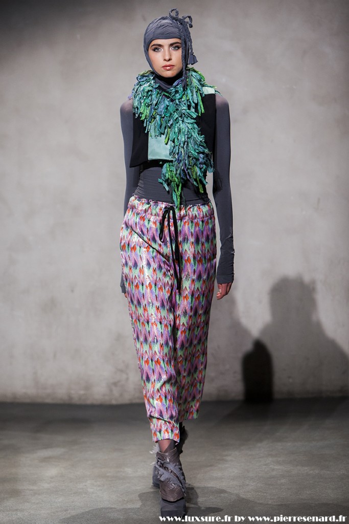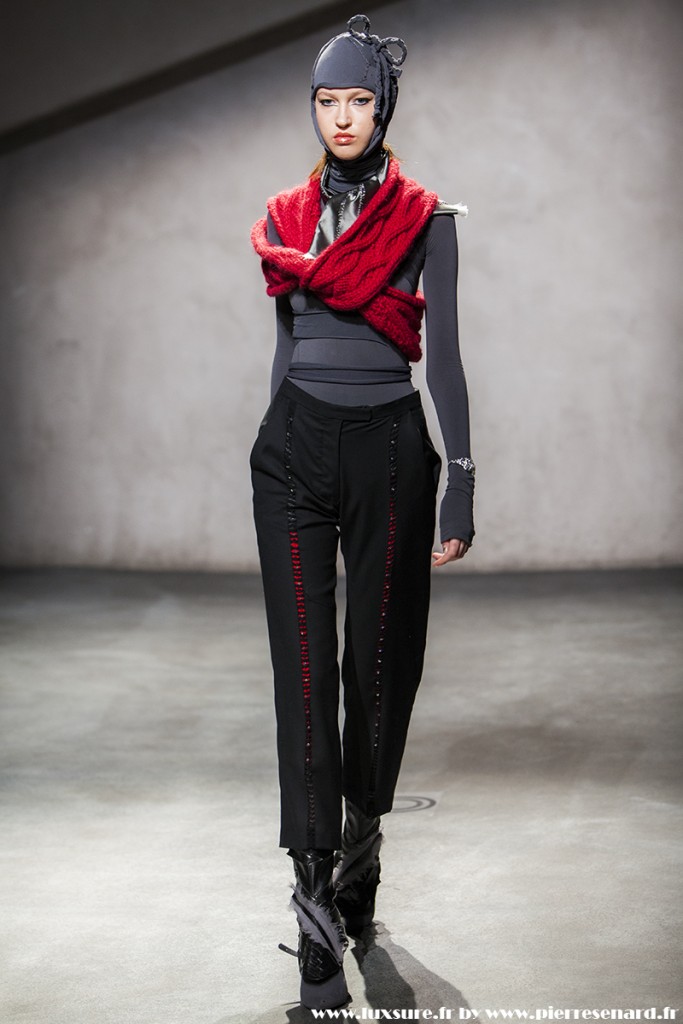 Des mannequins, il ne reste plus que des visages, des figures entourées, enveloppées dans un vêtement qui s’empare du corps entier. Des justes au corps qui configurent les silhouettes en toile de couleur, ou le créateur a apposé des shorts, des jupes, des tailleurs ou encore de pantalons, soit des pièces classiques. Pour autant il n’y a rien de classique dans les silhouettes de cette collection. Les pièces sont détournées et les volumes viennent encadrer les visages. En effet les épaules et bustes sont redessinées par des jeux de sculpture avec des écharpes et des tricots, des accessoires dont les pouvoirs nous était encore inavoués.