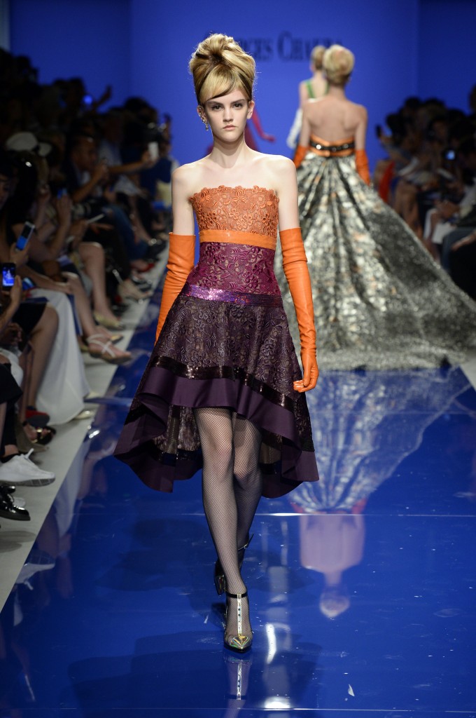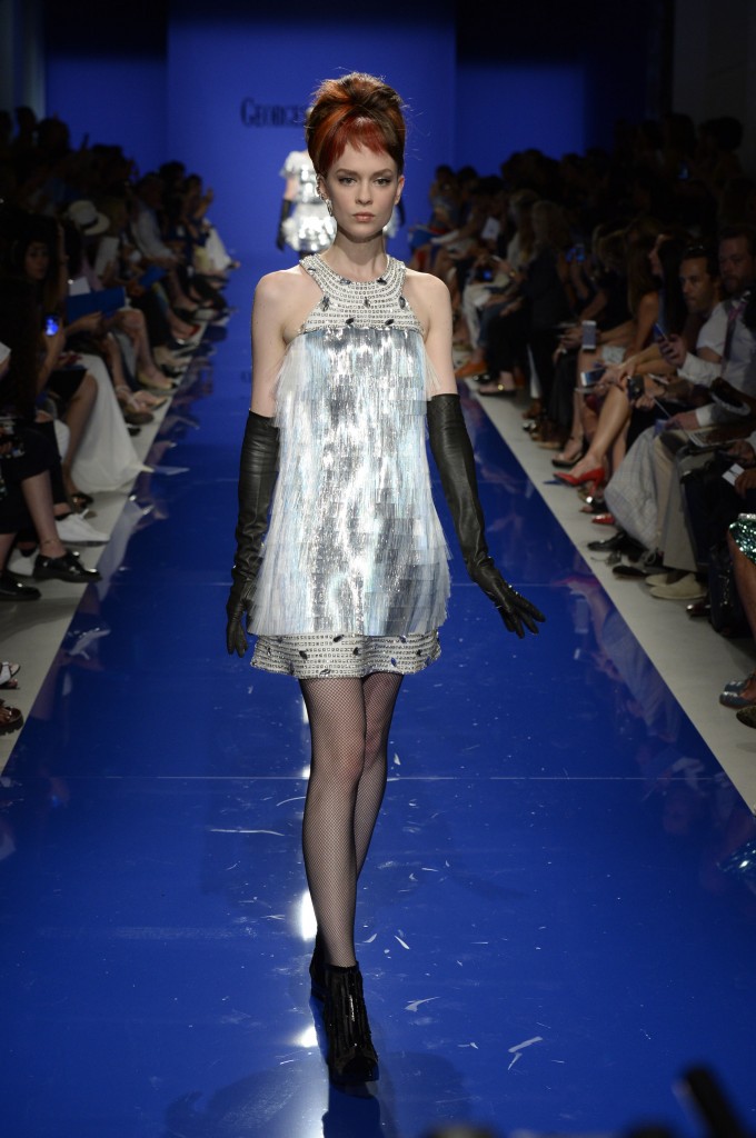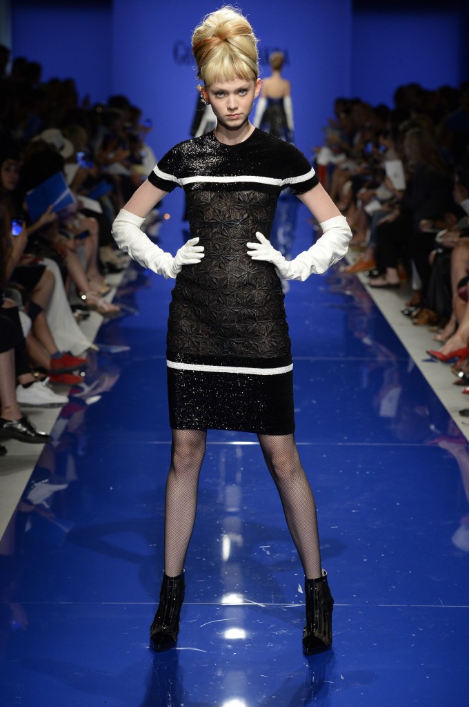 Géométrie de paillettes, fougue de franges et accents de velours sont autant de traits d’esprit et de glamour… Ensorcelantes, les silhouettes se parent d’une prouesse de rubans enflammés…Luxe de motifs chic-psychédéliques.