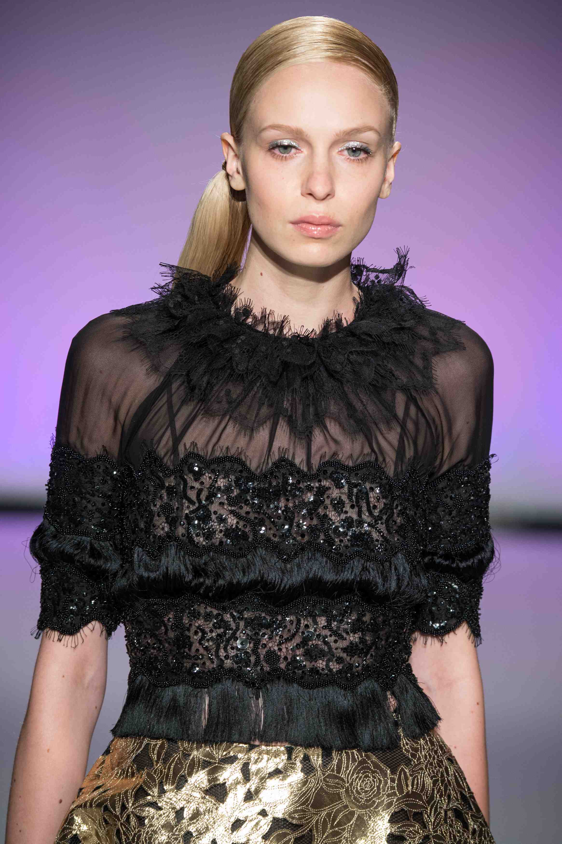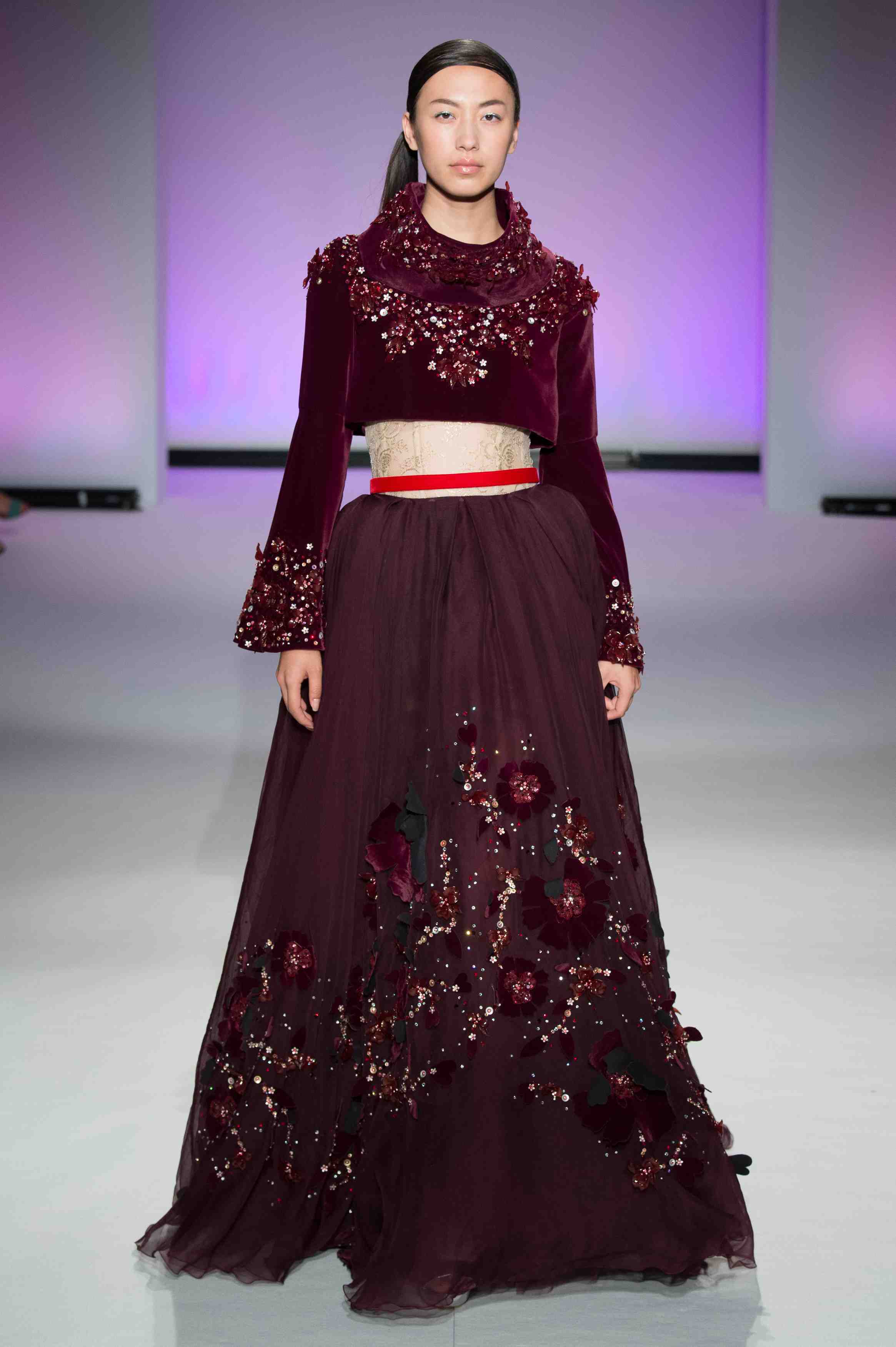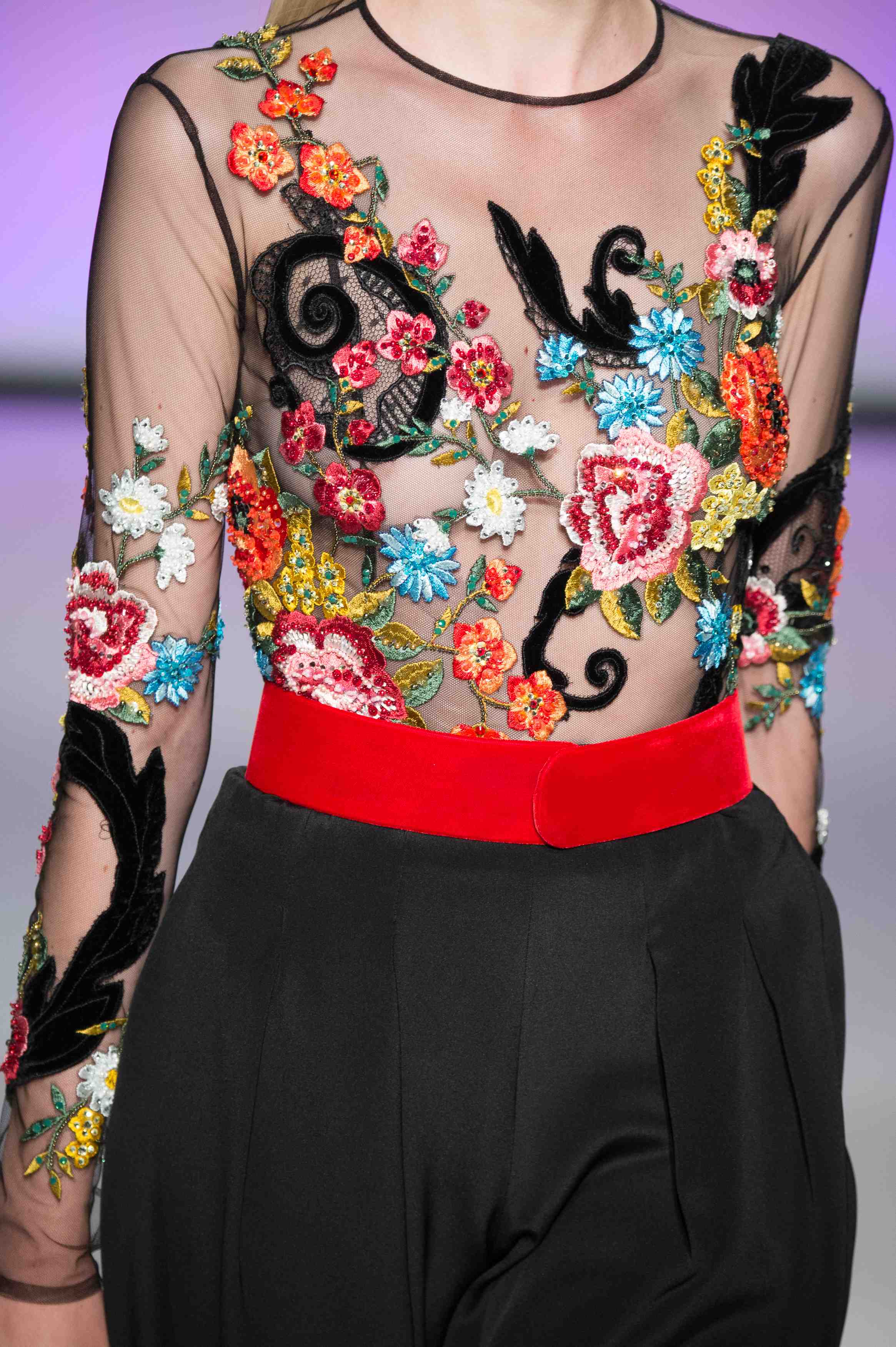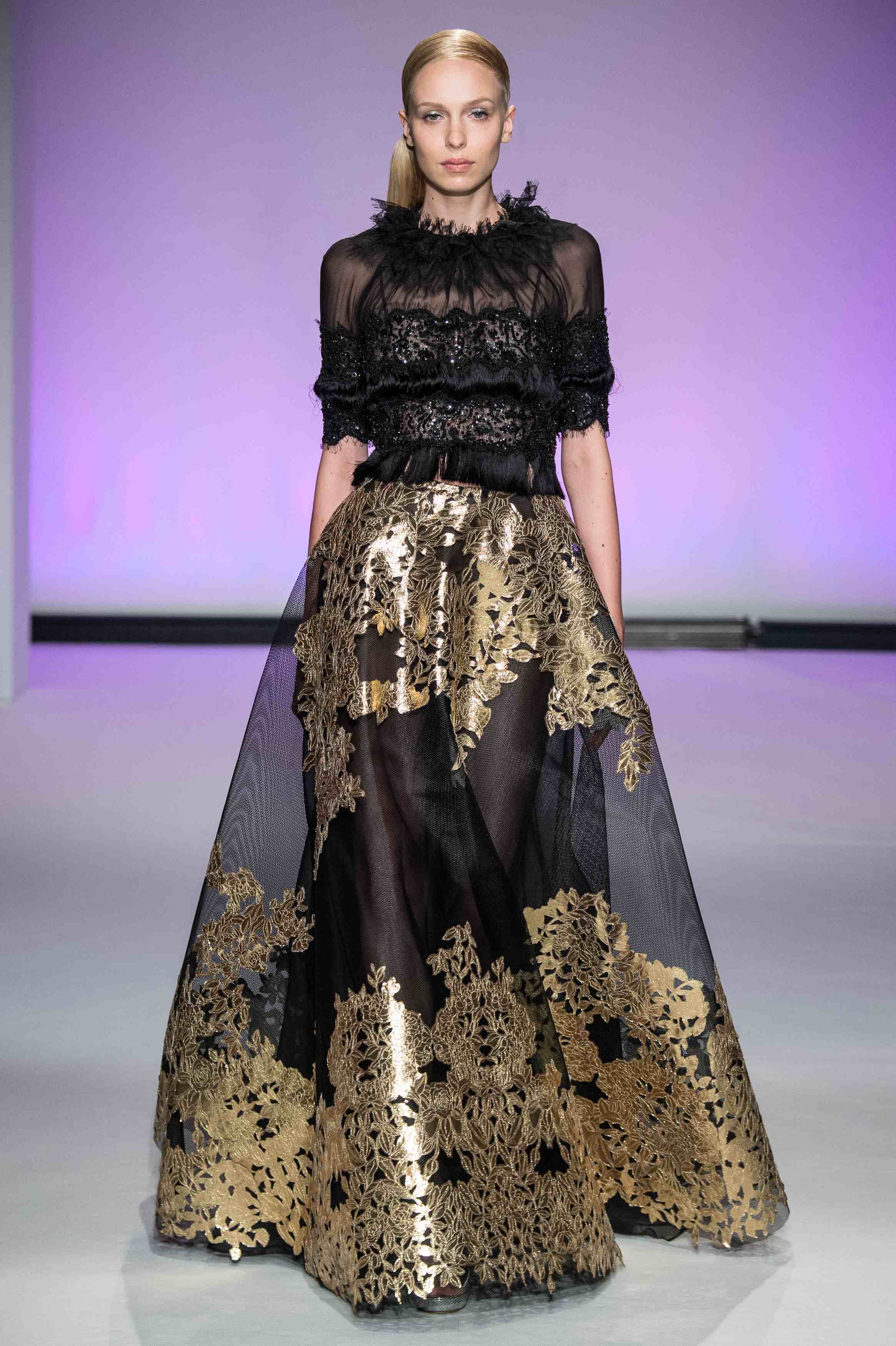 Au remix d’air empreint du temps de la royauté, d’une époque de danse dans les salons dorés des palais , Dany Atrache propose une farandole de voiles et de broderies légères, qui tournent au bordeaux et noir la nuit venue. Le créateur qui déclare s’être inspiré de la monarchie romaine, ne propose en rien des robes ,vestiges de ce prestigieux passé. Les transparences et les longueurs ont été revue dans des airs radicalement modernes. C’est la rencontre entre les robes au large jupes en A , des nobles et l’allure élancée des nymphes mystiques qui enchantaient les histoires échangées entre deux danses.