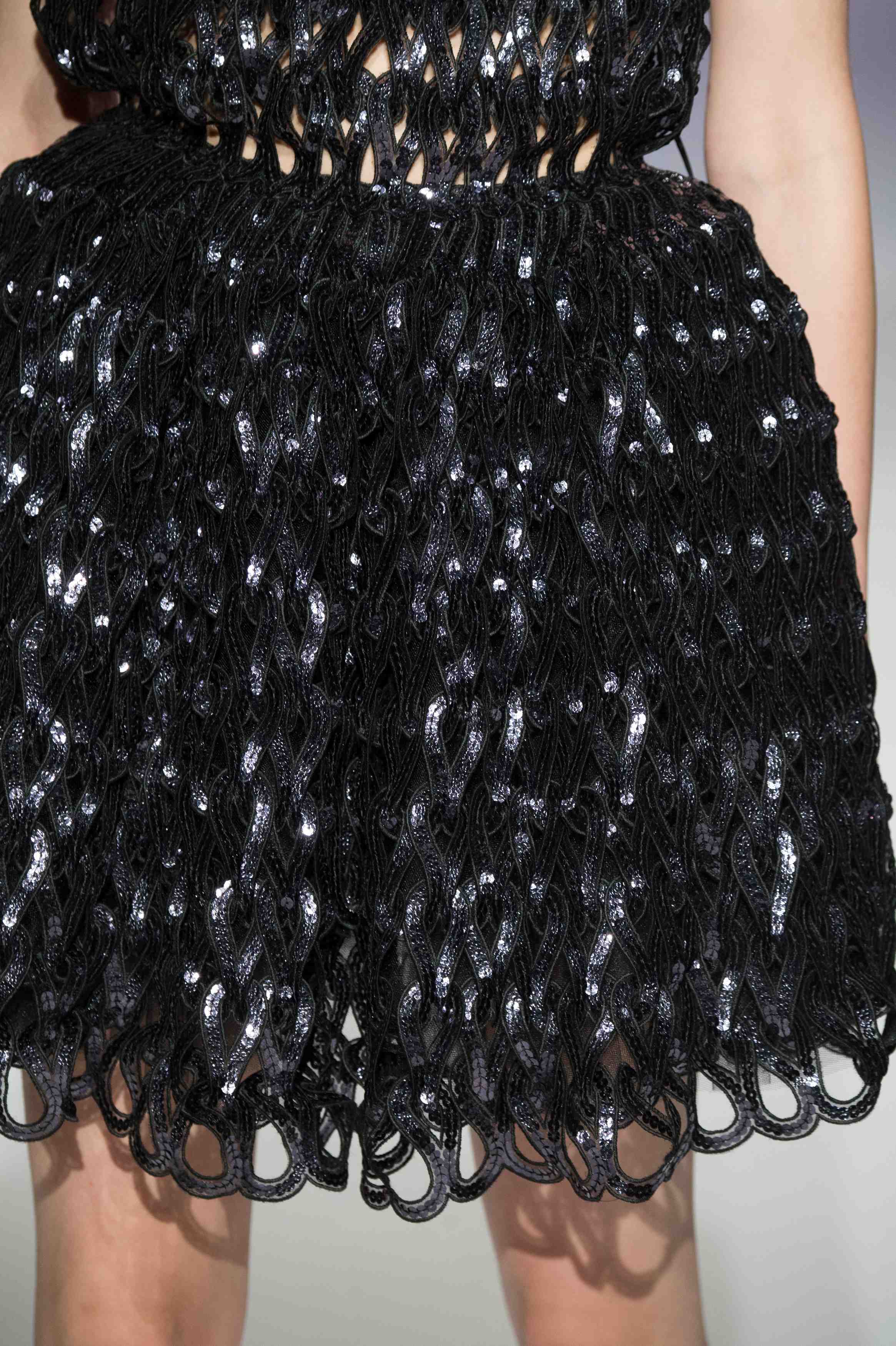 D’un violet fleuri à un noir profond, un noir étoilé de touche argenté ravivant les ciels d’été, Dany Atrache travaille le velours, le crêpe de soie, la giuipure ou encore la dentelle de manière à la fois traditionnelle et originale. Les modèles cousus mains sont parfois réinterprétés par des découpes lasers. Technique à la pointe de la modernité, permettant des découpes graphiques sortant des champs battue. Une technique de plus en plus utilisée par les créateurs, pour donner à des silhouettes, a priori classiques, une malicieuse modernité, les inscrivants dans les danses de leur temps.