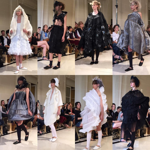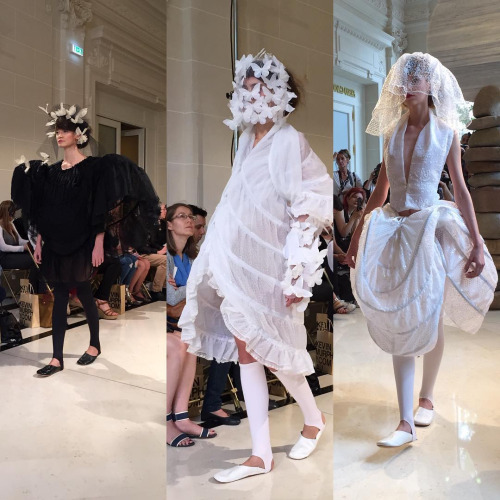 Entre blanc et noir, les mannequins sont comme des souffles aériens sur le podium. Chaussé de délicates ballerines, les matières fines et précieuses sont combinés à des structures rigides, afin de créer l’illusion d’une mue que des ailes tendent à percer.