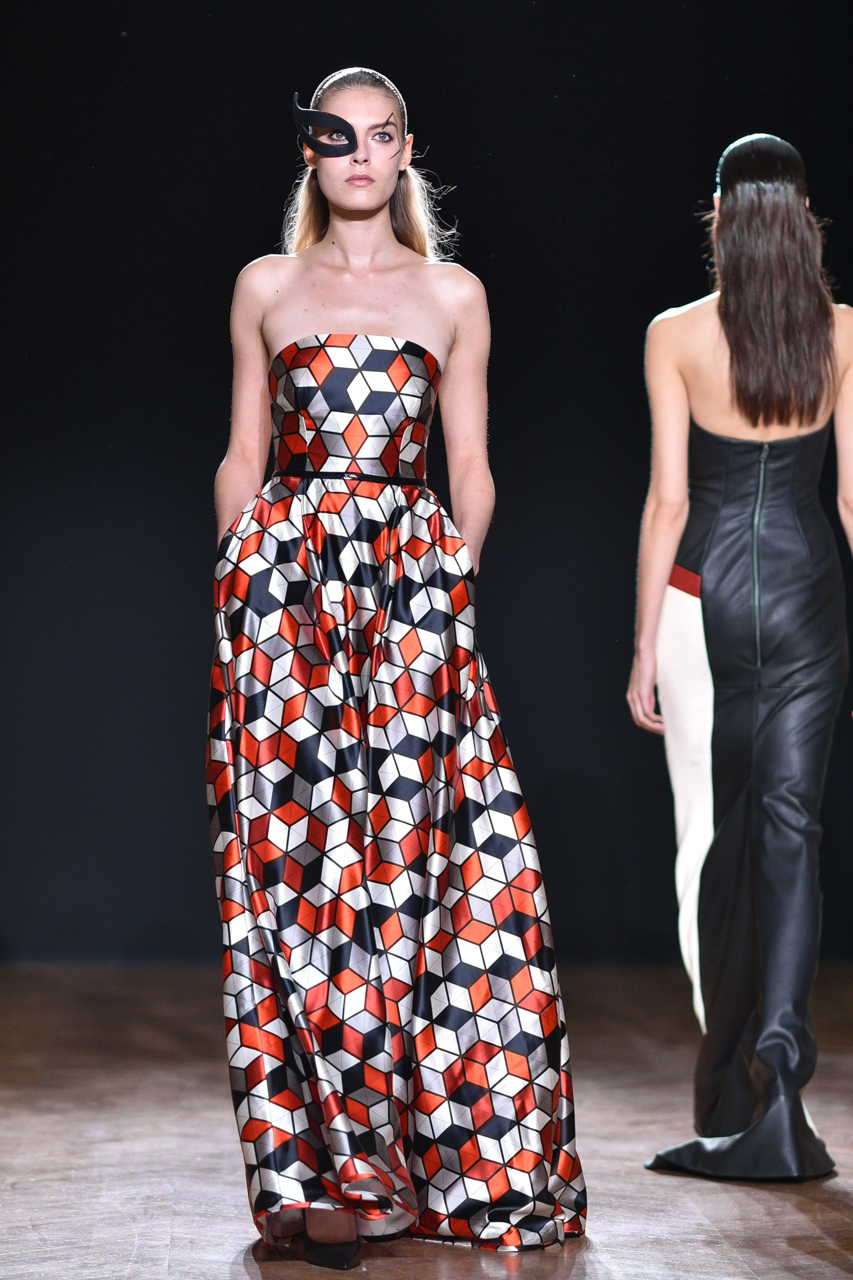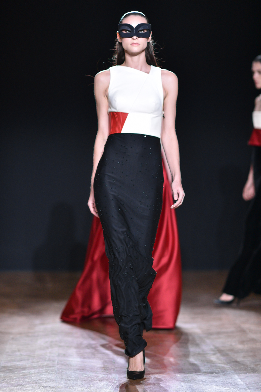 De rouges et de noirs, les robes s’augmentent de pardessus revisités : comme un manteau mi trenchcoat, mi-bomber ou encore un boléro en cuir dont les revers donnent des allures de capes. Femme super-héro, sa véritable identité reste un mystère. Mystère entretenue par les masques crées par Philip Treacy.