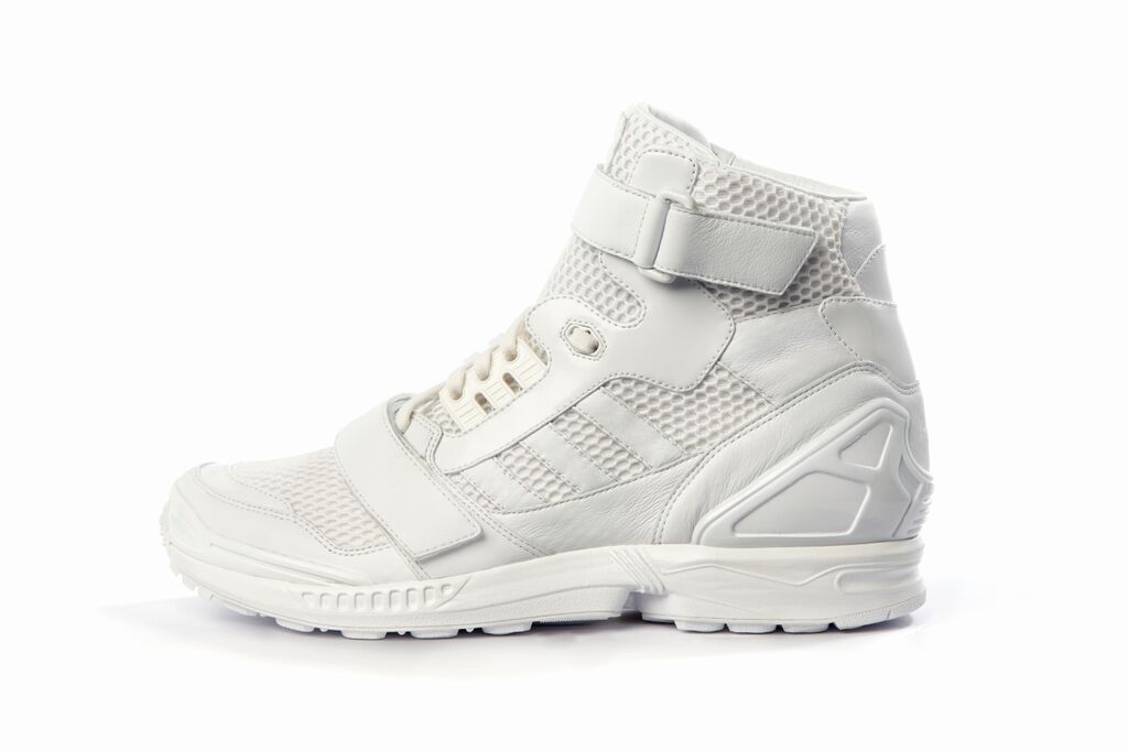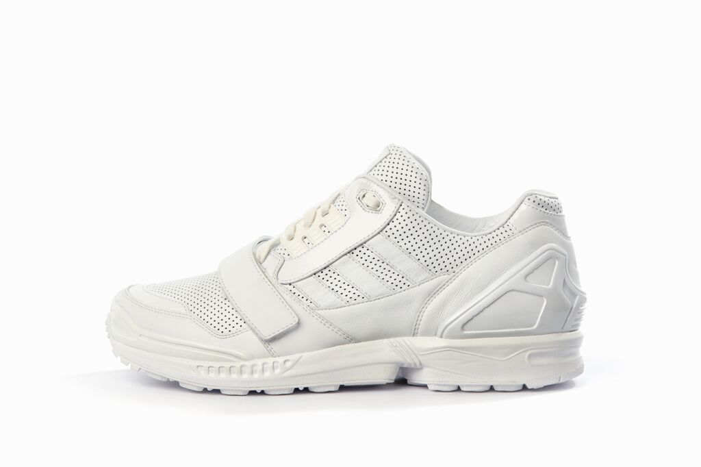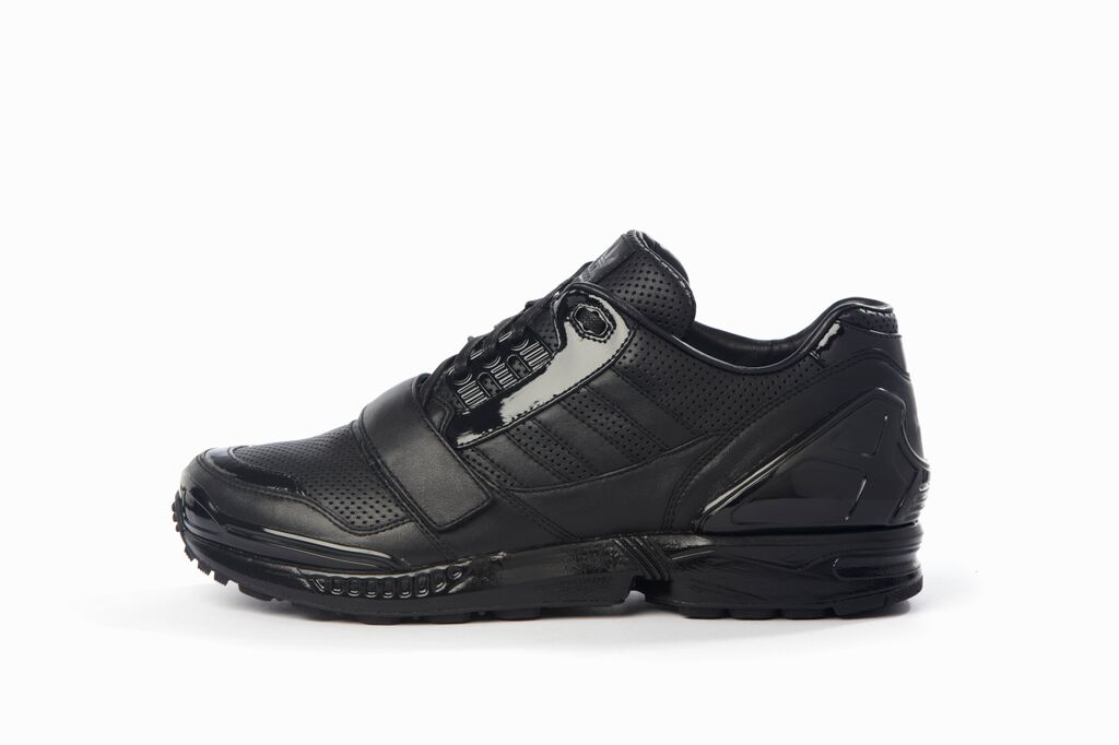 Pour Adidas, le jeune créateur décline le modèle ZX8000, qu’il adapte à l’esprit de sa collection : soit une structure dictée de manière militaire. Disponible depuis juillet en modèle bas ou montant, des scratchs ont été ajouté : un rappel à l’aspect pratique et l’esprit cadré de l’ambiance d’une exploration en milieu hostile. Plutôt que de reprendre le ton kaki, (dans une logique militaire) c’est un choix plus moderne qui est effectué: le minimaliste du blanc et du noir, avec des semelles aux tons brillants pour apporter un soupçon de luxe au modèle original.