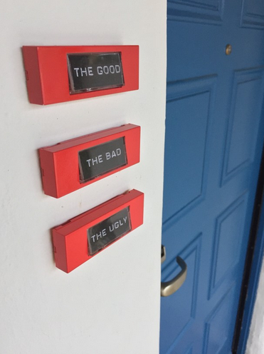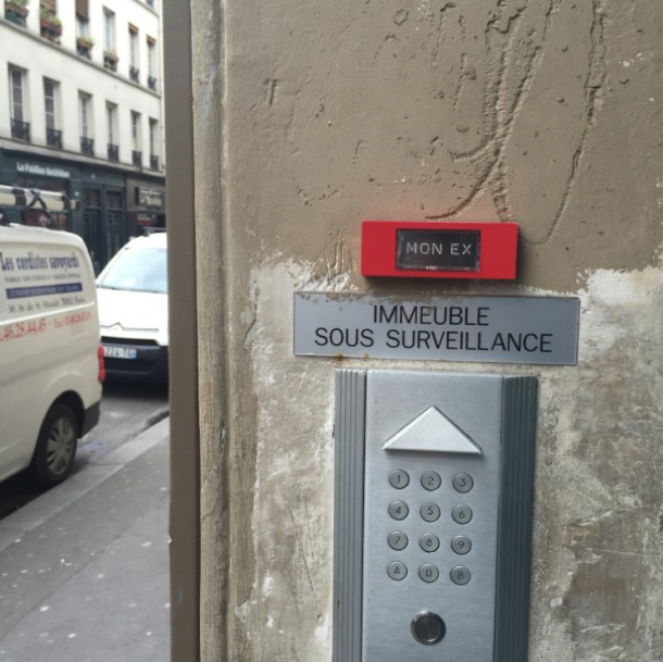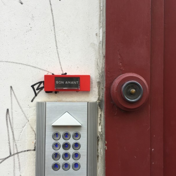 Sa spécialité? le seuil de notre porte – cet alcôve privilégié qui marque la frontière entre la sphère intime et la sphère publique. C’est en ce lieu stratégique, la barrière séparant le politiquement correcte de l’irrévérencieux, le formel du personnel que l’artiste intervient en apposant ses œuvres : des sonnettes d’un rouge criard, des boites aux lettres aux noms évocateurs, des missives écrites pour ré-inventer le réel, ou du moins le ponctué de poésie et d’humour.