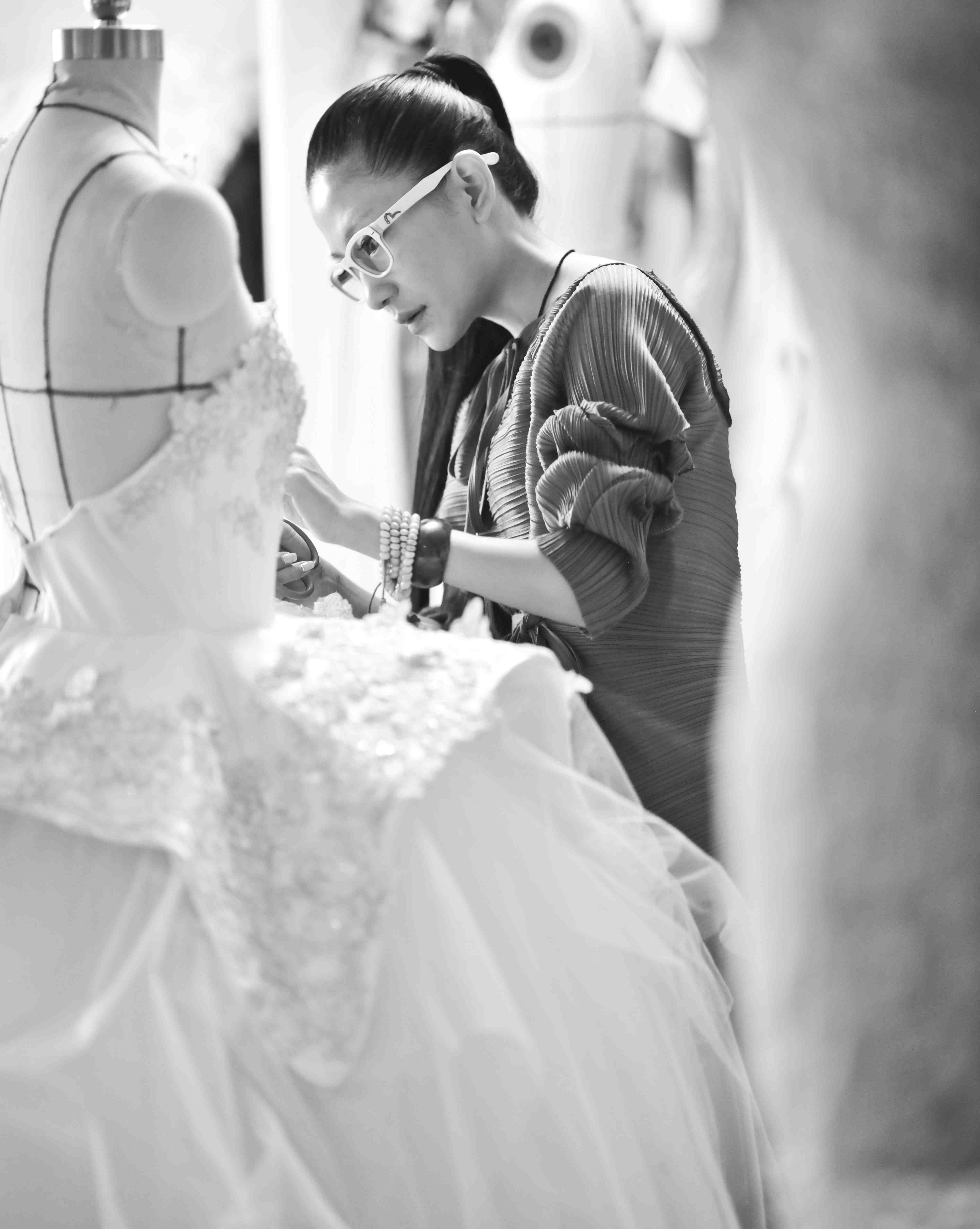 C’est de la rencontre de la broderie traditionnelle du Suzhou et de l’esthétique occidentale que naissent les collections de la jeune créatrice chinoise qui a lancé sa marque, il y a maintenant 10 ans. Pour ce défilé, c’est un honneur aux traditions qui est mis en scène : que ce soit dans les lumières du décor, la bande sonore ou la délicatesse des robes. Le public est amené dans un voyage à travers les campagnes chinoises, convié dans l’intimité des rites, la pudeur de la préparation au mariage.