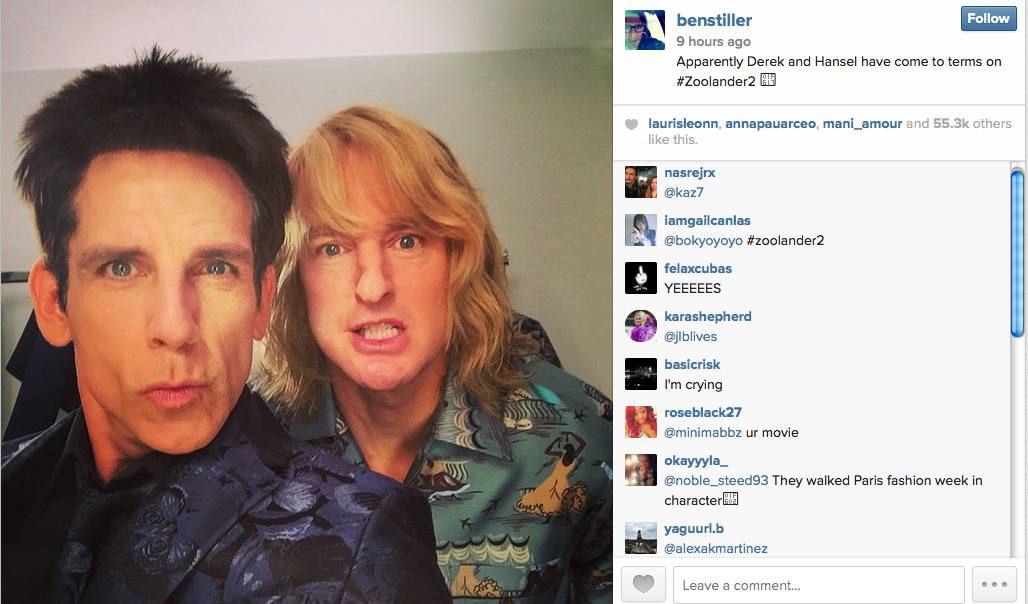 Pratiquement 15 ans après le premier film, Ben Stiller ressuscite Derek Zoolander. En effet, la nouvelle du tournage avait fait la une des médias : Ben Stiller et Owen Wilson avaient clos le défilé Valentino à la Fashion Week parisienne qui s’était tenu en mars. Le duo posa avec les mannequins, les créateurs et même Anna Wintour : incompréhension ? Non c’est juste le retour de Zoolander.