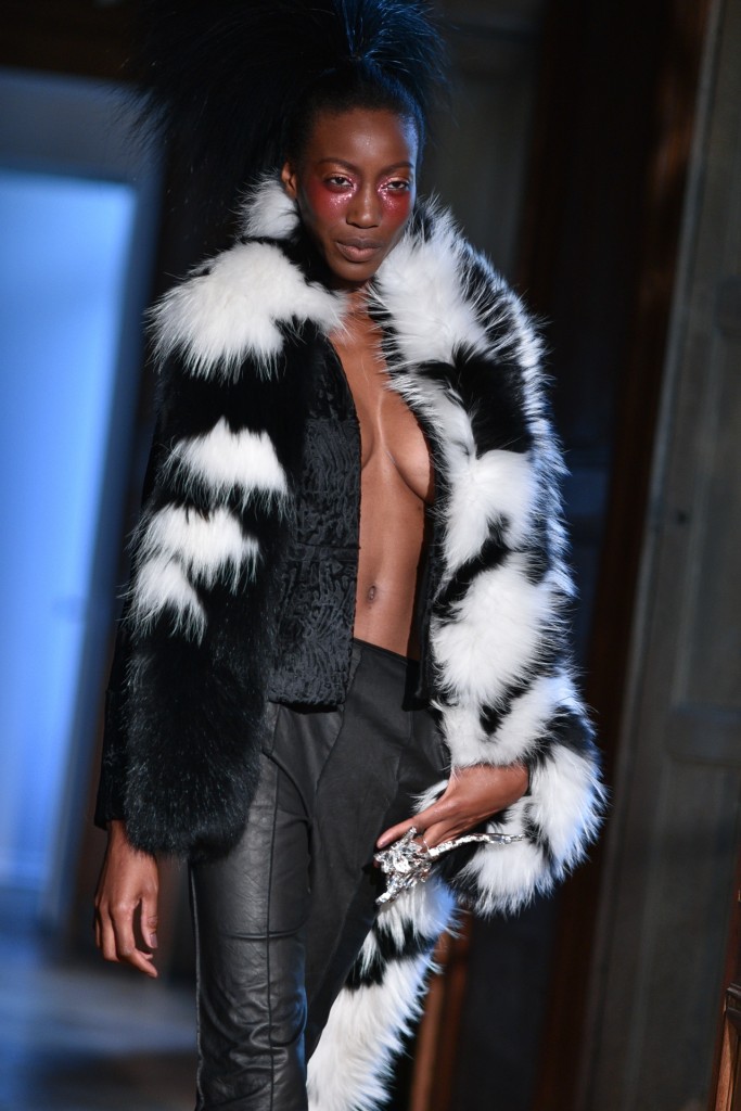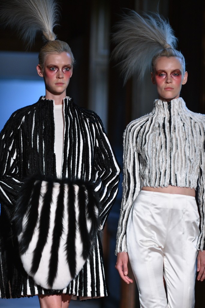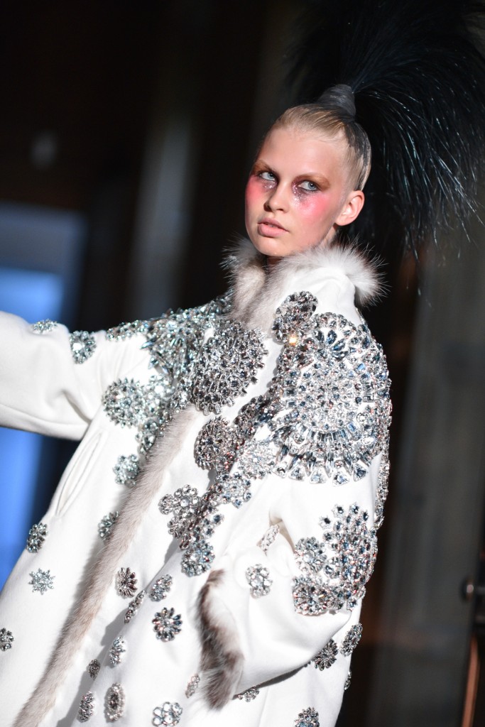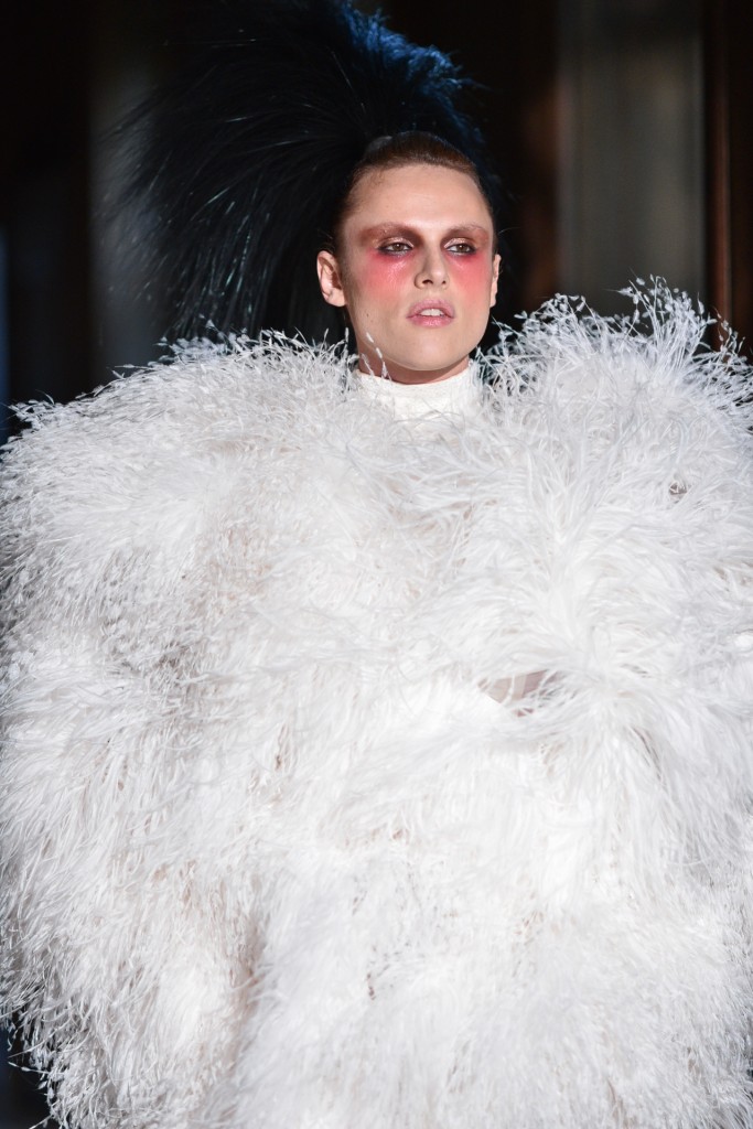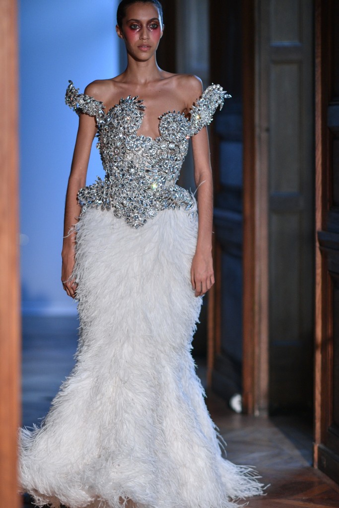 Serkan Cura est sans doute un des secrets les moins bien gardé de la Fashion Week parisienne, saisons après saisons Serkan impose sa mode créative et décorée de plumes magnifiques pour habiller ses oiseaux de nuits. Fidèle à son habitude cette collection spectaculaire est agrémentée de milliers de plumes de de cristaux swarovski. On retrouve d’énormes manteaux couverts de plumes, des jupons en tulle de soie, des corsets brodés de Swarovski. L’excentricité et la folie créative au service de la couture.