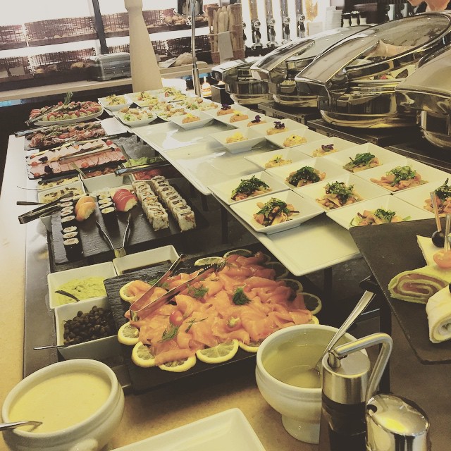 Le buffet est composé d’un large choix de viennoiseries, pains, comptoir de charcuteries espagnoles, bar à salades, sélection de sushis et makis, comptoir de fromages affinés, trio de poissons fumés, bar à jus de fruits et bien d’autres délices. Vous pourrez aussi déguster des mets chauds tels que filet de bar grillé et sauce vierge, le tournedos de veau, les macaronis à la truffe et des mini hamburgers pour le plus grand plaisir des enfants. Nos Chefs vous accompagneront dans la création de vos omelettes et crêpes sucrées. Pour finir en douceur, notre Chef pâtissier vous fera découvrir sa sélection de desserts et sa fontaine de chocolat.