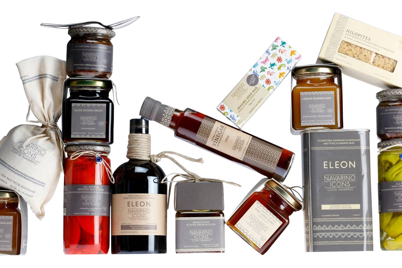 La gamme Navarino Icons se décline en plusieurs produits : huile d’olive extra vierge, olives de Kalamata, confitures de fruits maisons, biscuits à l’huile d’olive extra vierge et à l’orange, miel de fleurs sauvages, vinaigre au romarin et au thym, sel aromatisé au romarin, fruits confits régionaux, poivrons rouges grillés, mini poivrons verts et concassés d’aubergines grillées. Tous ces produits culinaires révèlent les richesses naturelles de la région, qui a toujours fait partie intégrante de la culture et de l’économie de la Messénie.