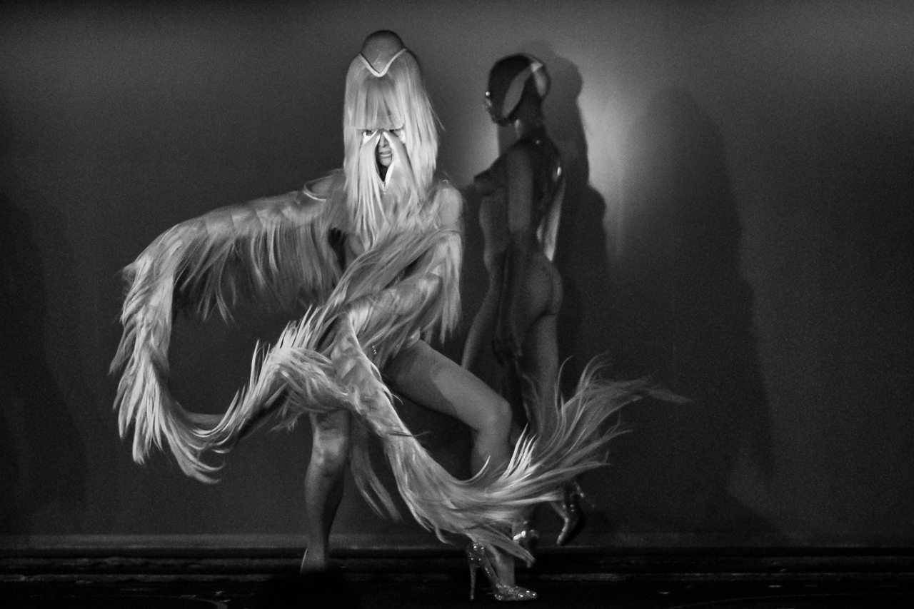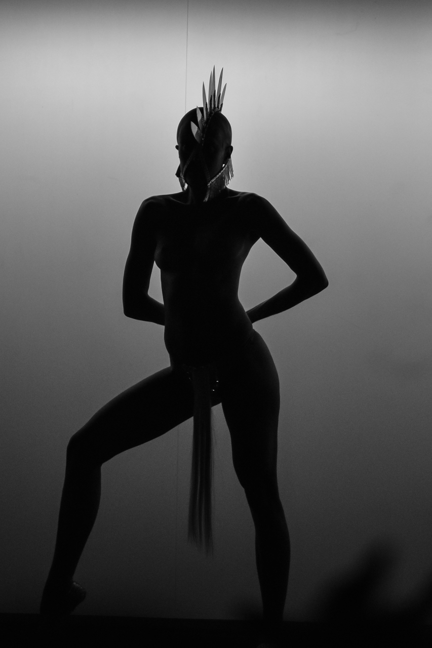 C’est dans le temple du sexy, le Crazy Horse que nous accueillait l’enfant terrible de la couture et de la mode : Charlie le Mindu. Une collection sombre intitulée « male gaze », mouvement artistique des années 20 qui a inspiré Charlie pour cette collection sur le thème du look. Après le succès de son premier cabaret « Paris Hait Gris » à la Fondation Cartier, c’est une nouvelle fois un show de « Haute Coiffure » que nous découvrons. Une collection très érotique, sombre et vénéneuse.