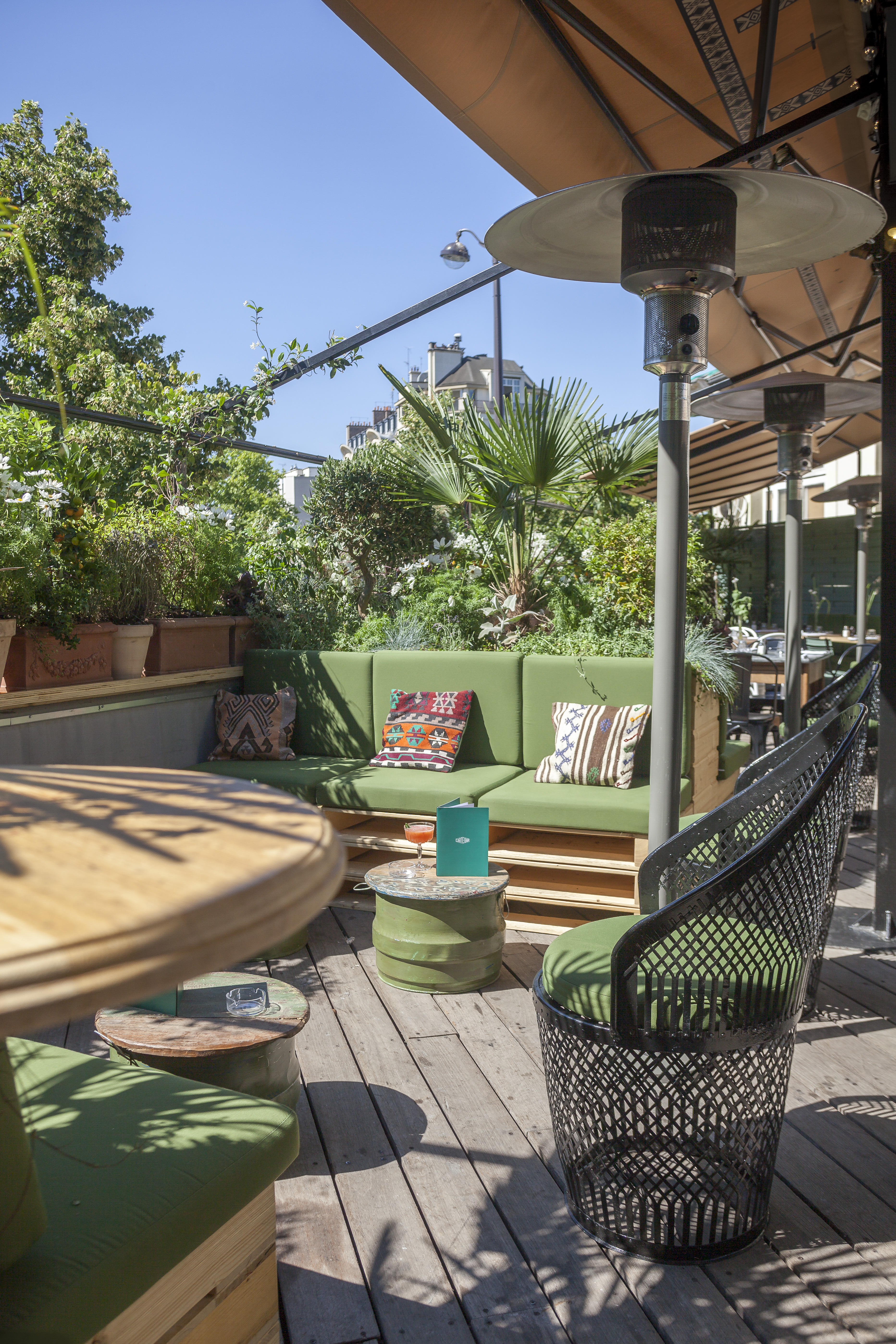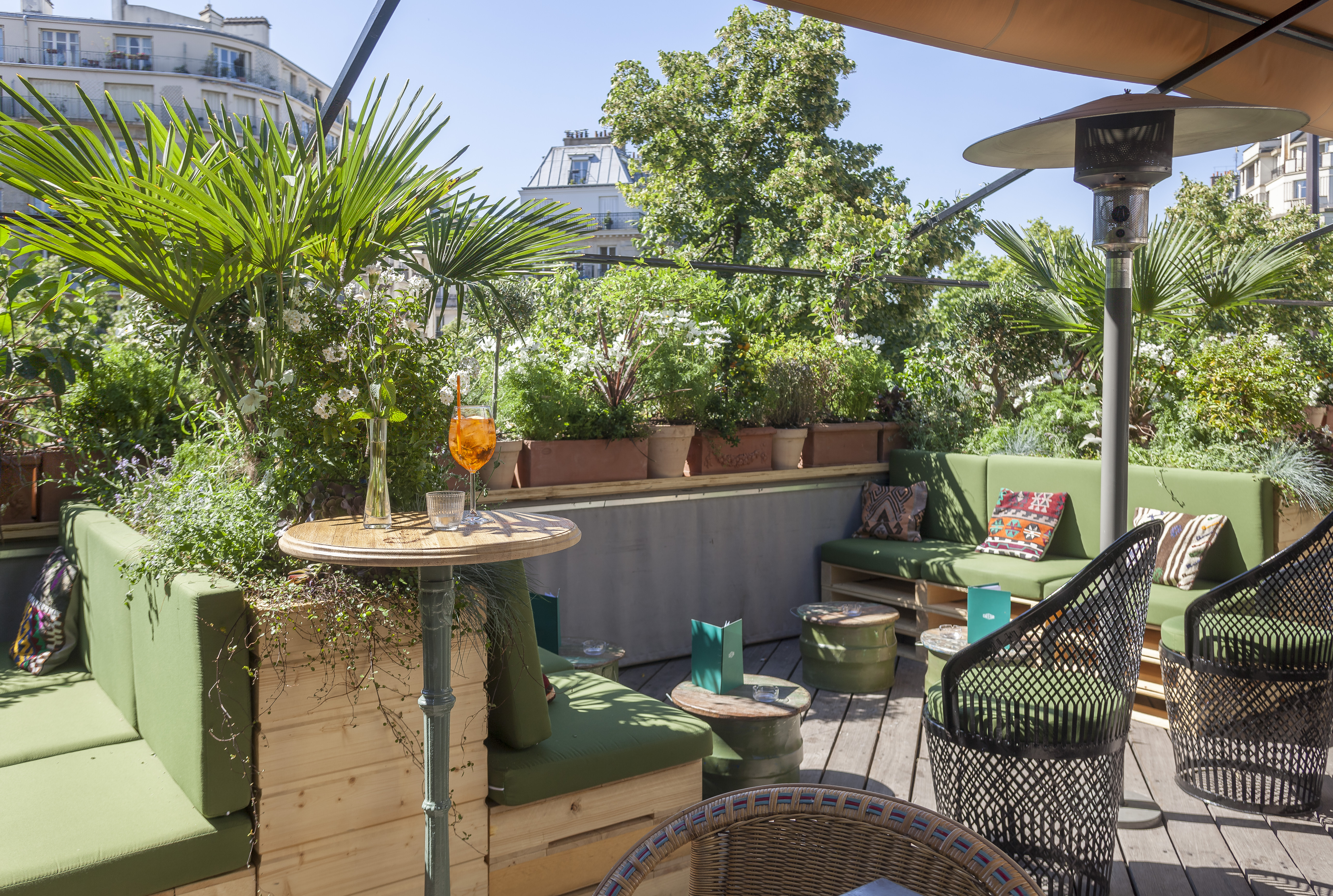 Sur le Rooftop, au milieu des orangers, pieds de vignes et herbes aromatiques, on s’installe sur les banquettes en bois pour une coupe glacée l’après-midi, un cocktail vintage à l’heure de l’apéritif ou simplement déjeuner ou dîner. On oublie tout, un verre de citronnade maison ou un Spritz à la main…