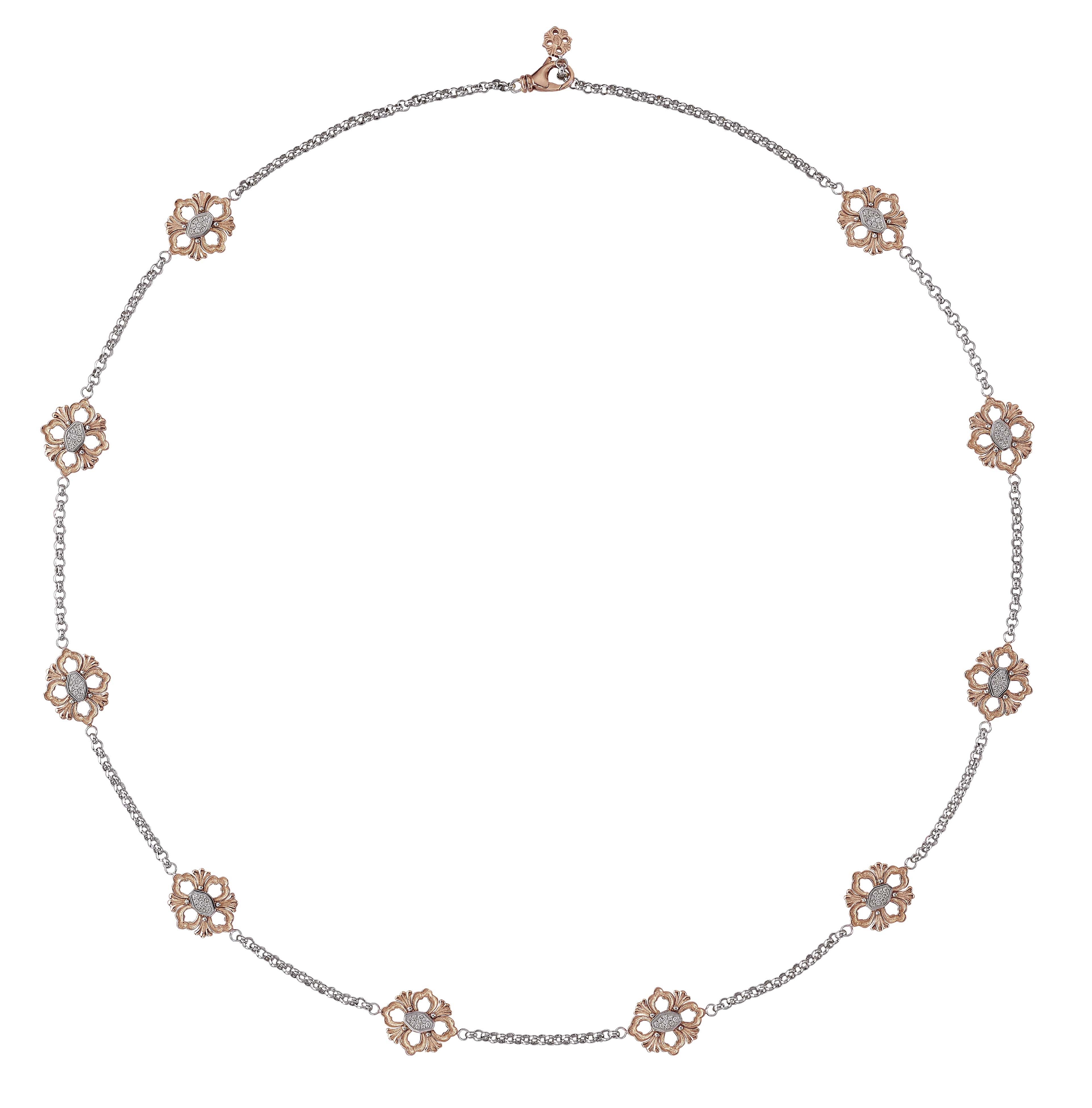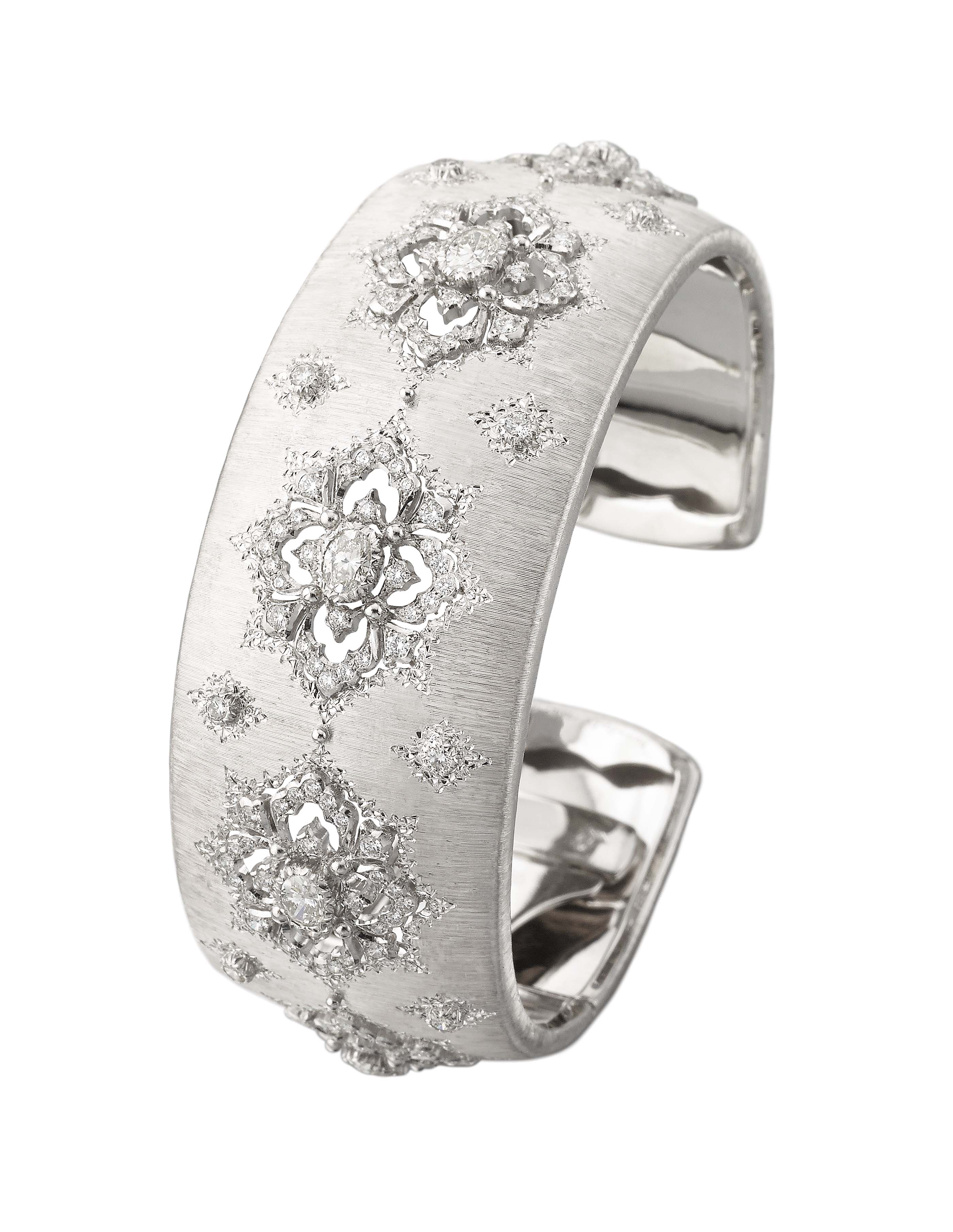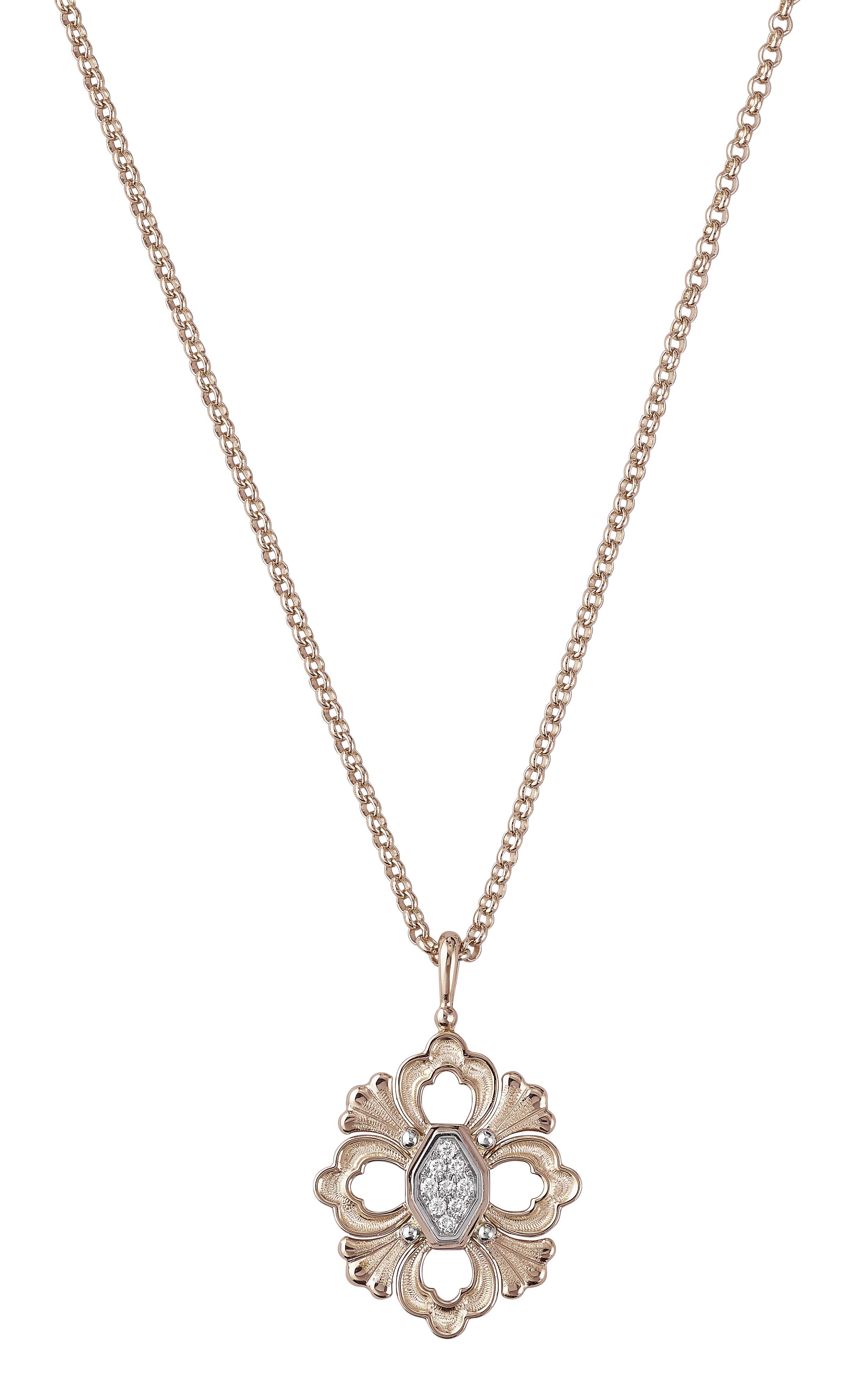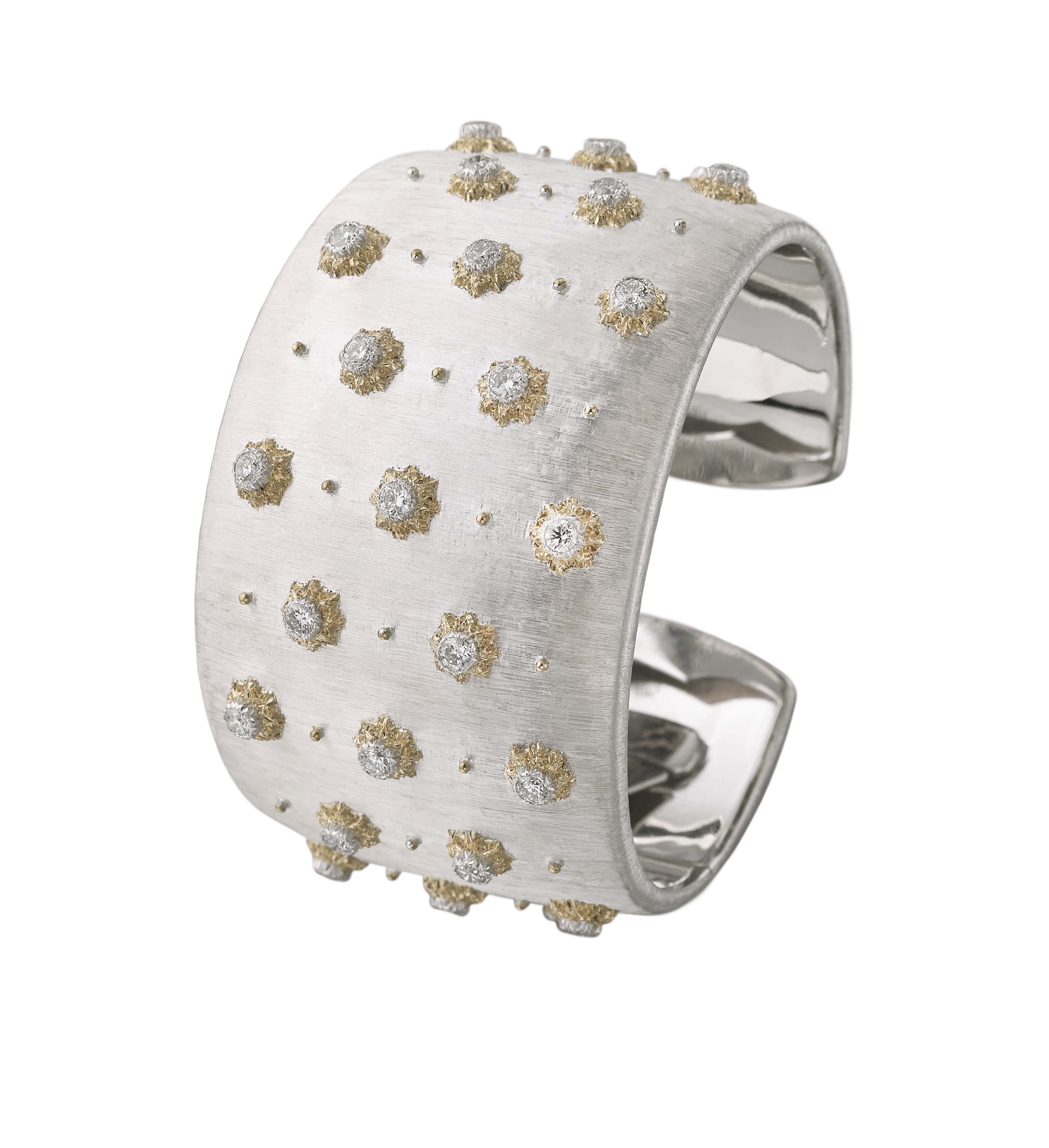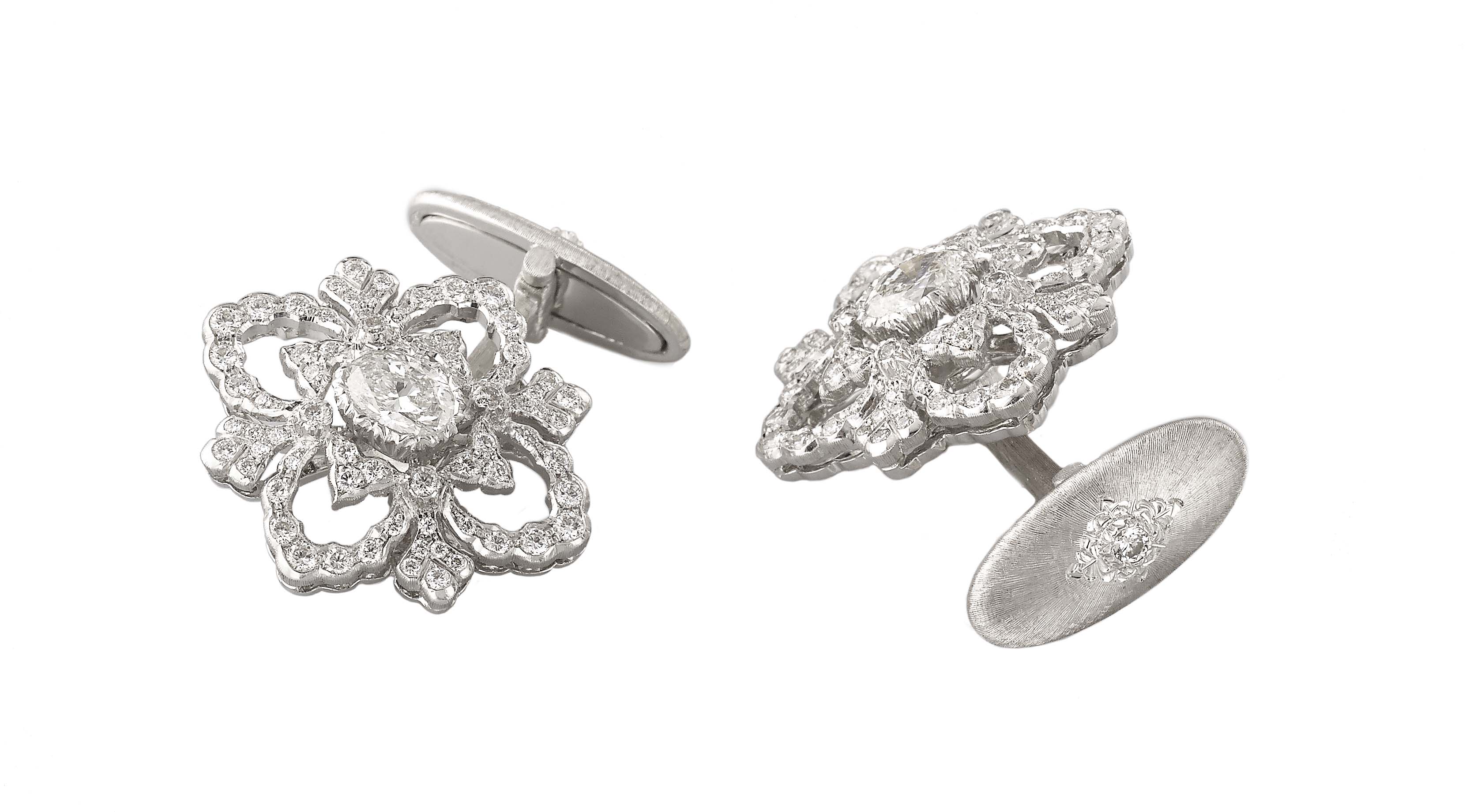 L’élément floral de la collection s’inspire du logo de la maison, qui rappelle l’aspect visuel de la coupole de l’église du San Carlino à Rome. Elle rappelle également la rosace située au-dessus de l’entrée principale du Château de Roccolo à Busca et les décorations qui surplombent les colonnes du Palais des Doges à Venise, puisant ainsi dans des courants artistiques qui sont une grande source d’inspiration pour Buccellati, du style de la Renaissance au style gothique vénitien, en passant par le néo-médiéval.