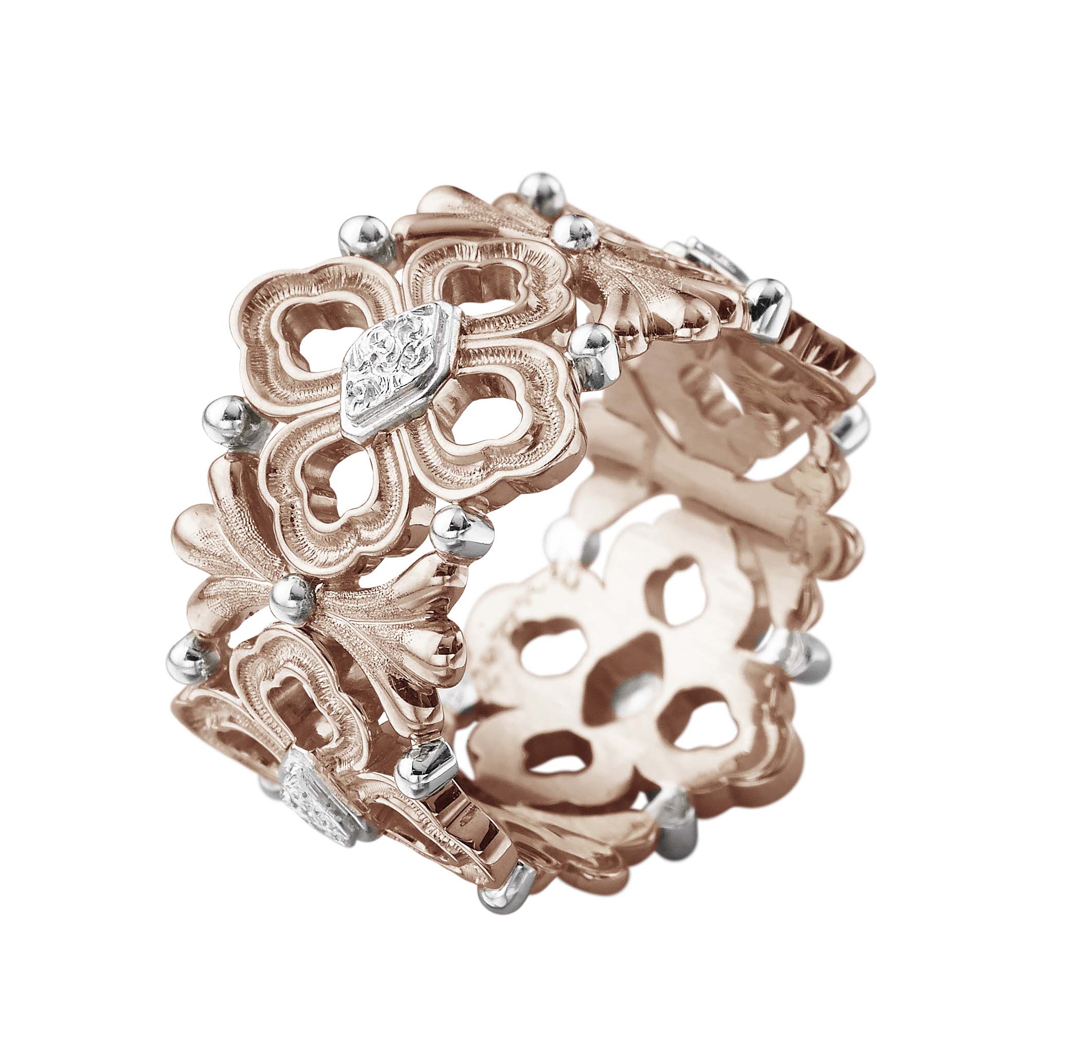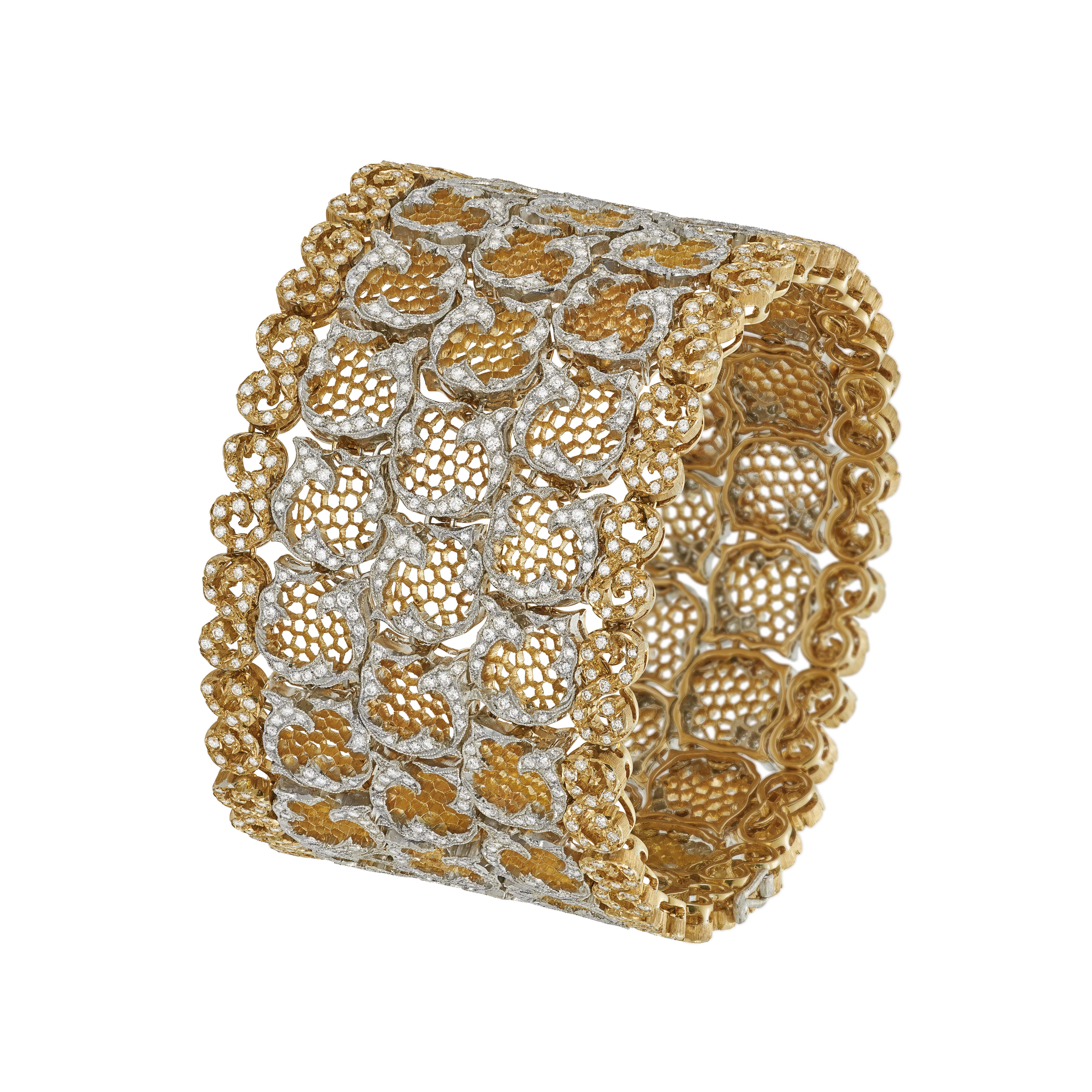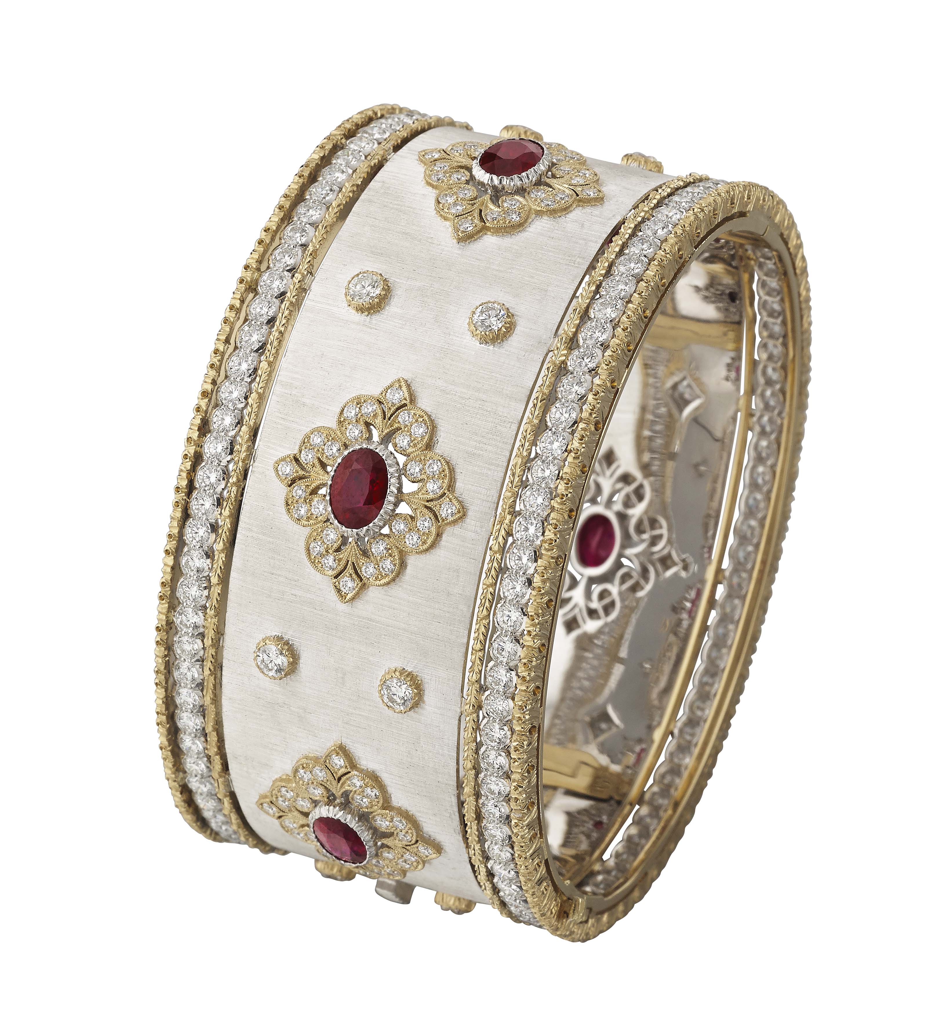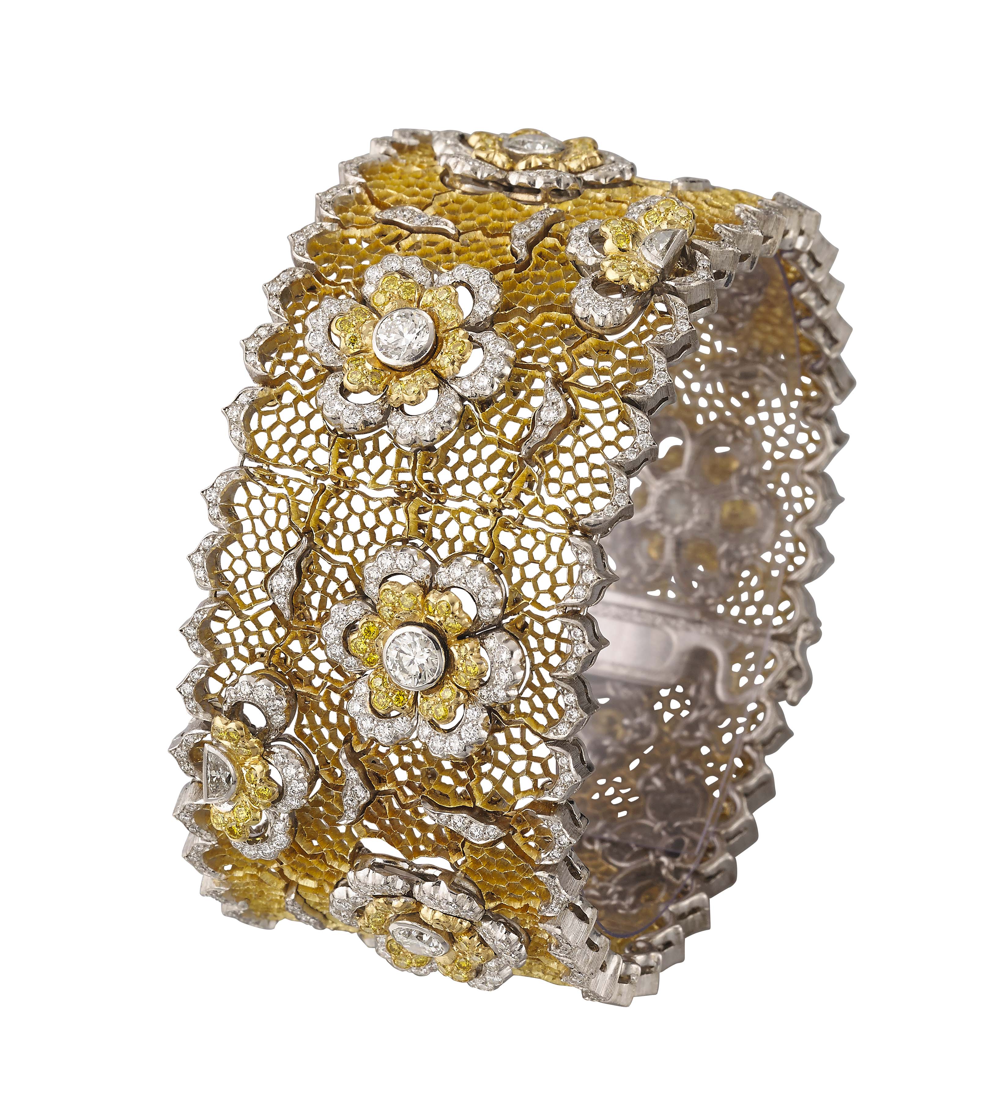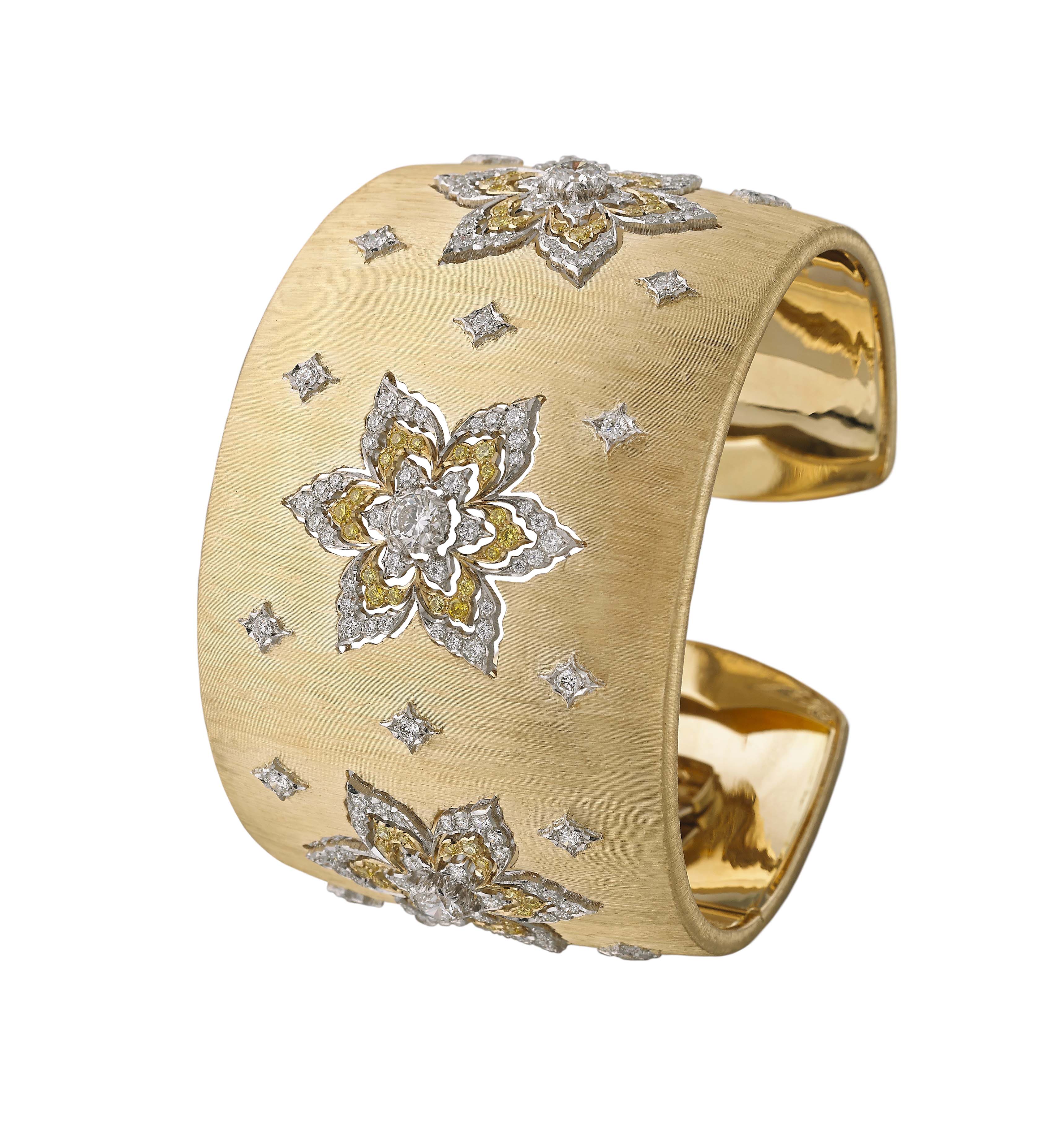 L’élément floral de la collection s’inspire du logo de la maison, qui rappelle l’aspect visuel de la coupole de l’église du San Carlino à Rome. Elle rappelle également la rosace située au-dessus de l’entrée principale du Château de Roccolo à Busca et les décorations qui surplombent les colonnes du Palais des Doges à Venise, puisant ainsi dans des courants artistiques qui sont une grande source d’inspiration pour Buccellati, du style de la Renaissance au style gothique vénitien, en passant par le néo-médiéval.