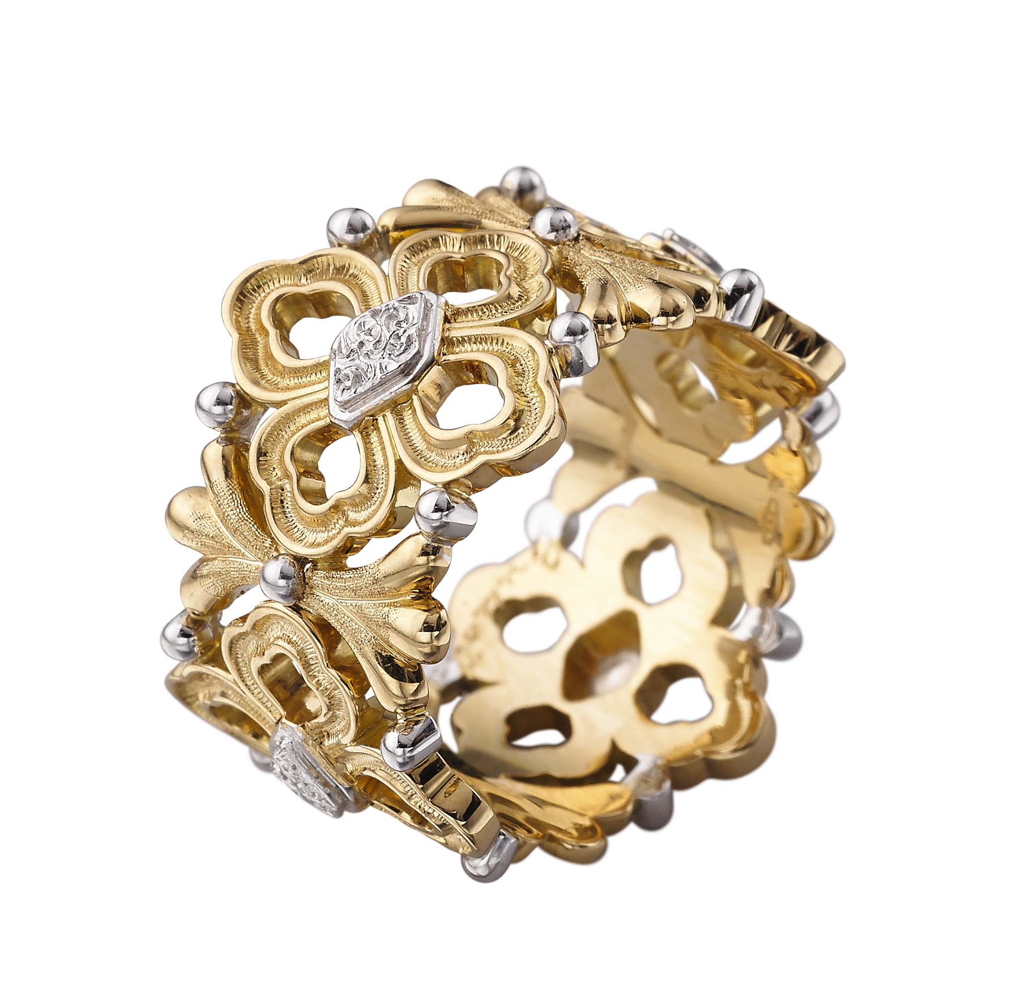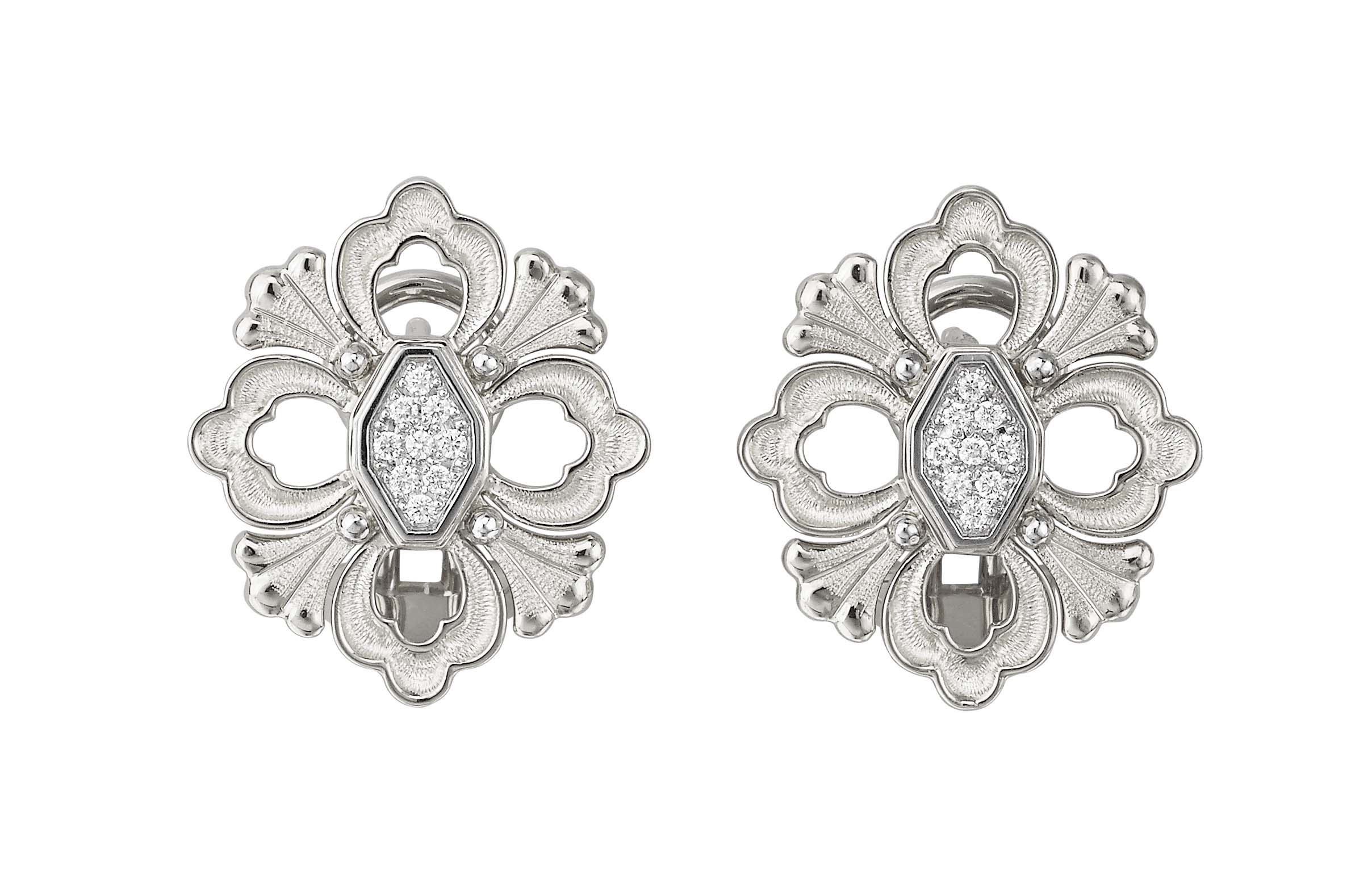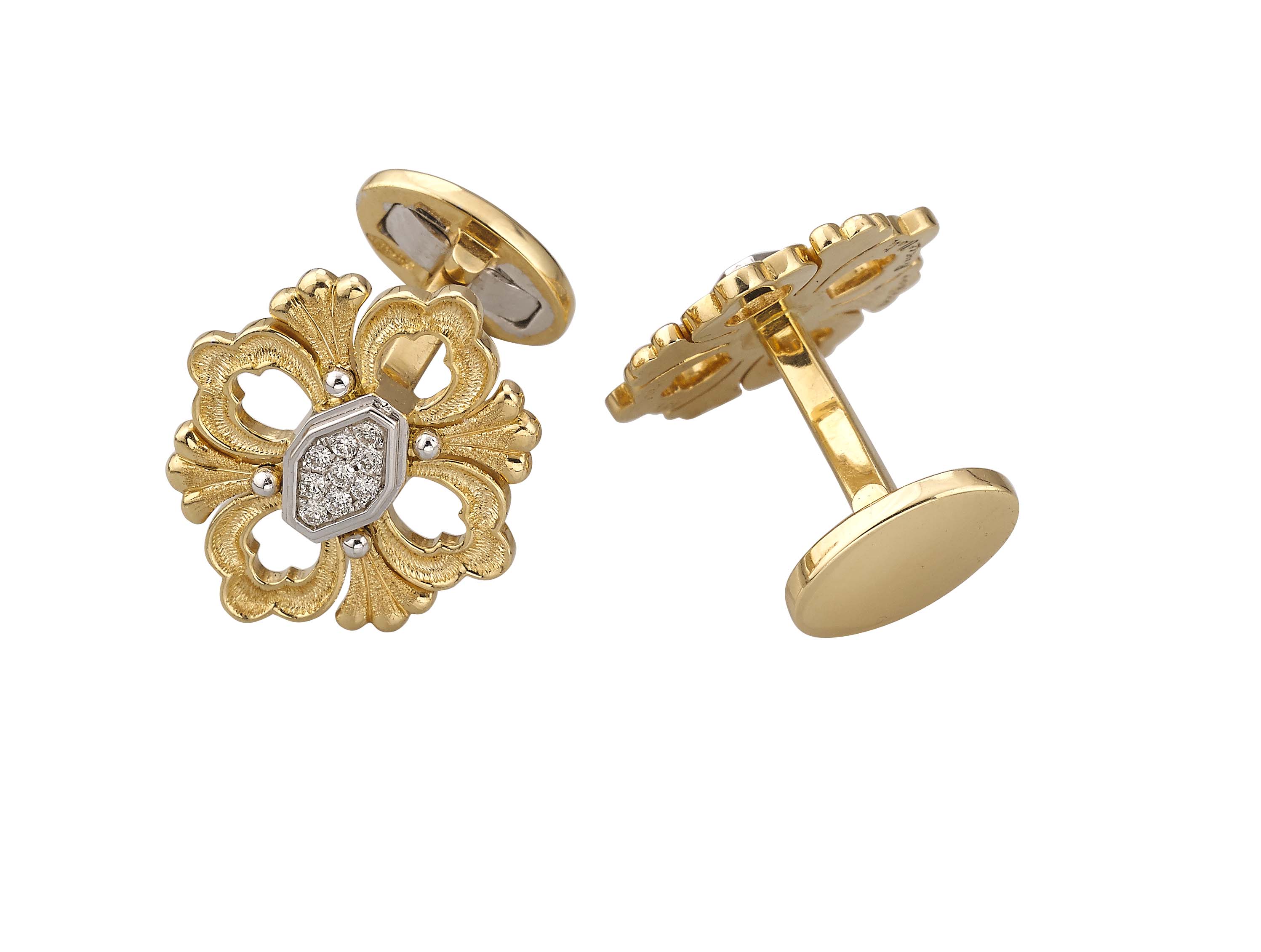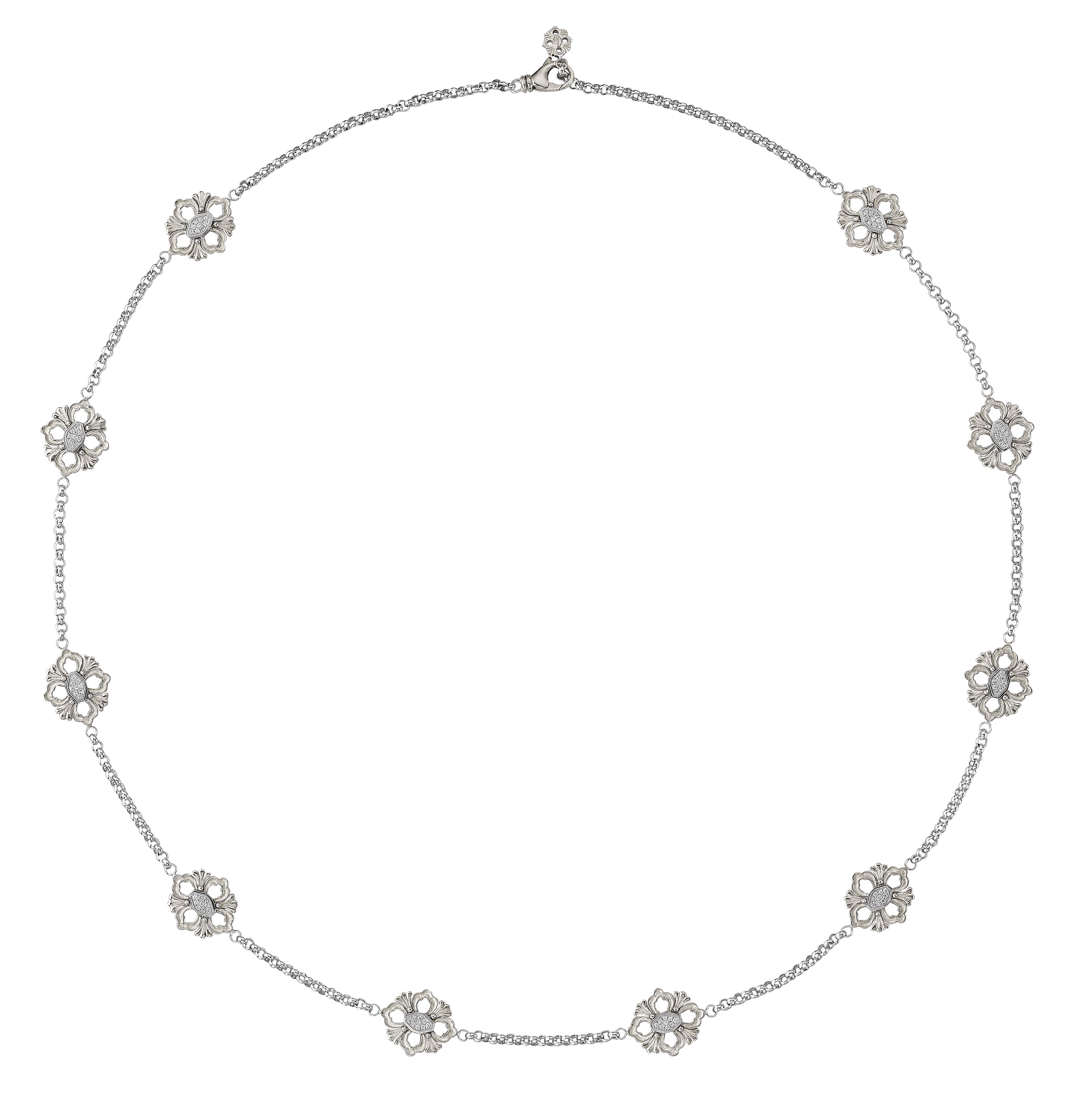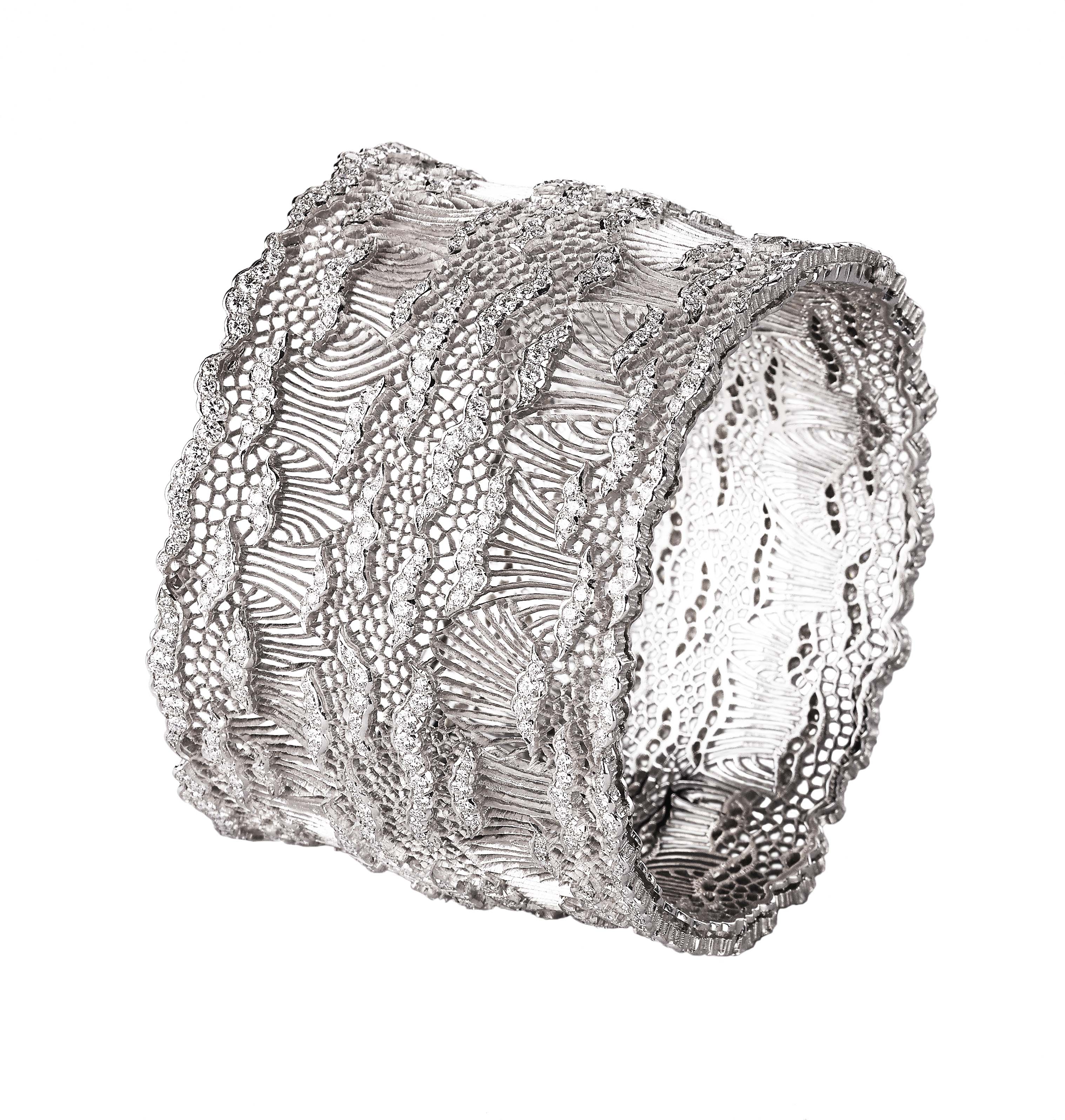 L’élément floral de la collection s’inspire du logo de la maison, qui rappelle l’aspect visuel de la coupole de l’église du San Carlino à Rome. Elle rappelle également la rosace située au-dessus de l’entrée principale du Château de Roccolo à Busca et les décorations qui surplombent les colonnes du Palais des Doges à Venise, puisant ainsi dans des courants artistiques qui sont une grande source d’inspiration pour Buccellati, du style de la Renaissance au style gothique vénitien, en passant par le néo-médiéval.