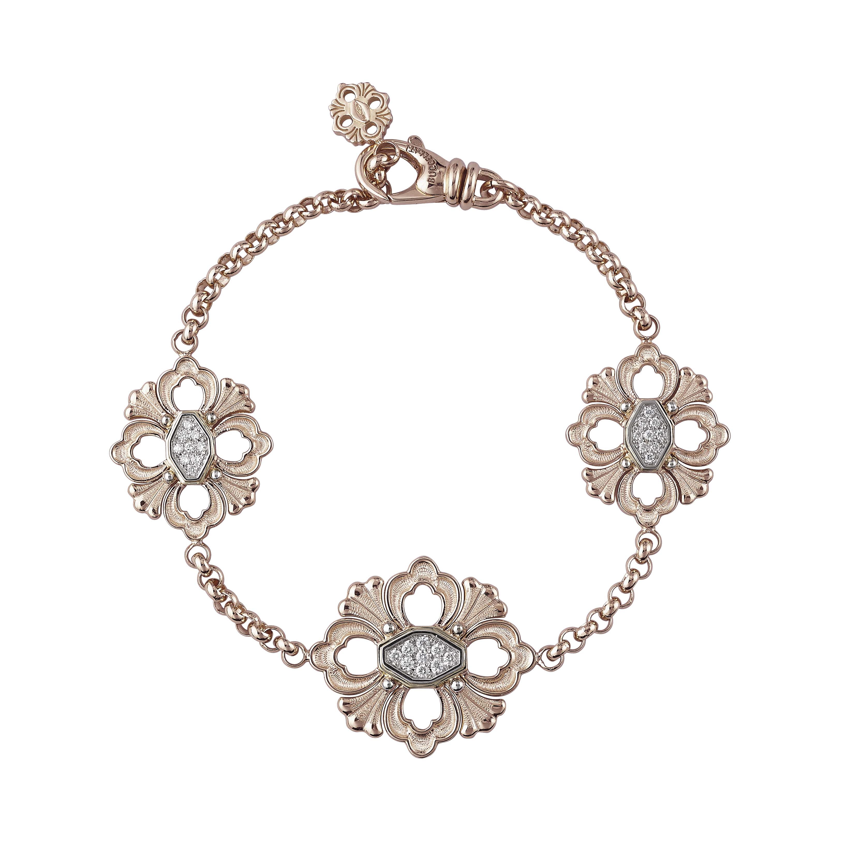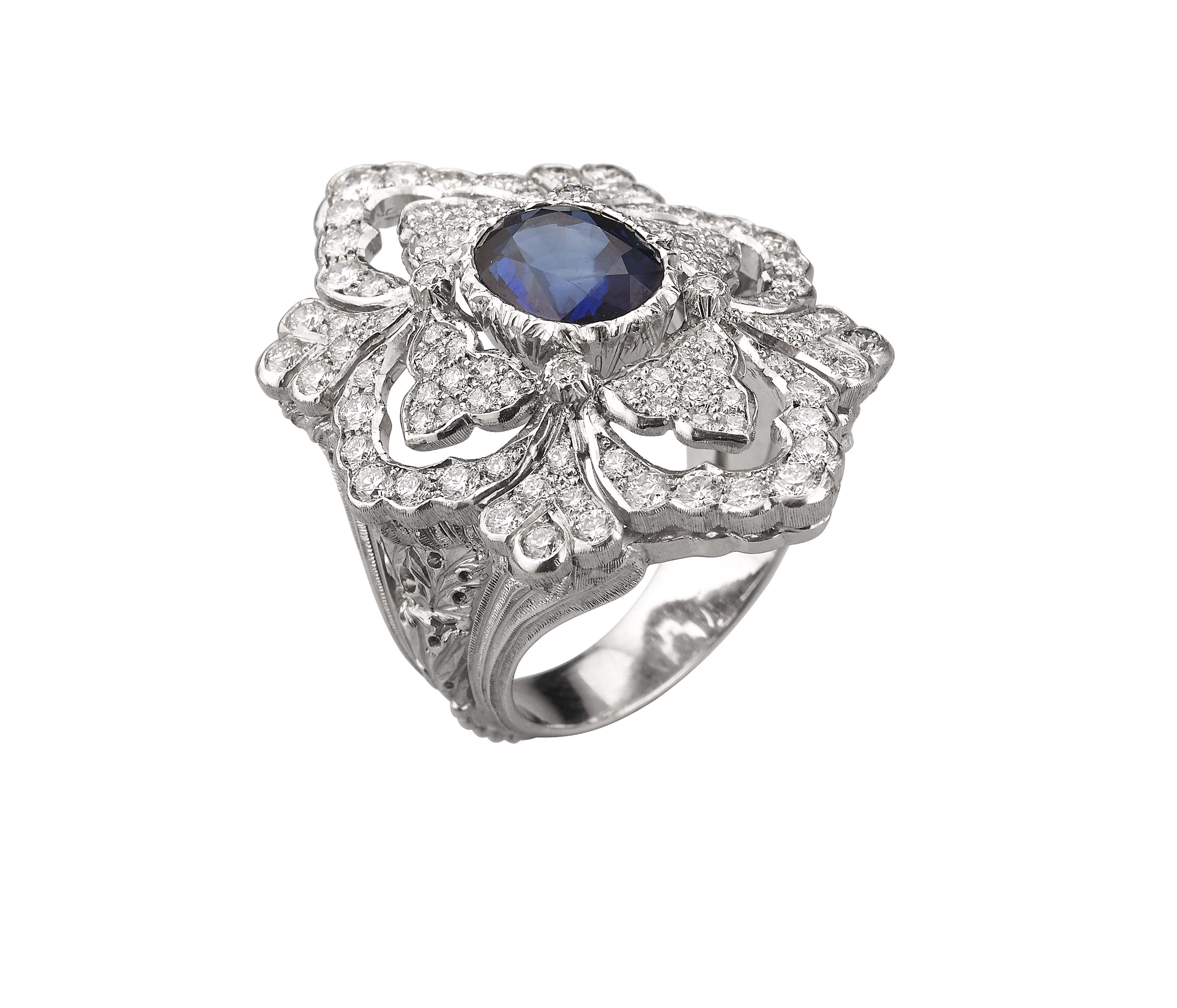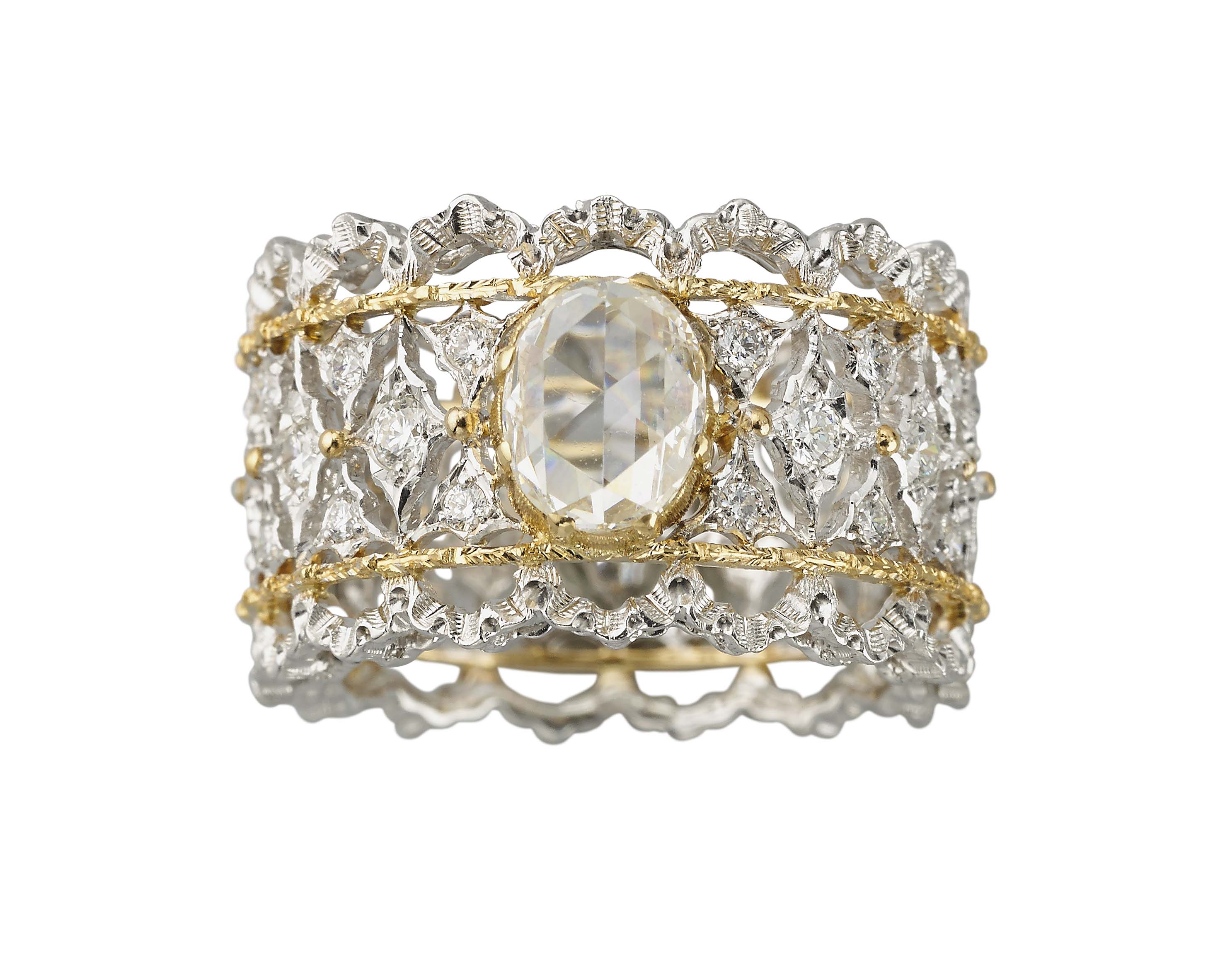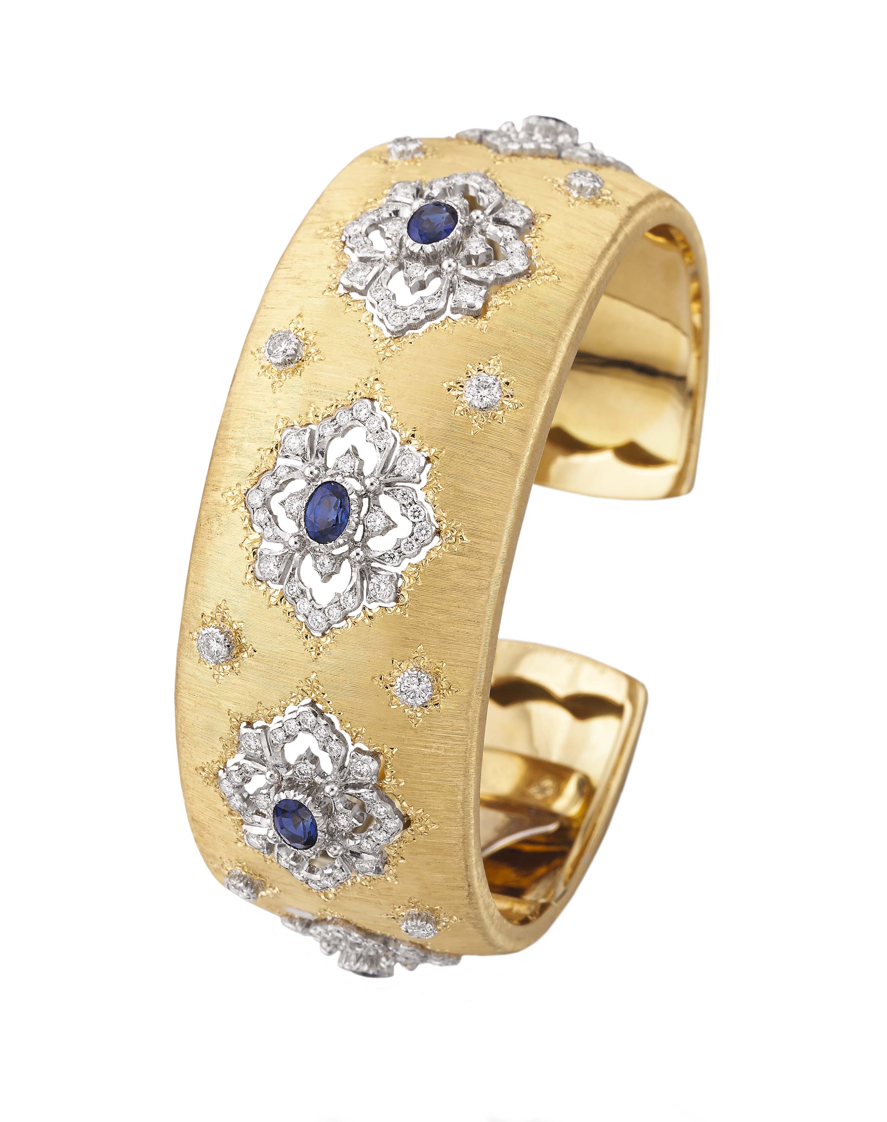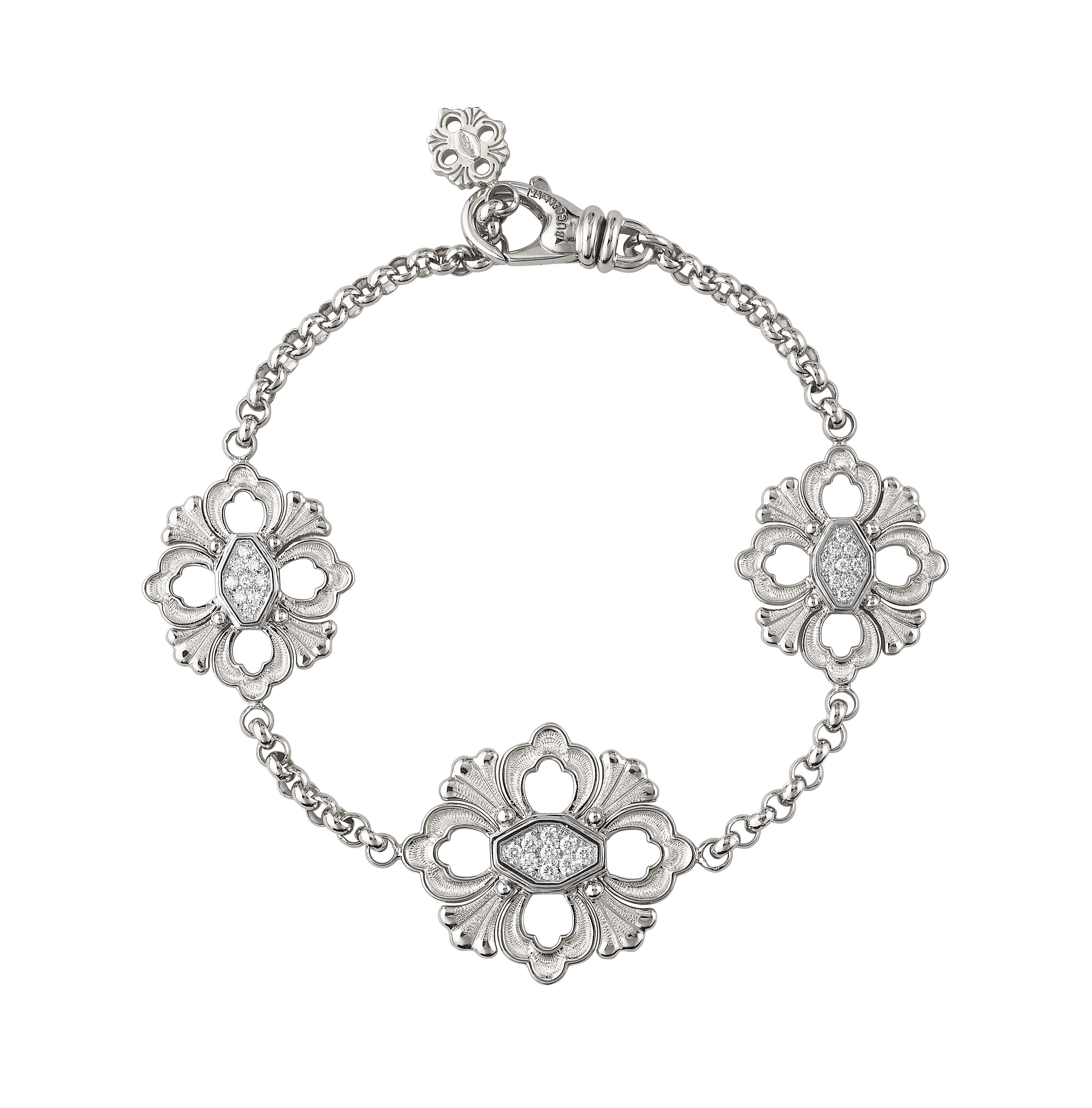 L’élément floral de la collection s’inspire du logo de la maison, qui rappelle l’aspect visuel de la coupole de l’église du San Carlino à Rome. Elle rappelle également la rosace située au-dessus de l’entrée principale du Château de Roccolo à Busca et les décorations qui surplombent les colonnes du Palais des Doges à Venise, puisant ainsi dans des courants artistiques qui sont une grande source d’inspiration pour Buccellati, du style de la Renaissance au style gothique vénitien, en passant par le néo-médiéval.
