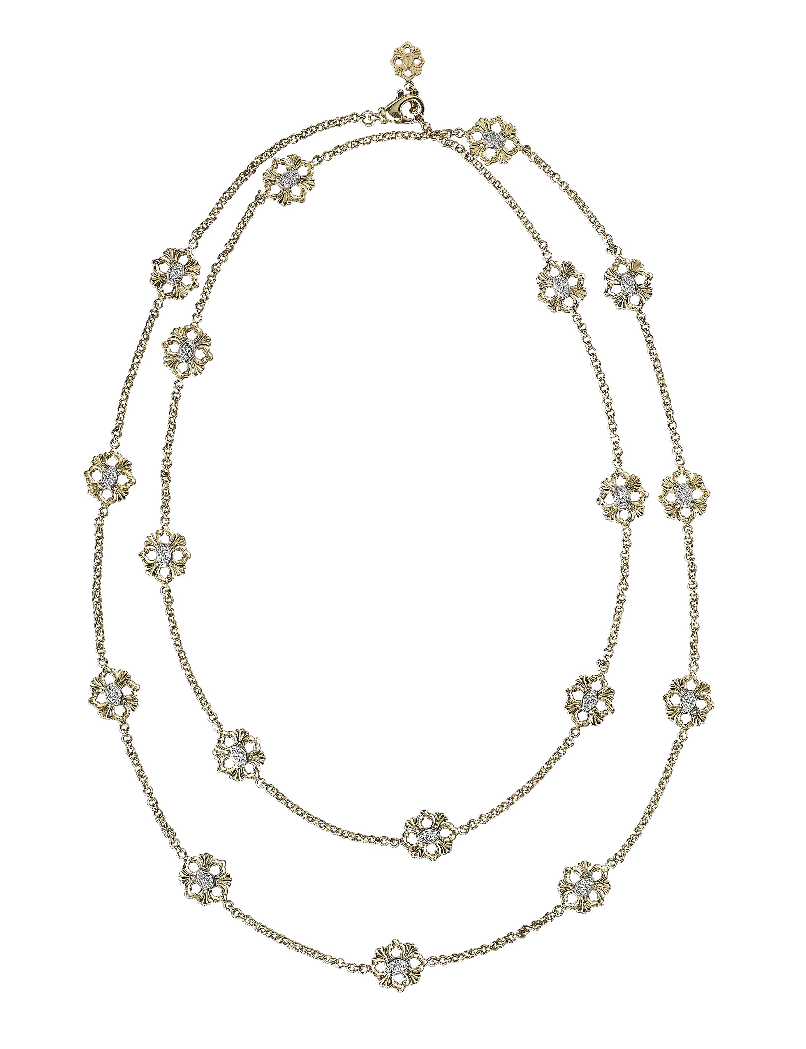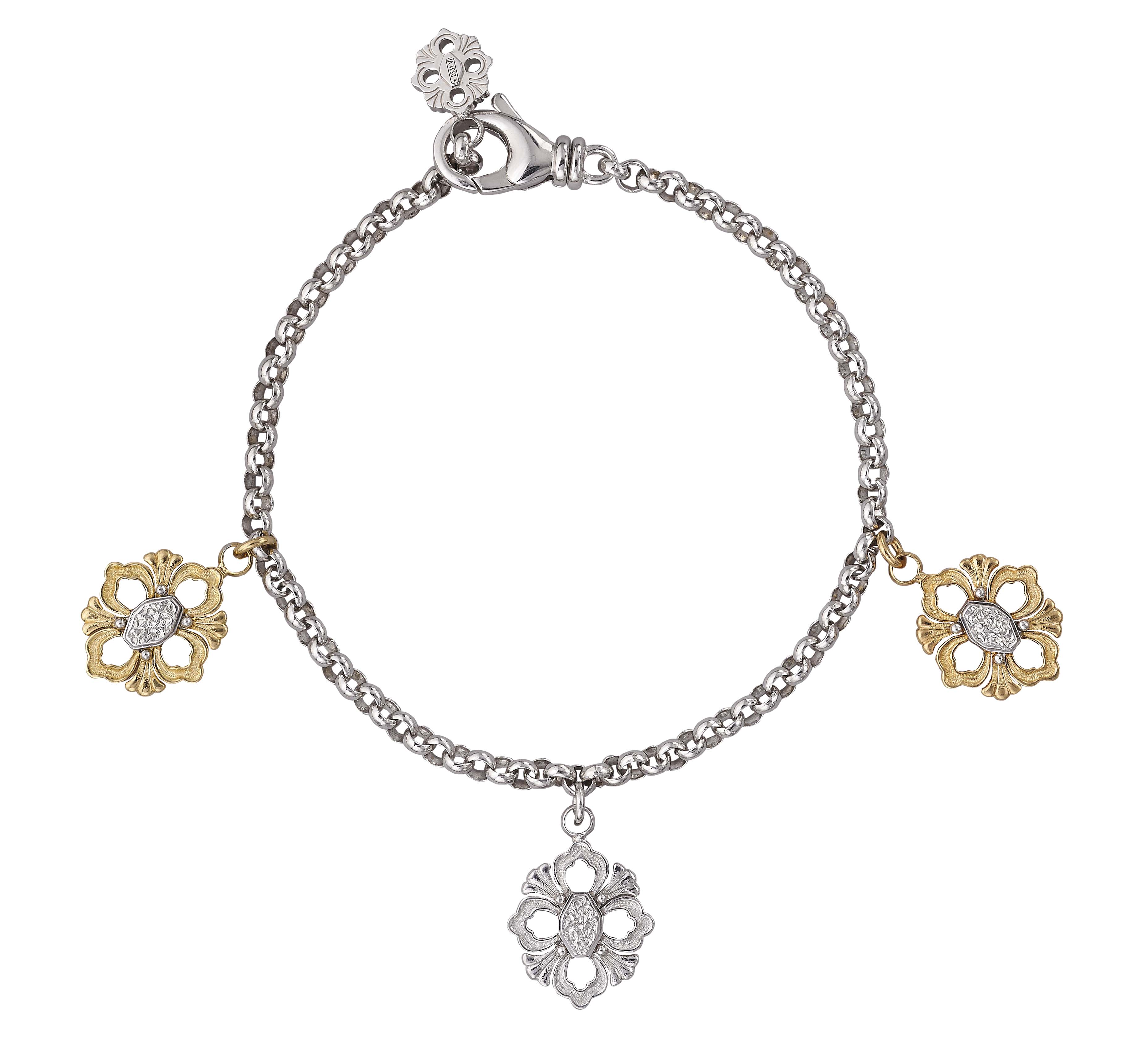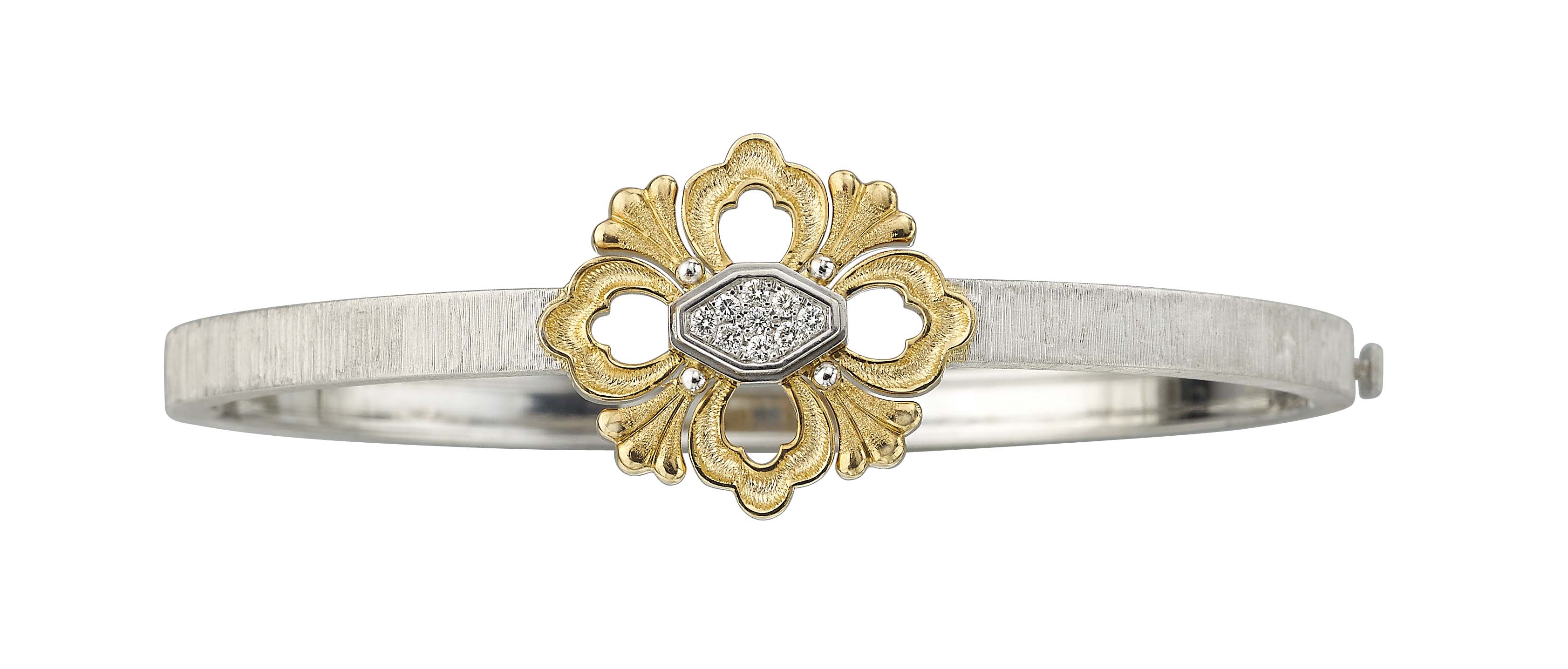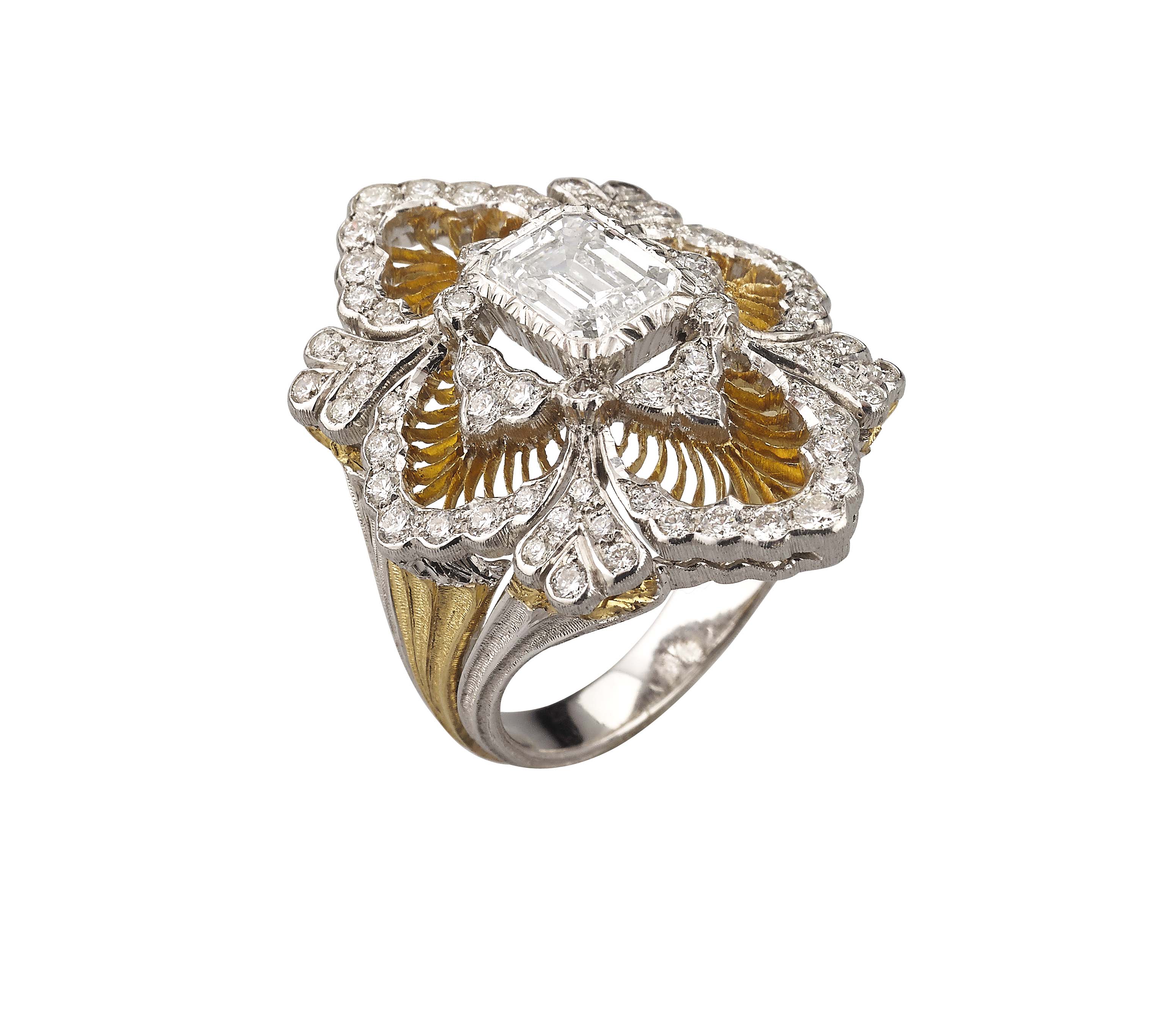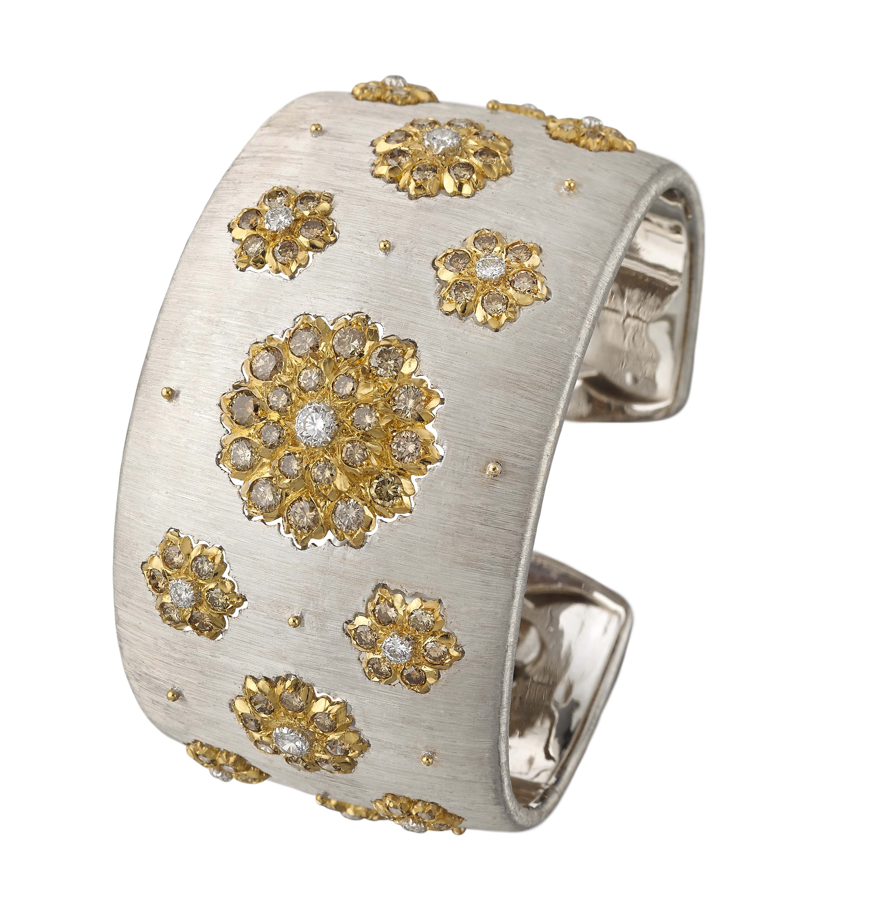 L’élément floral de la collection s’inspire du logo de la maison, qui rappelle l’aspect visuel de la coupole de l’église du San Carlino à Rome. Elle rappelle également la rosace située au-dessus de l’entrée principale du Château de Roccolo à Busca et les décorations qui surplombent les colonnes du Palais des Doges à Venise, puisant ainsi dans des courants artistiques qui sont une grande source d’inspiration pour Buccellati, du style de la Renaissance au style gothique vénitien, en passant par le néo-médiéval.