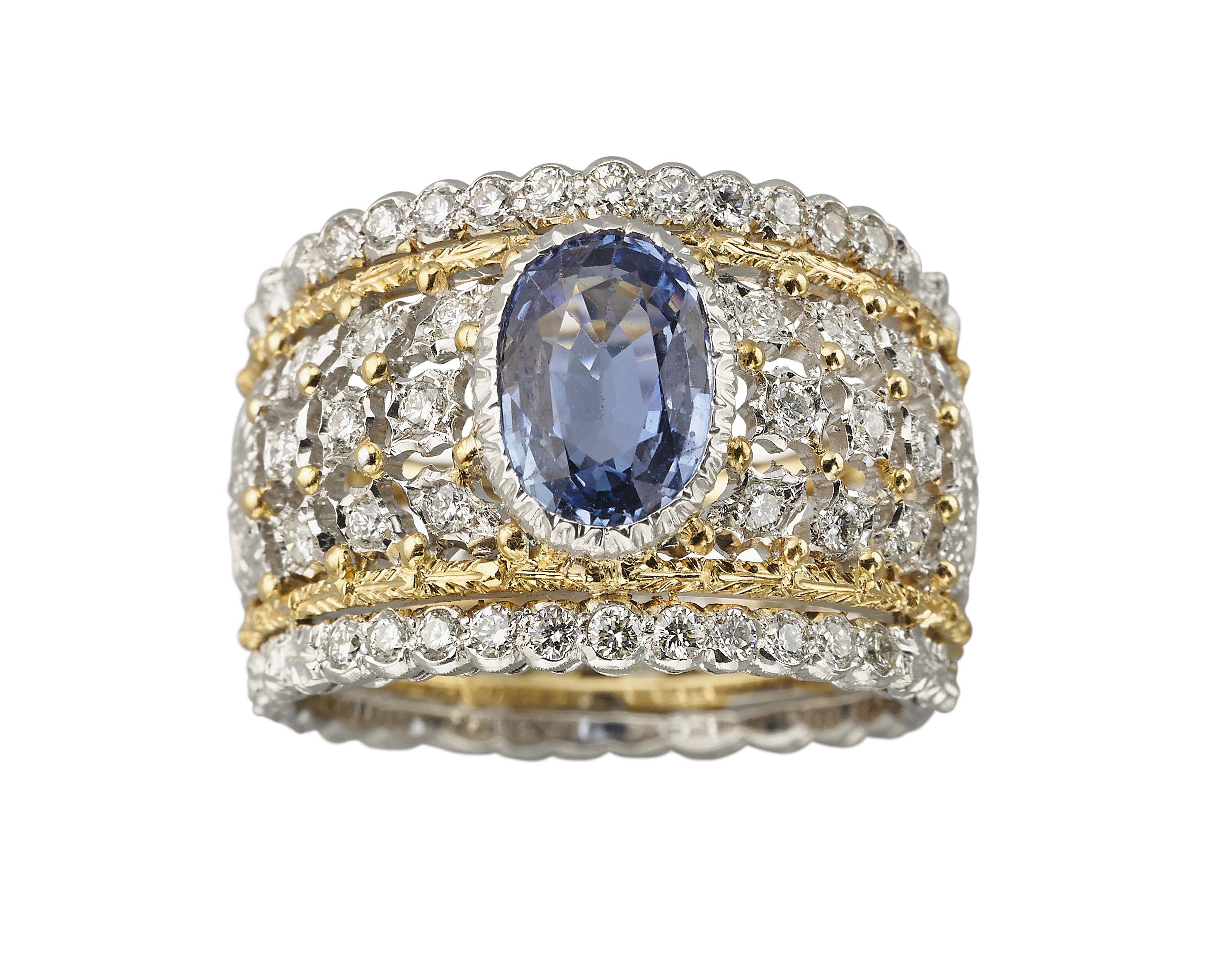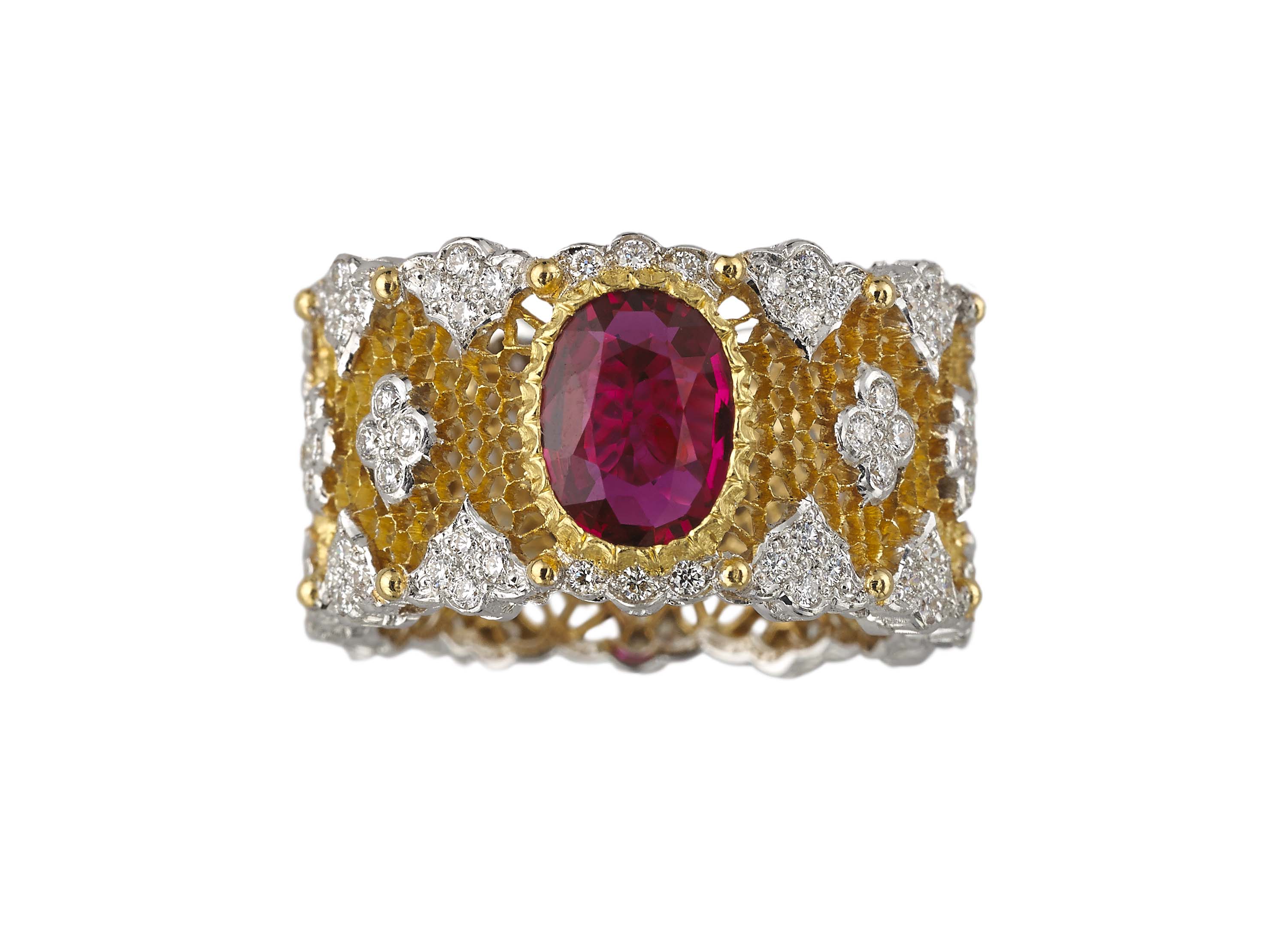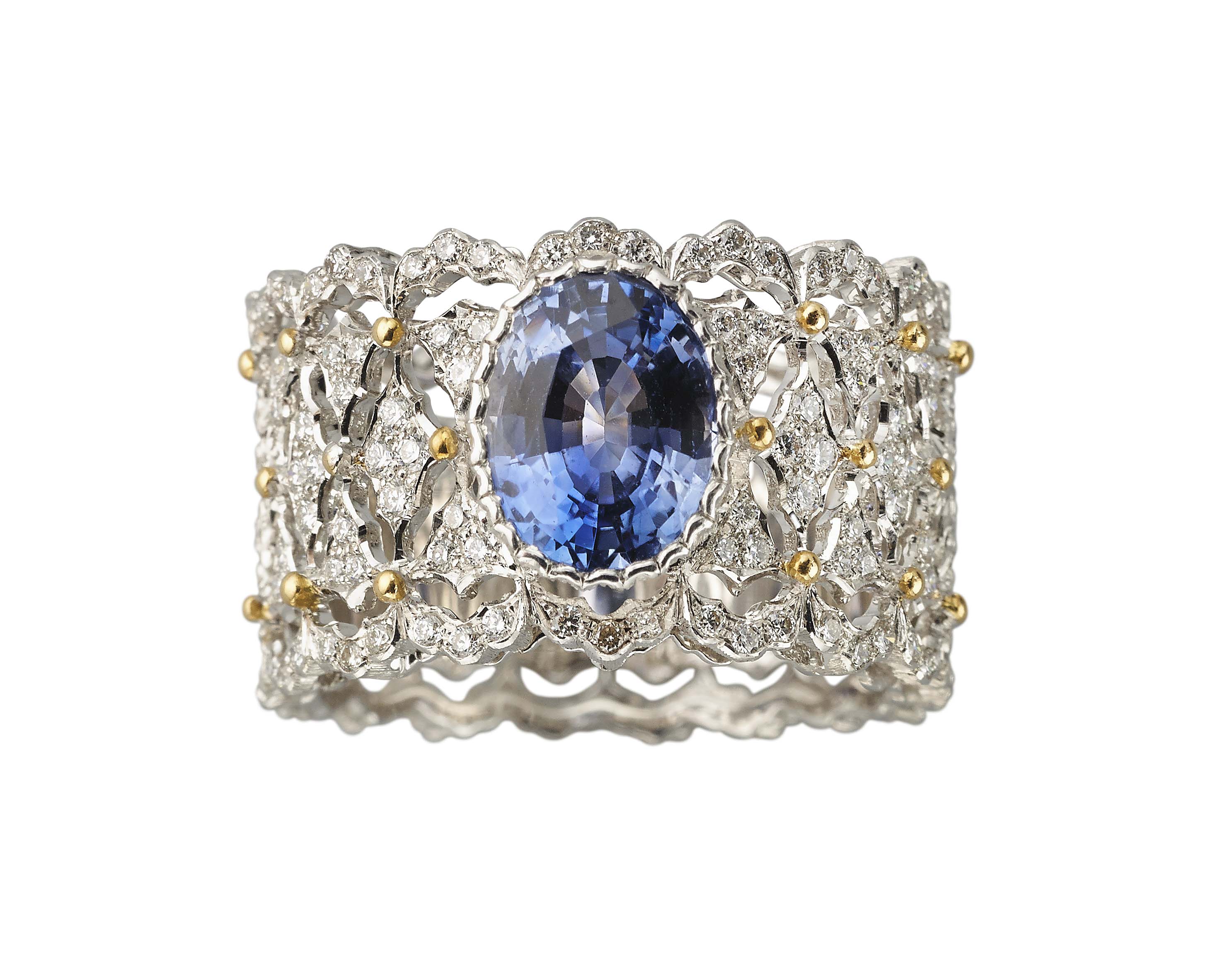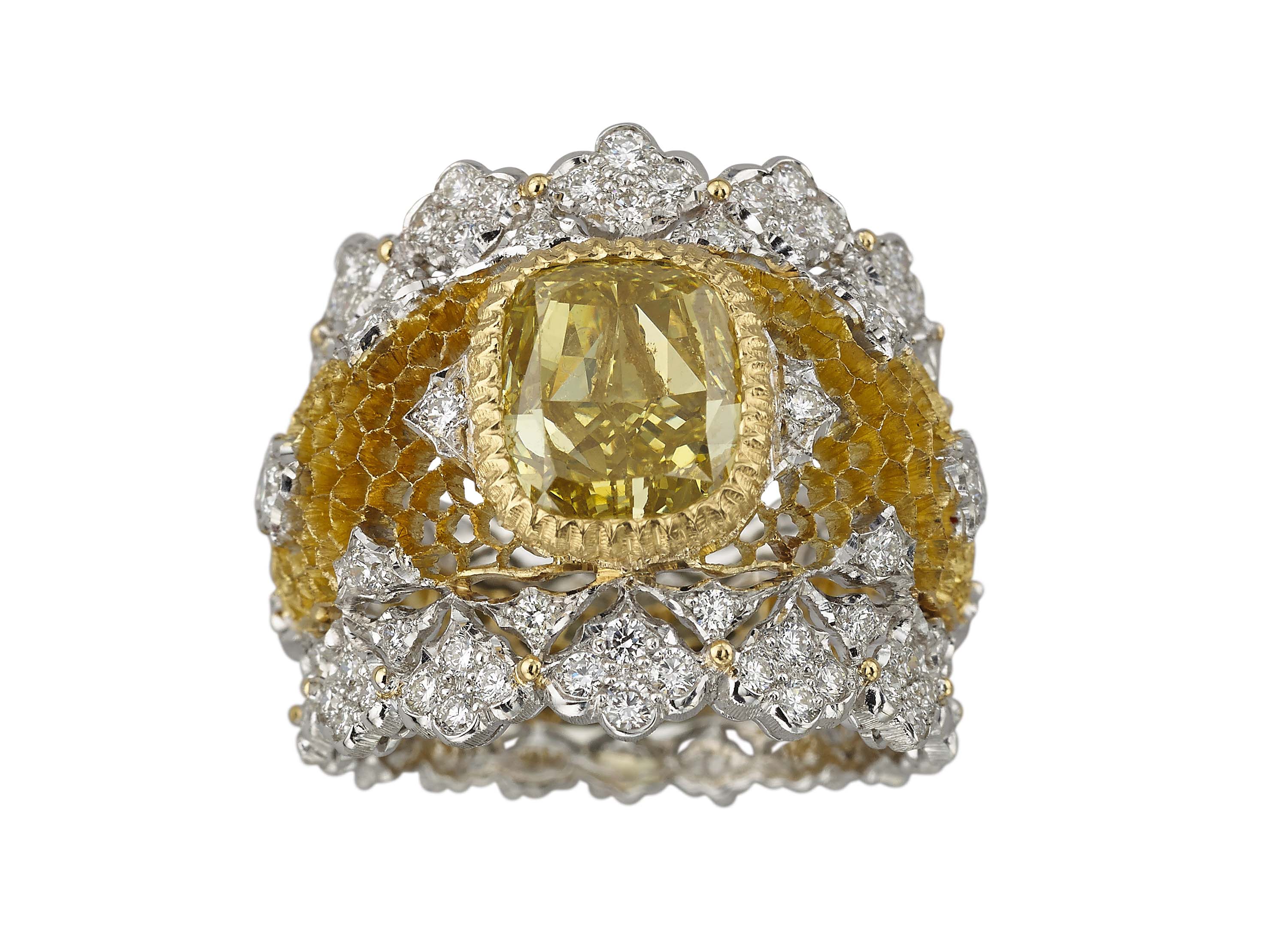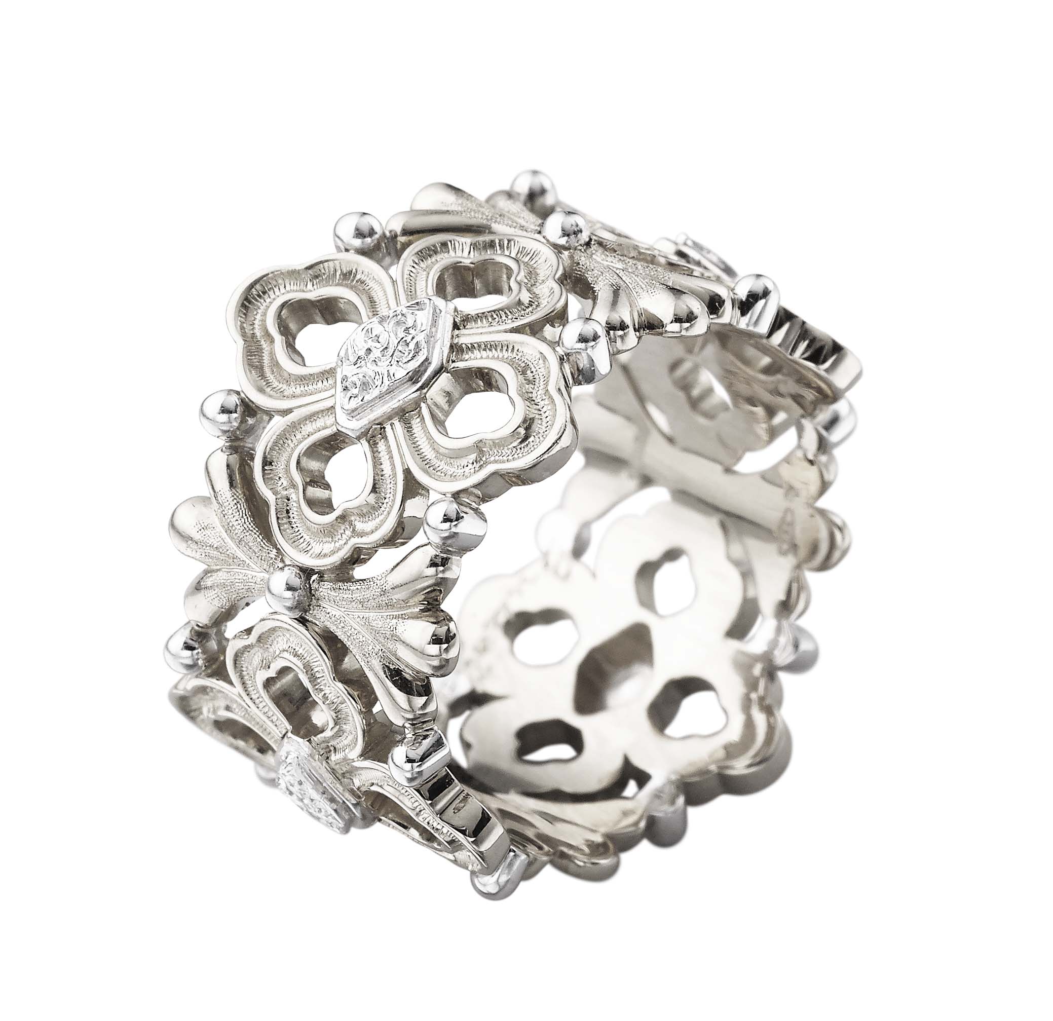 L’élément floral de la collection s’inspire du logo de la maison, qui rappelle l’aspect visuel de la coupole de l’église du San Carlino à Rome. Elle rappelle également la rosace située au-dessus de l’entrée principale du Château de Roccolo à Busca et les décorations qui surplombent les colonnes du Palais des Doges à Venise, puisant ainsi dans des courants artistiques qui sont une grande source d’inspiration pour Buccellati, du style de la Renaissance au style gothique vénitien, en passant par le néo-médiéval.