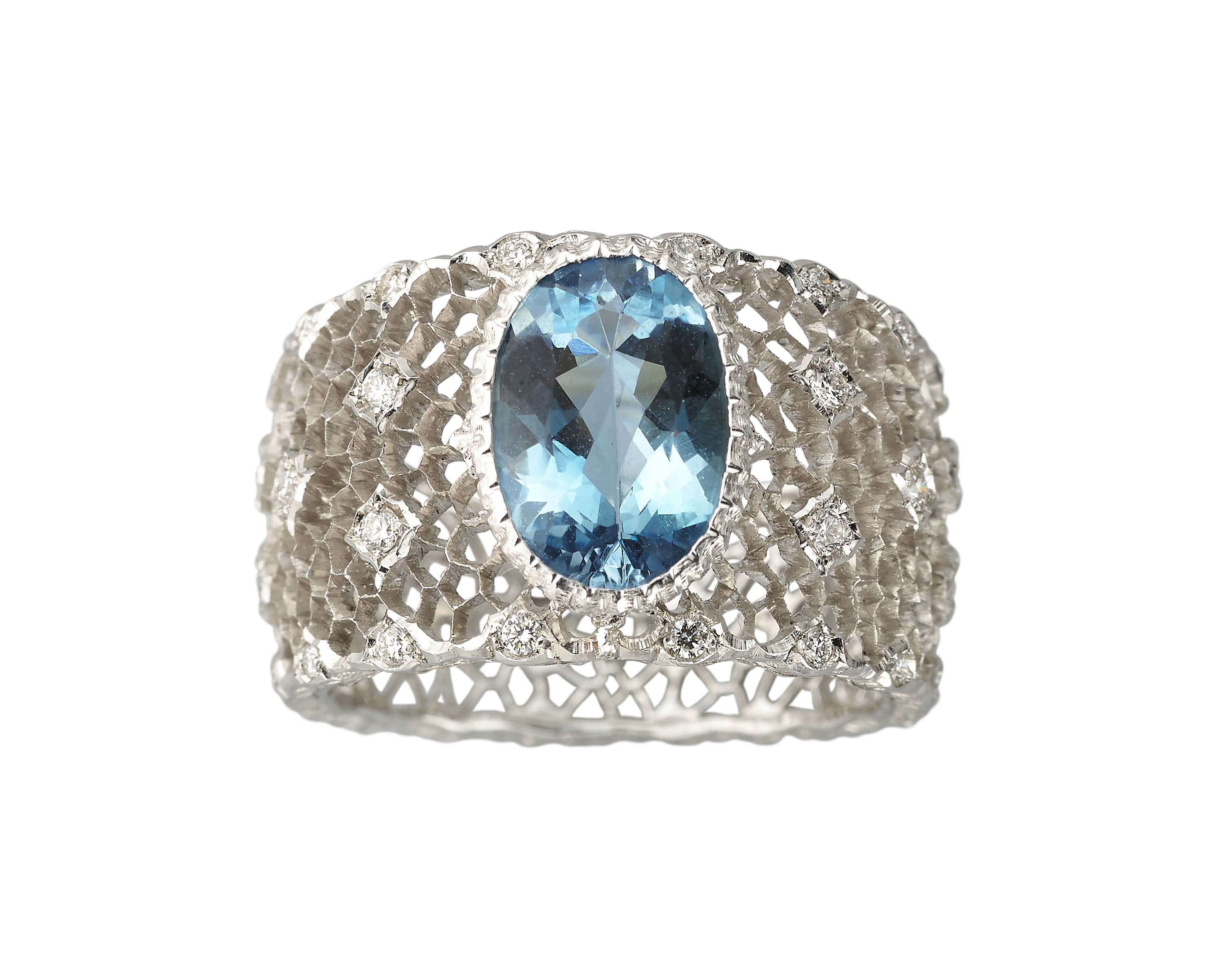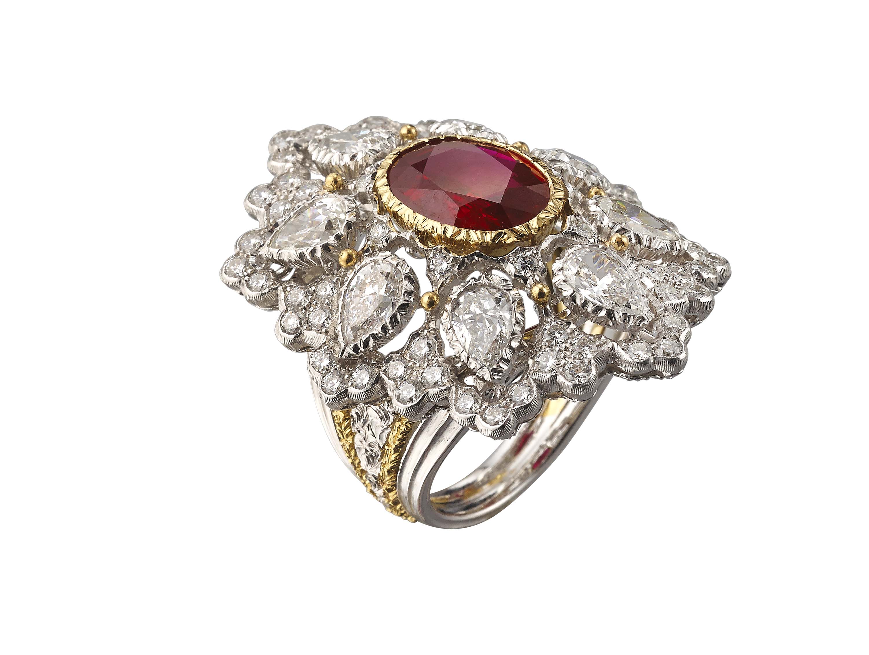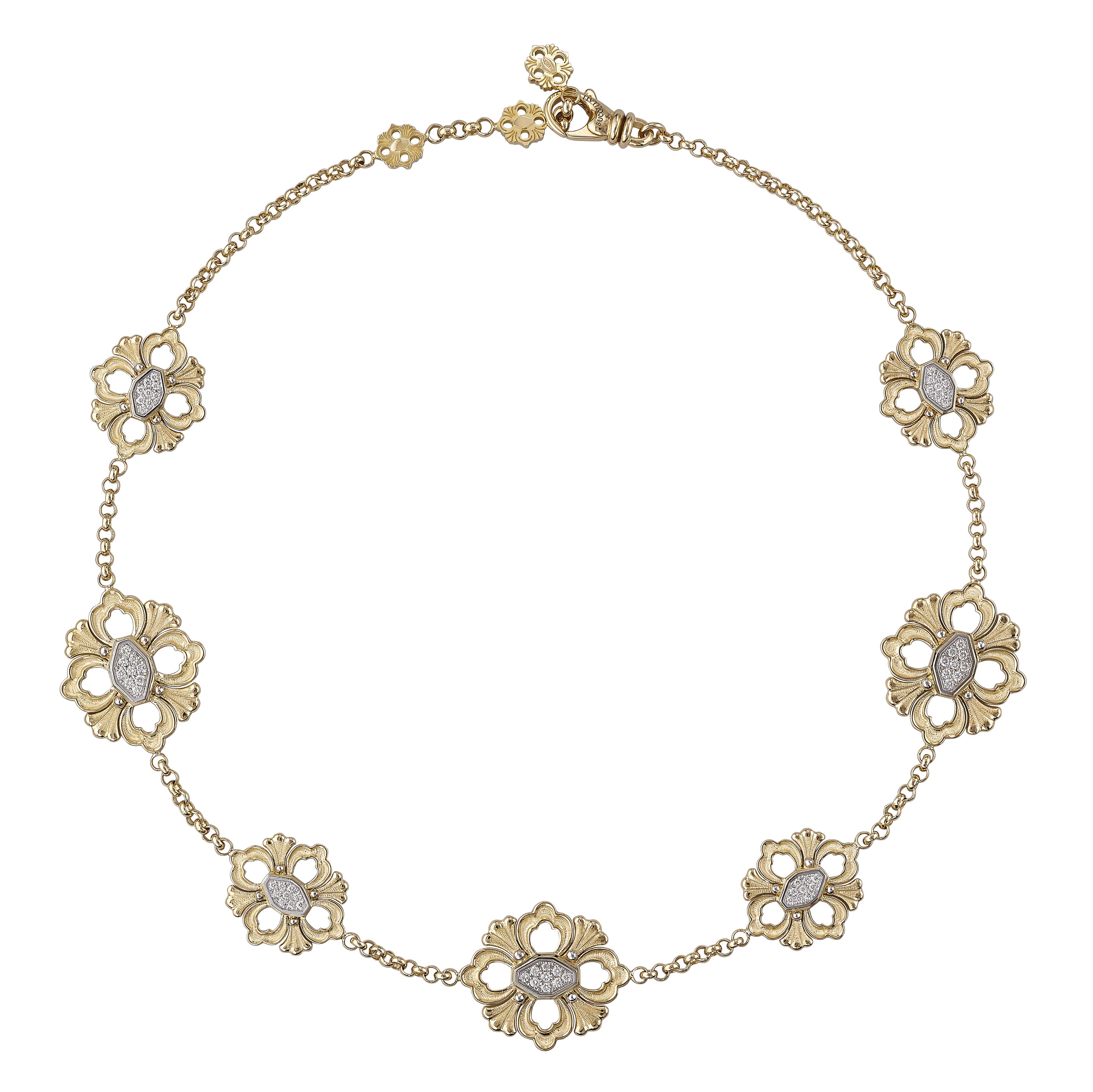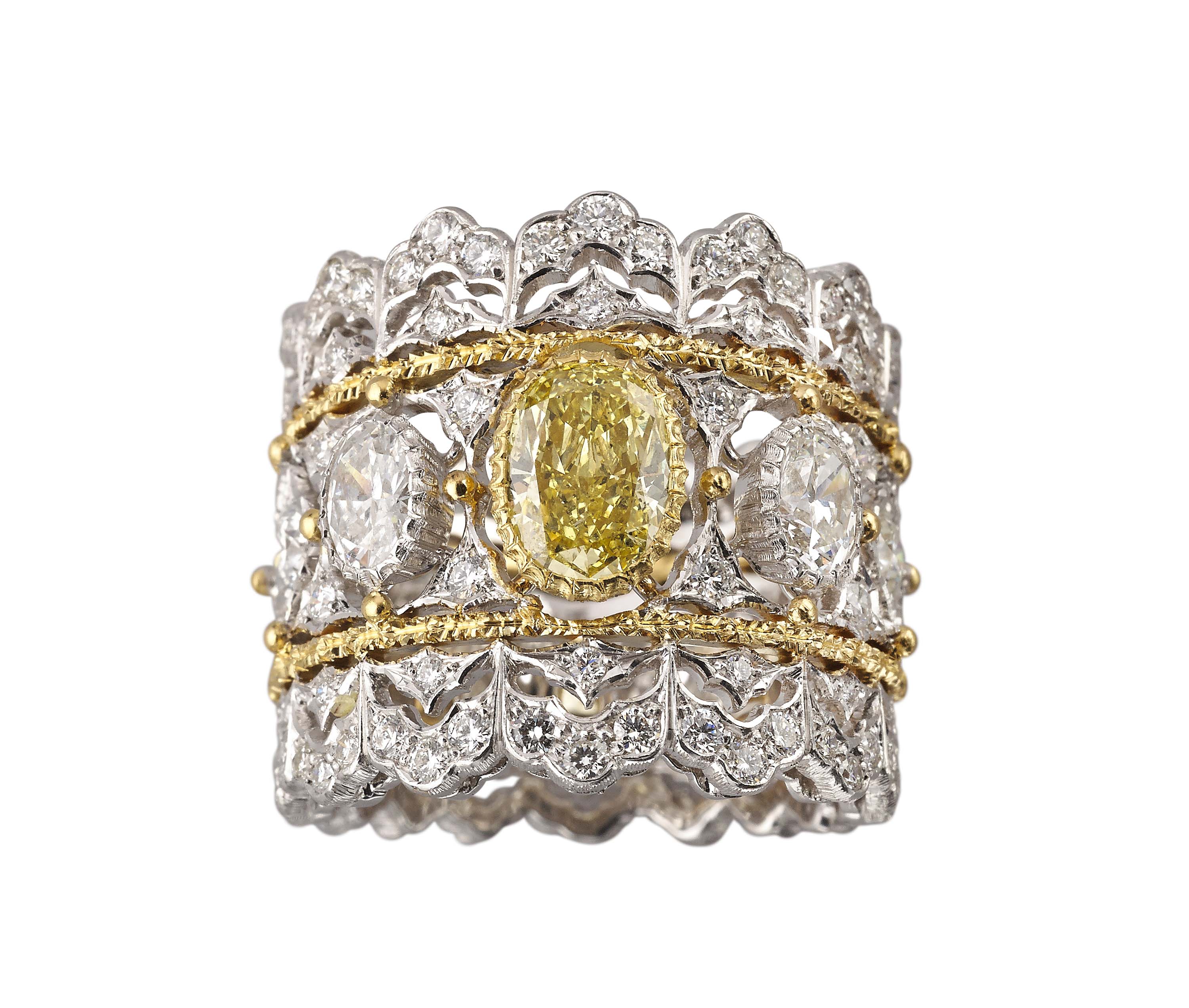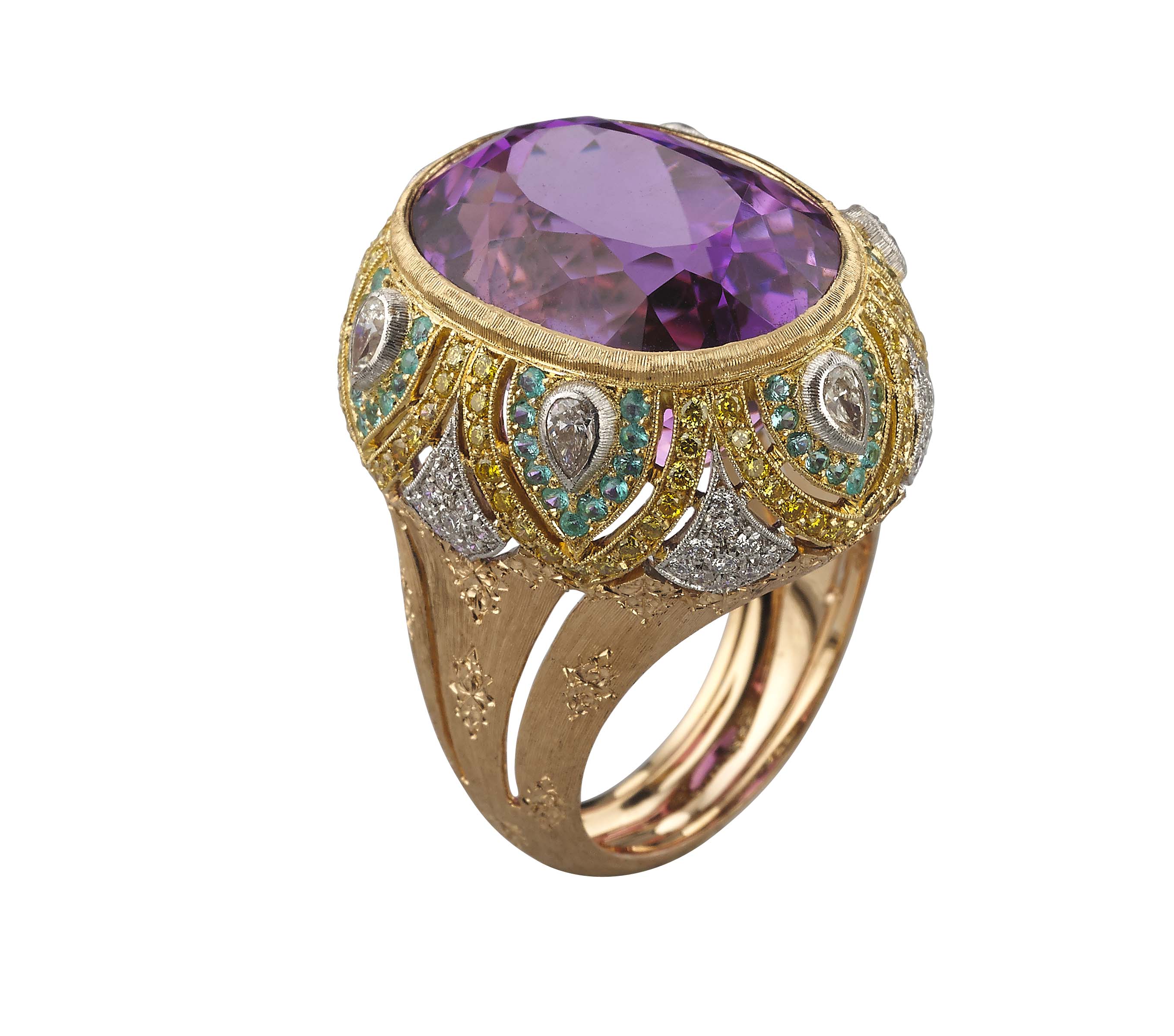 L’élément floral de la collection s’inspire du logo de la maison, qui rappelle l’aspect visuel de la coupole de l’église du San Carlino à Rome. Elle rappelle également la rosace située au-dessus de l’entrée principale du Château de Roccolo à Busca et les décorations qui surplombent les colonnes du Palais des Doges à Venise, puisant ainsi dans des courants artistiques qui sont une grande source d’inspiration pour Buccellati, du style de la Renaissance au style gothique vénitien, en passant par le néo-médiéval.