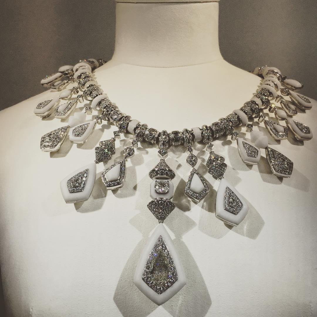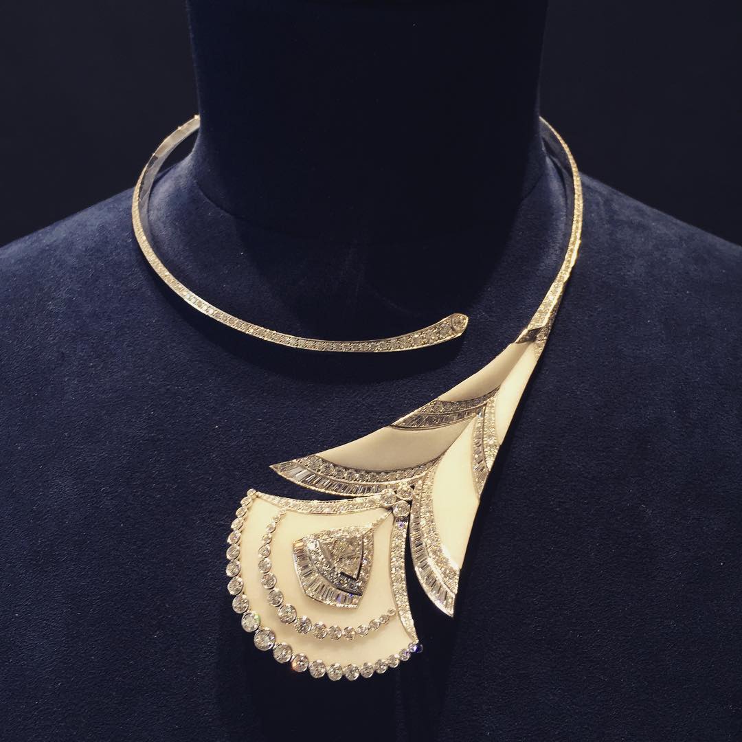 Collier Talisman, Nagaur sinspire de la ville forteresse, miracle en plein désert du Thar, dont les contours abritent de délicats palais, pavillons et jardins baignés de soleil, transcrits en éclatante blancheur joaillière.