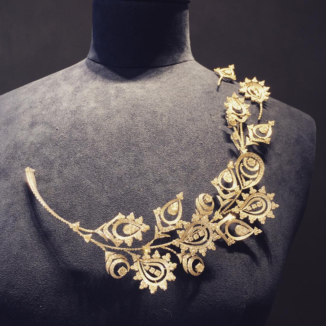 Le collier Jodhpur s’inscrit dans la tradition des grands bijoux princiers Indiens, dotés d’une doublure extrêmement travaillée.