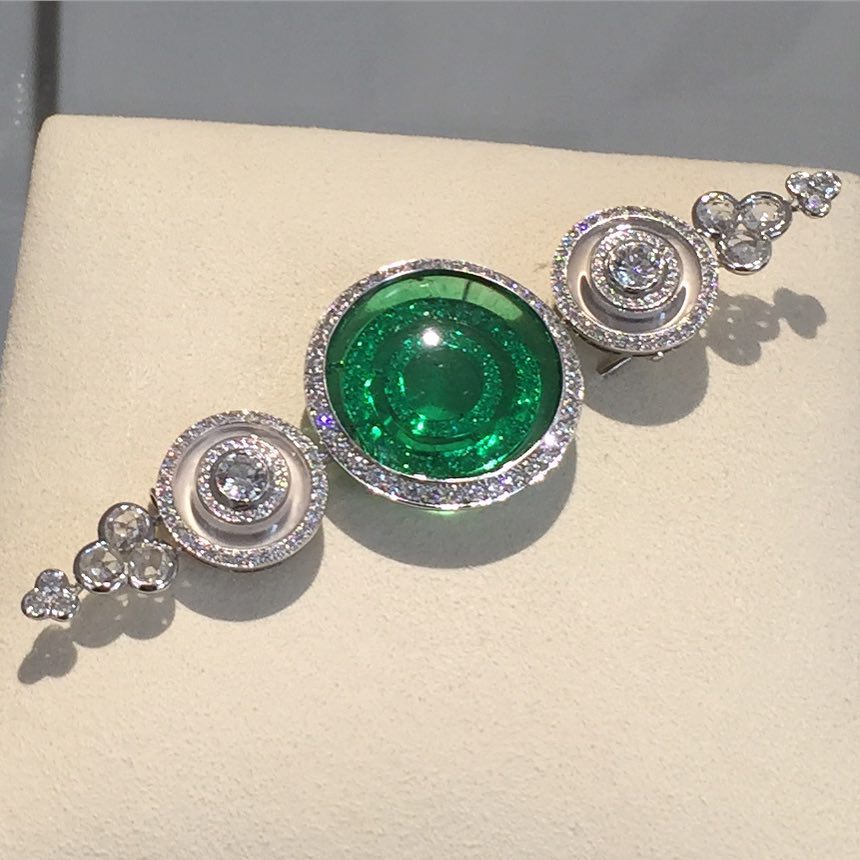- Broche Maharani, or blanc 750 ‰, diamants, cristal de roche et centre émeraude de Colombie de 19,87 cts